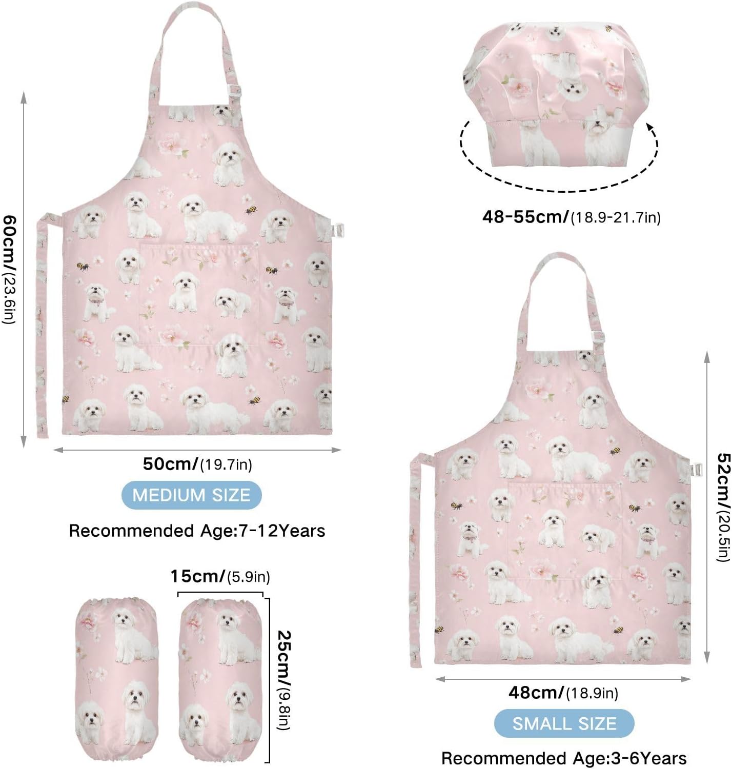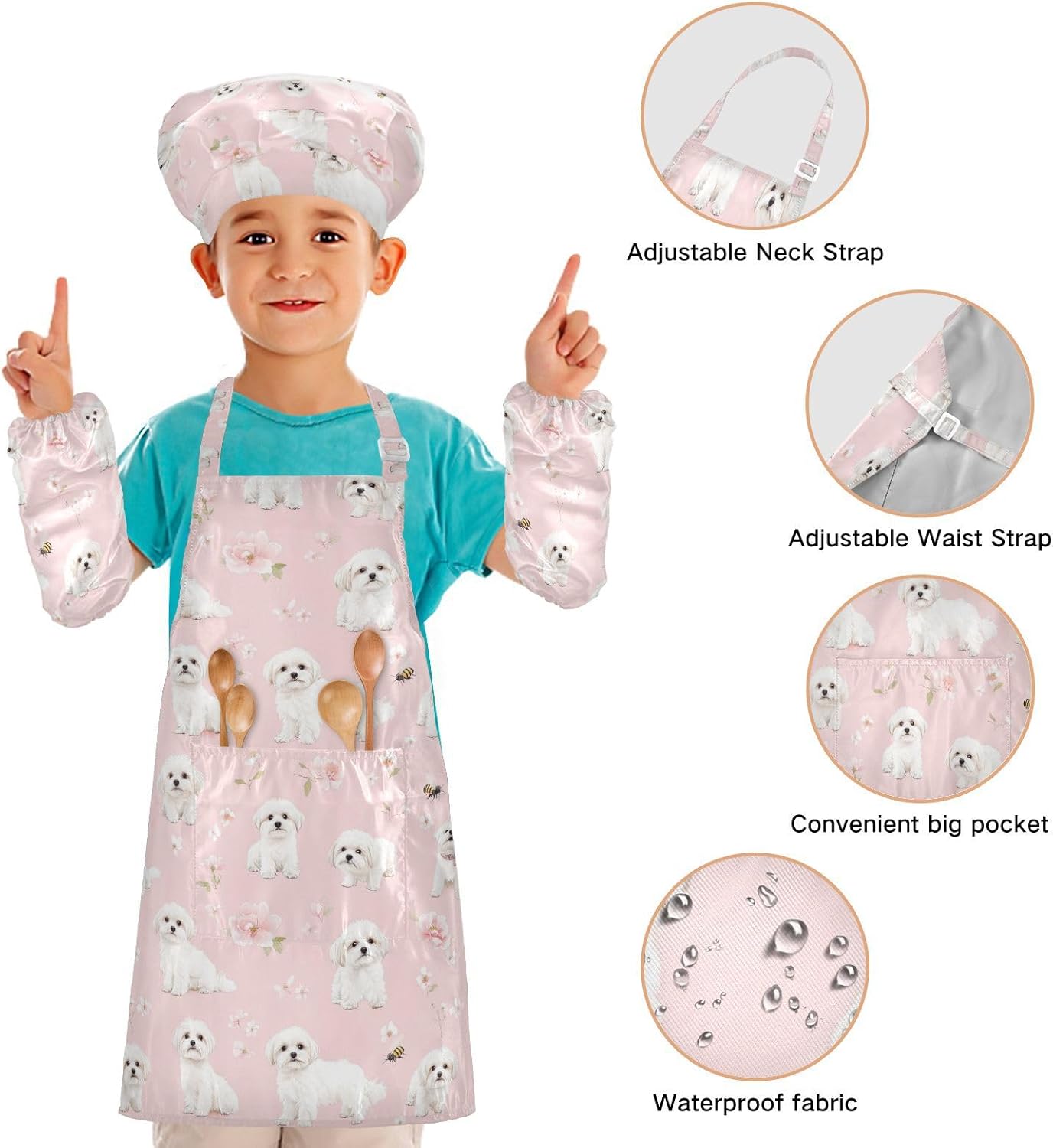 Dimensioni e articolo include: S: 18,9 x 20,5 L per bambini dai 3 ai 6 anni. M: 19,7 W x 23,5 L per età 7-12 anni. Il grembiule per bambini include 1 grembiule leggero, 1 cappello da chef e 2 maniche. Il set di grembiule per bambini può dare ai bambini una buona esperienza di utilizzo per cucinare o dipingere come fornelli o pittori professionisti. Materiale di alta qualità: i grembiuli per bambini sono realizzati in poliestere, morbido tessuto impermeabile twill 290, dando una sensazione confortevole quando si indossa. Protezione delle maniche con una grande tasca: due maniche possono proteggere i bambini da acqua, olio e pigmenti. Con grandi tasche decorative e funzionali, è comodo mettere alcuni strumenti quando si utilizza, adatto per imparare a cucinare, fare caramelle, dolci, ecc. Ampia applicazione: il cappello da chef per bambini è adatto per l'insegnamento della pittura e l'insegnamento della cucina, può essere applicato anche per corsi d'arte, costumi di Halloween, oggetti di scena teatrali, feste di compleanno e le belle attività della decorazione per feste a tema. Facile da pulire: il nostro prodotto è impermeabile e a prova di fuoriuscite. Basta strofinare, lavare in lavatrice e lavare a mano.