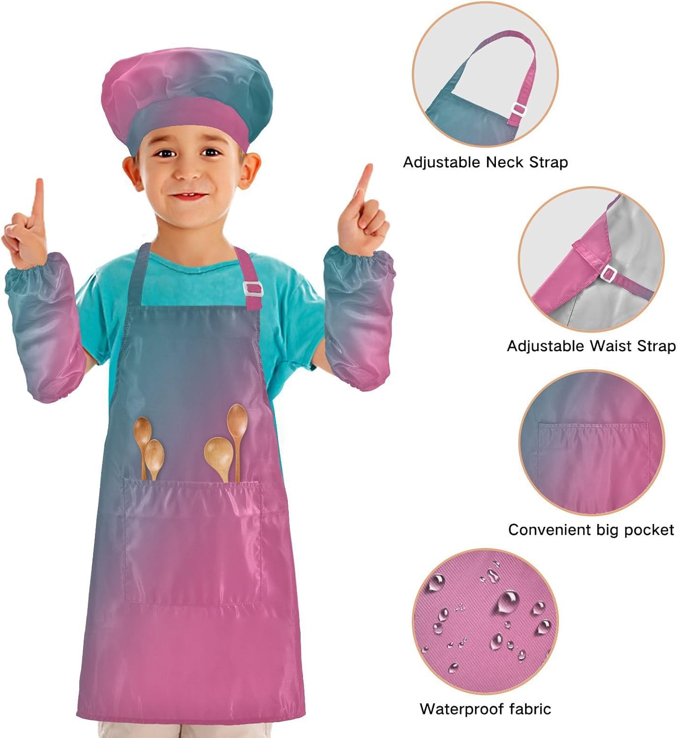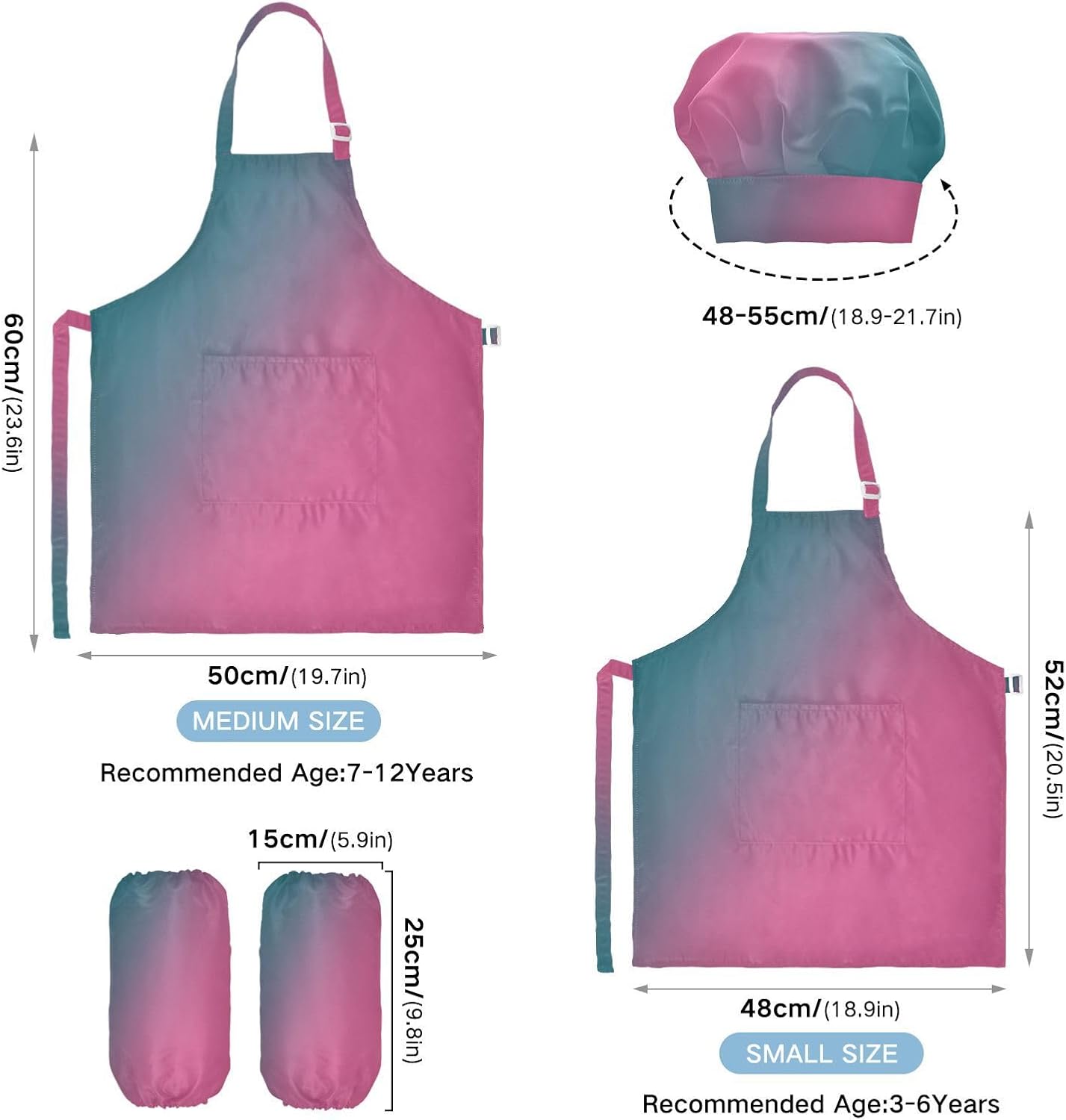 Taglia disponibile: S: 48 x 52 cm, per bambini dai 3 ai 6 anni. M: 50 x 59,7 cm, per bambini dai 7 ai 12 anni. Le taglie di cappelli e maniche condividono le stesse dimensioni. Cappello: 48-55 cm. Maniche: 15 x 24,9 cm. Materiale ecologico: il tessuto è impermeabile, leggero, accogliente, stampa adorabile alla moda, ecologico per la pelle dei bambini. Cinghia regolabile: il collo lungo e le cinghie in vita sono regolabili. È possibile regolare la cinghia in base alla lunghezza che i bambini si sentono a proprio agio per attività o vestirsi Inoltre, la cinghia regolabile può fornire abbastanza spazio per i bambini da indossare o togliere. Applicazioni versatili: ideale per i bambini per proteggere i vestiti durante la cottura, il giardinaggio, la cottura, il gioco, la produzione di caramelle, la cottura di torte, tele, arti e mestieri, lezioni in classe, faccende domestiche. Può anche essere una grande decorazione per costumi di Halloween, oggetti di scena teatrali, feste di compleanno, eventi carini, feste a tema, riunioni di famiglia e molto altro ancora. Facile da pulire: il nostro prodotto è impermeabile e a prova di fuoriuscite. Basta strofinare, lavare in lavatrice e lavare a mano.