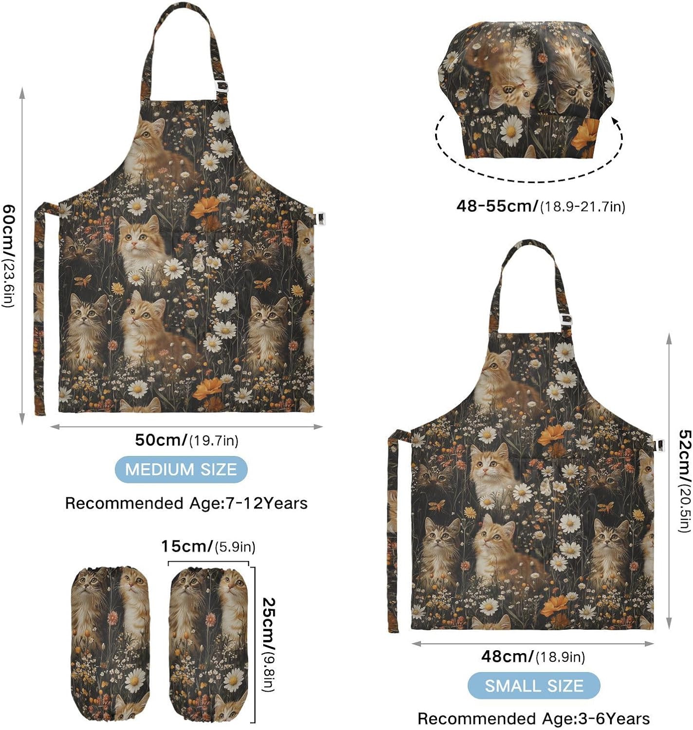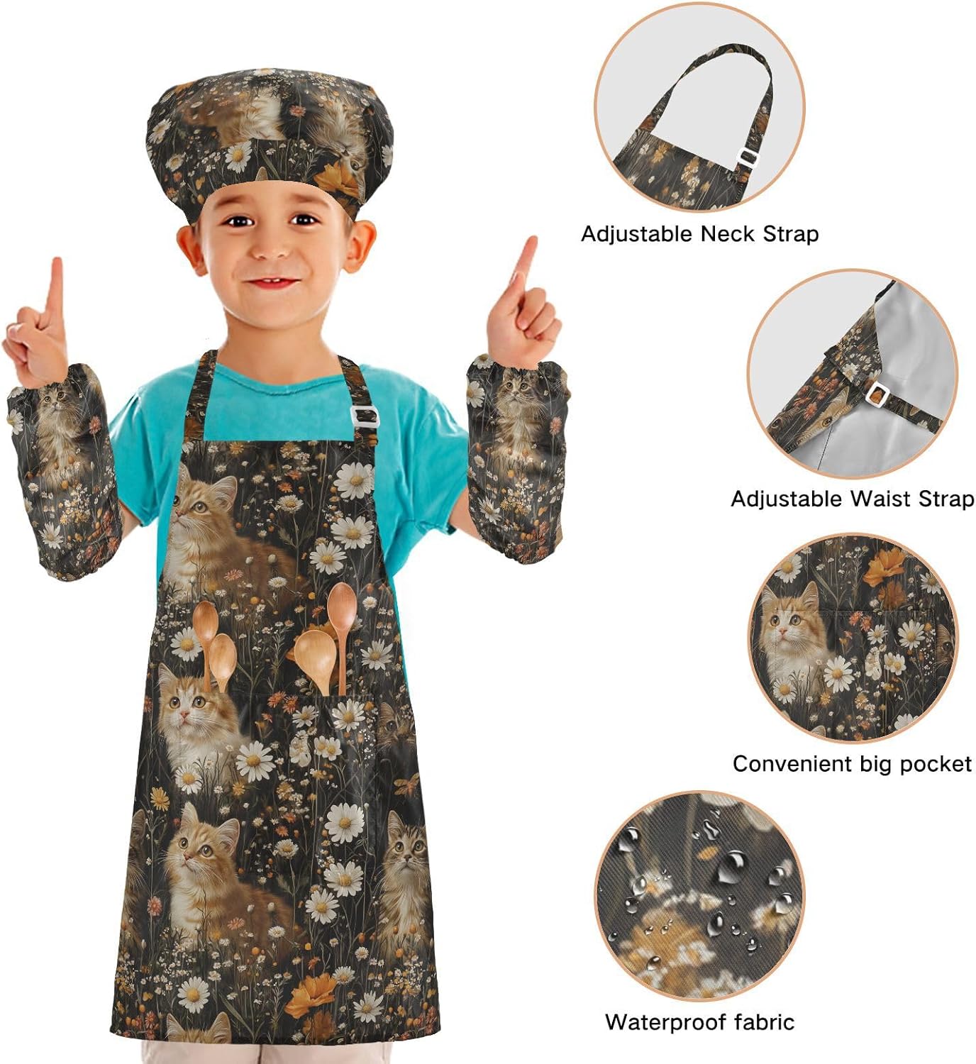 Dimensioni consigliate: S: 48 x 52 cm (età 3-6 anni). M: 50 x 59,7 cm (7-12 anni). La taglia può adattarsi alla maggior parte dei ragazzi e delle ragazze. Si prega di scegliere la taglia giusta in base alle dimensioni specifiche. Materiale ecologico: il tessuto è impermeabile, leggero, accogliente, stampa adorabile alla moda, ecologico per la pelle dei bambini. Cinghia regolabile: il collo lungo e le cinghie in vita sono regolabili. È possibile regolare la cinghia in base alla lunghezza che i bambini si sentono a proprio agio per attività o vestirsi Inoltre, la cinghia regolabile può fornire abbastanza spazio per i bambini da indossare o togliere. Multiuso: il cappello da chef per bambini non può essere indossato per pittura, cucina, giardinaggio, lavaggio dei piatti, feste, arte, artigianato e attività scolastiche, ma anche per Natale, Ringraziamento, Halloween, San Patrizio, Capodanno, festa dei bambini, festival, vacanze, cene, compleanni e riunioni di famiglia. L'articolo include: il grembiule per bambini include 1 grembiule leggero, 1 cappello da chef e 2 maniche. Il grembiule da cucina per bambini può dare ai bambini una buona esperienza di utilizzo per cucinare o dipingere come fornelli o pittori professionisti.