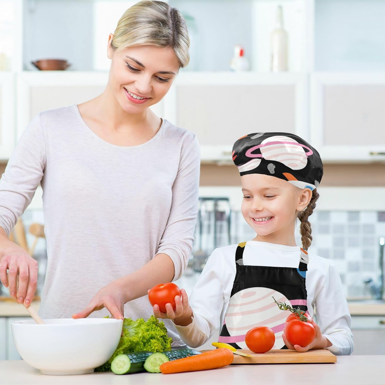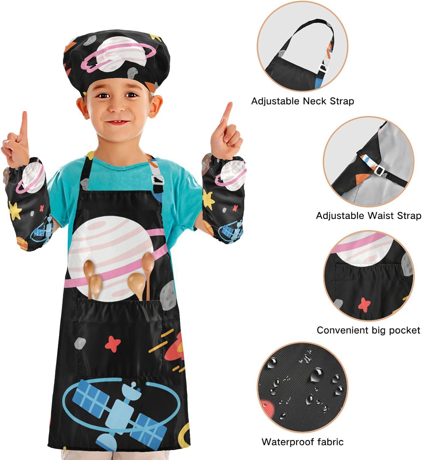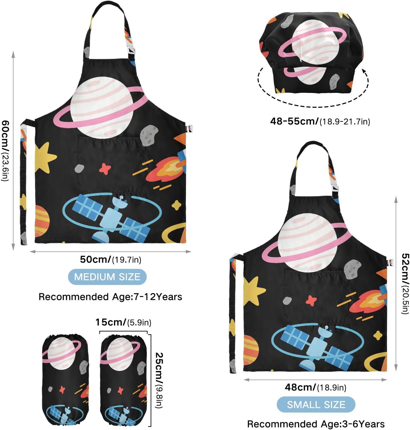 Taglia disponibile: S: 48 x 52 cm, per bambini dai 3 ai 6 anni. M: 50 x 59,7 cm, per bambini dai 7 ai 12 anni. Le taglie di cappelli e maniche condividono le stesse dimensioni. Cappello: 48-55 cm. Maniche: 15 x 24,9 cm. Materiale ecologico: il tessuto è impermeabile, leggero, accogliente, stampa adorabile alla moda, ecologico per la pelle dei bambini. Protezione delle maniche con una grande tasca: due maniche possono proteggere i bambini da acqua, olio e pigmenti. Con grandi tasche decorative e funzionali, è comodo mettere alcuni strumenti quando si utilizza, adatto per imparare a cucinare, fare caramelle, dolci, ecc. Multiuso: i grembiuli per bambini non possono essere indossati per pittura, cucina, giardinaggio, lavaggio dei piatti, feste, arte, artigianato e attività scolastiche, ma anche per Natale, Ringraziamento, Halloween, San Patrizio, Capodanno, festa dei bambini, festival, vacanze, cene, compleanni e riunioni di famiglia. L'articolo include: il set da cucina per bambini da 3 include 1 grembiule leggero, 1 cappello da chef e 2 maniche. Il set di grembiuli per bambini può dare ai bambini una buona esperienza di utilizzo per cucinare o dipingere come fornelli o pittori professionisti.