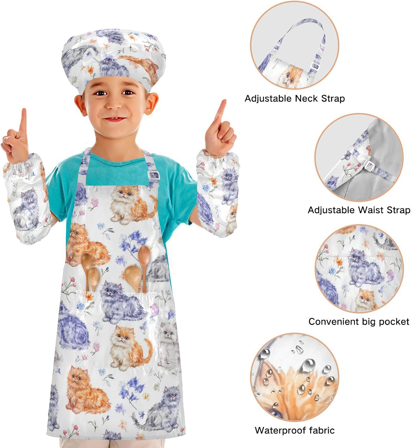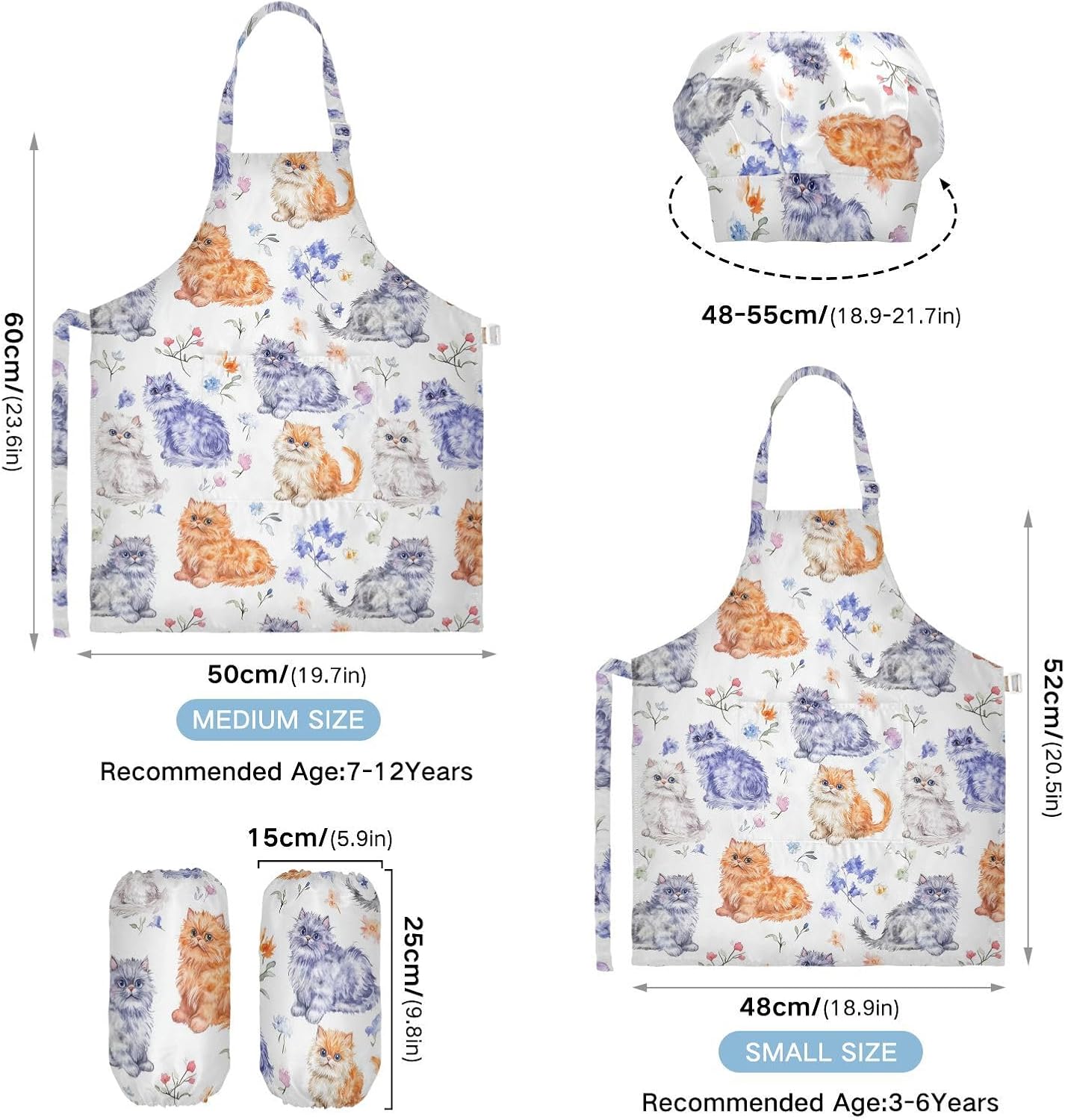 Taglia disponibile: S: 48 x 52 cm, per bambini dai 3 ai 6 anni. M: 50 x 59,7 cm, per bambini dai 7 ai 12 anni. Le taglie di cappelli e maniche condividono le stesse dimensioni. Cappello: 48-55 cm. Maniche: 15 x 24,9 cm. Materiale ecologico: il tessuto è impermeabile, leggero, accogliente, stampa adorabile alla moda, ecologico per la pelle dei bambini. Impermeabile Caratteristica: Realizzato in poliestere, il set da cucina per bambini da 3 pezzi è impermeabile. I bambini possono sentirsi liberi di imparare a cucinare e dipingere come preferiscono e possono mantenere i loro vestiti puliti allo stesso tempo. Applicazioni versatili: ideale per i bambini per proteggere i vestiti durante la cottura, il giardinaggio, la cottura, il gioco, la produzione di caramelle, la cottura di torte, tele, arti e mestieri, lezioni in classe, faccende domestiche. Può anche essere una grande decorazione per costumi di Halloween, oggetti di scena teatrali, feste di compleanno, eventi carini, feste a tema, riunioni di famiglia e molto altro ancora. L'articolo include: il cappello da chef per bambini include 1 grembiule leggero, 1 cappello da chef e 2 maniche. Il set di grembiuli per bambini può dare ai bambini una buona esperienza di utilizzo per cucinare o dipingere come fornelli o pittori professionisti.