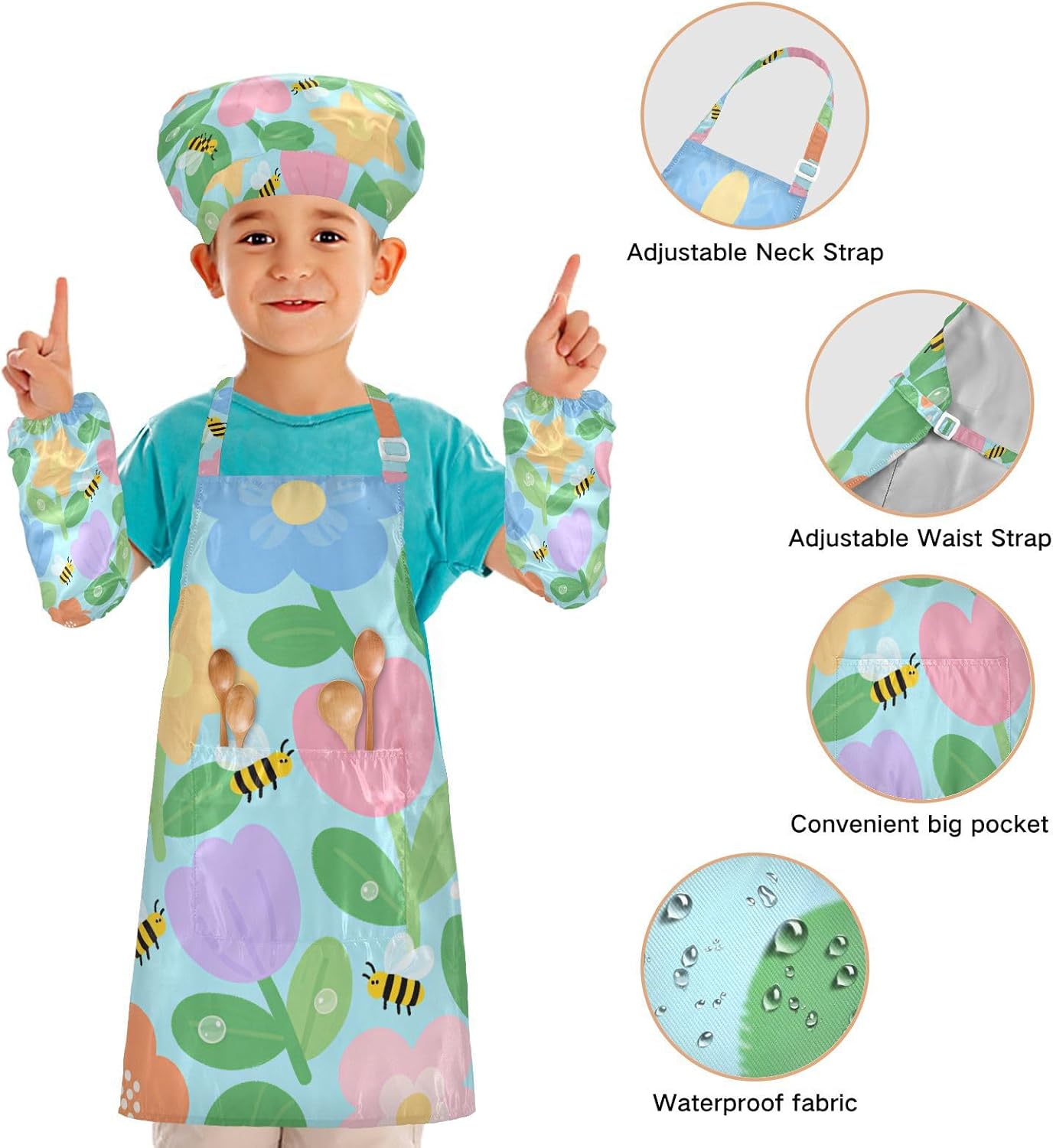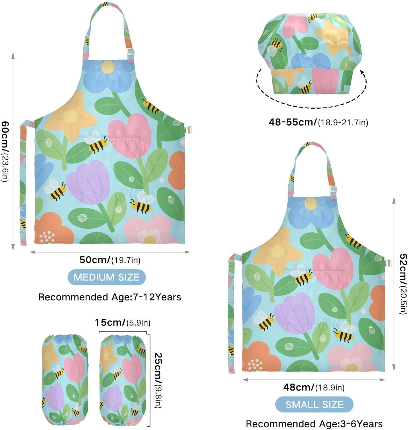 Dimensioni e articolo include: S: 18,9 x 20,5 L per bambini dai 3 ai 6 anni. M: 19,7 W x 23,5 L per età 7-12 anni. Il grembiule per bambini include 1 grembiule leggero, 1 cappello da chef e 2 maniche. I grembiuli per bambini possono dare ai bambini una buona esperienza di utilizzo per cucinare o dipingere come fornelli o pittori professionisti. Tessuto comodo: il {parola chiave} è realizzato in tessuto di poliestere di alta qualità, morbido, ecologico, impermeabile, a prova di fuoriuscite e, processo di stampa squisito brillante. Cinghia regolabile: i grembiuli per bambini con collo regolabile e cinturino in vita possono fornire ai bambini una buona esperienza di utilizzo. Non devi preoccuparti se il grembiule per bambini si adatta a loro o meno. Applicazioni versatili: ideale per i bambini per proteggere i vestiti durante la cottura, il giardinaggio, la cottura, il gioco, la produzione di caramelle, la cottura di torte, tele, arti e mestieri, lezioni in classe, faccende domestiche. Può anche essere una grande decorazione per costumi di Halloween, oggetti di scena teatrali, feste di compleanno, eventi carini, feste a tema, riunioni di famiglia e molto altro ancora. Facile da pulire: il nostro prodotto è impermeabile e a prova di fuoriuscite. Basta strofinare, lavare in lavatrice e lavare a mano.