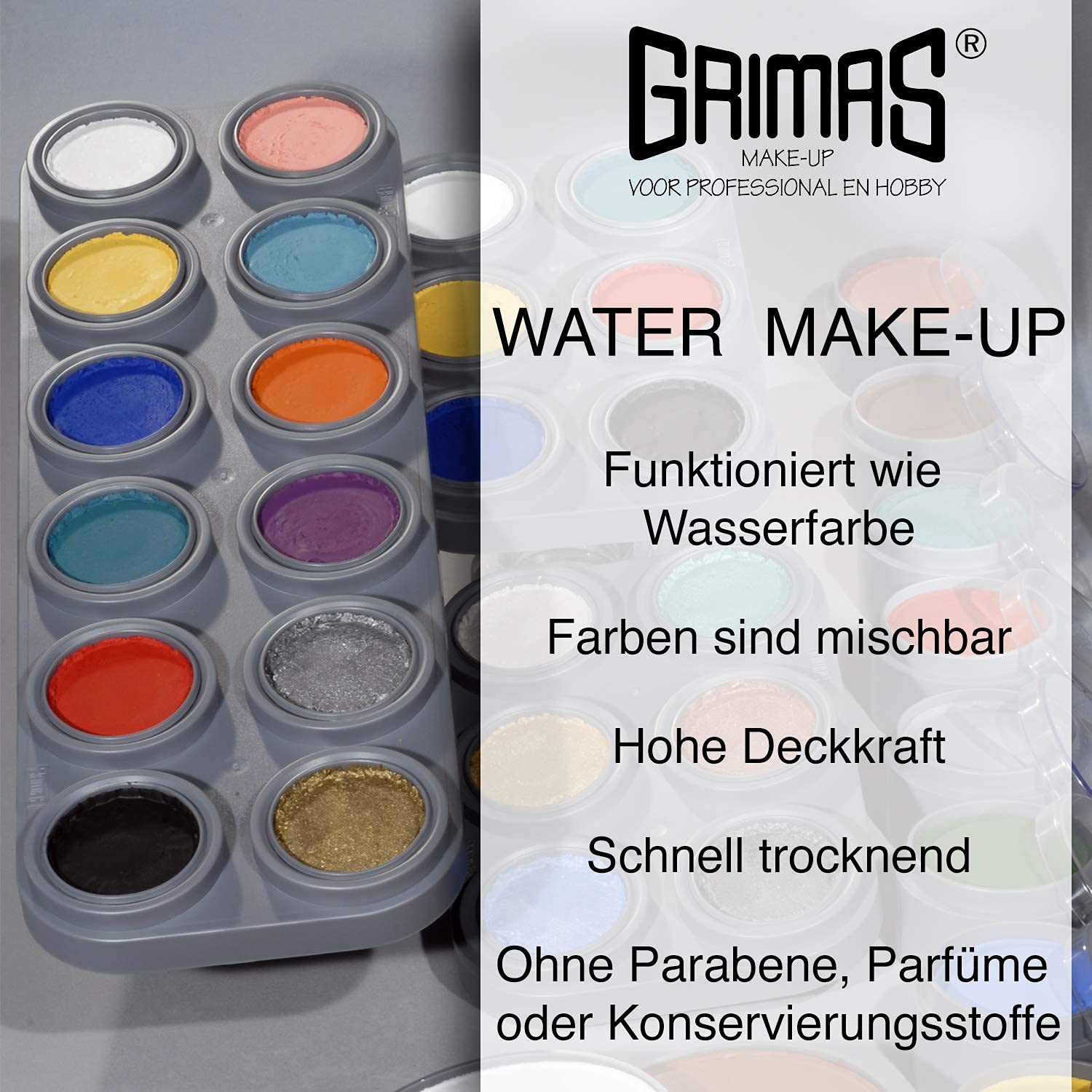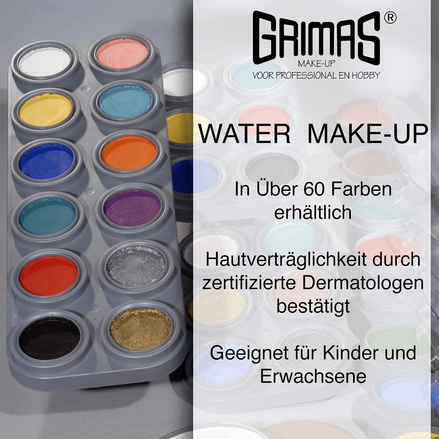 【ALTA QUALITÀ】Grimas Water-Make-Up è un trucco di altissima qualità, a prova di sbavature per tutte le età, occasioni e tipi di pelle. Il trucco è altamente pigmentato ed è realizzato utilizzando i migliori materiali. Viene utilizzato in particolare nelle produzioni cinematografiche, fotografiche e teatrali, ma ovviamente può essere utilizzato anche per carnevale, Halloween, truccabimbi, ecc. La solubilità in acqua rende anche il trucco estremamente economico: puoi dipingere circa 30 volti con una bomboletta da 15 ml! Il trucco può essere rimosso altrettanto facilmente con acqua e sapone. 【PURO】Grimas attribuisce grande importanza all'eccellente qualità del prodotto. Il reintegro dell'acqua non contiene conservanti chimici ed è privo di composti organoalogenati. Come tutti i prodotti Grimas, è senza glutine e senza profumo. Grimas non ha mai e non testerà mai i suoi prodotti sugli animali in futuro. 【LUNGA DURATA】Come molti altri prodotti GRIMAS, il trucco dell'acqua è estremamente duraturo. Una volta aperta, puoi utilizzare una bomboletta per 36 mesi 【CON SPUGNA】 Con la spugna professionale per il trucco inclusa, il trucco può essere applicato rapidamente e facilmente su ampie aree