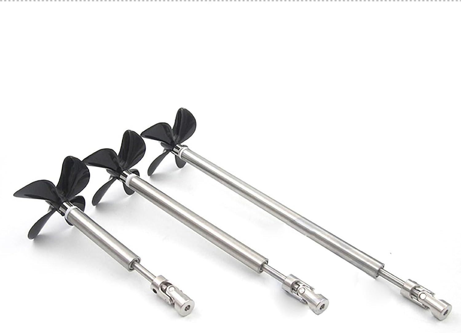 Include un albero da 4 mm, un'pagaia a quattro pale, un giunto universale, una chiave inglese e elementi di fissaggio. Realizzato in acciaio inossidabile 304 (albero e manicotto) e nylon PC (pagaia). Disponibile in diverse misure (lunghezza asta: 10–35 cm; diametro esterno manica: 9 mm). Presenta elevata resistenza, resistenza alla ruggine, rotazione regolare e trasmissione efficiente. Compatibile con barche RC, modelli in scala, modelli di navi in legno, O Boat e V Boat.