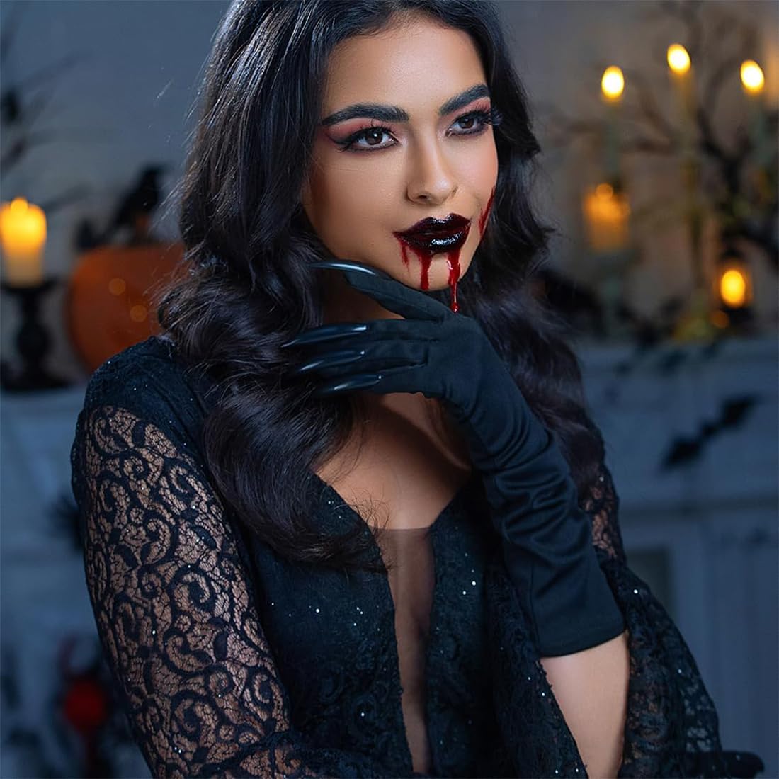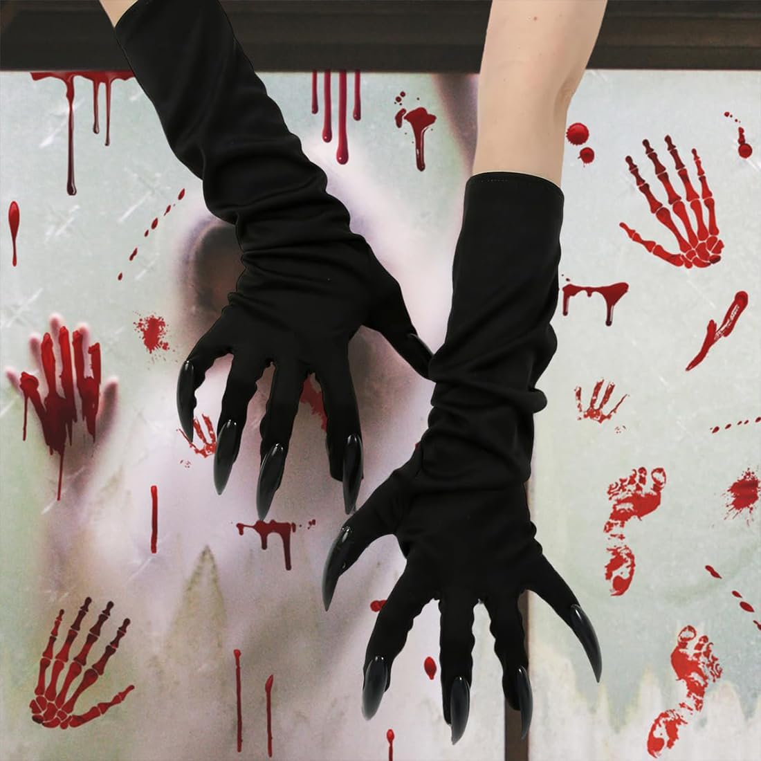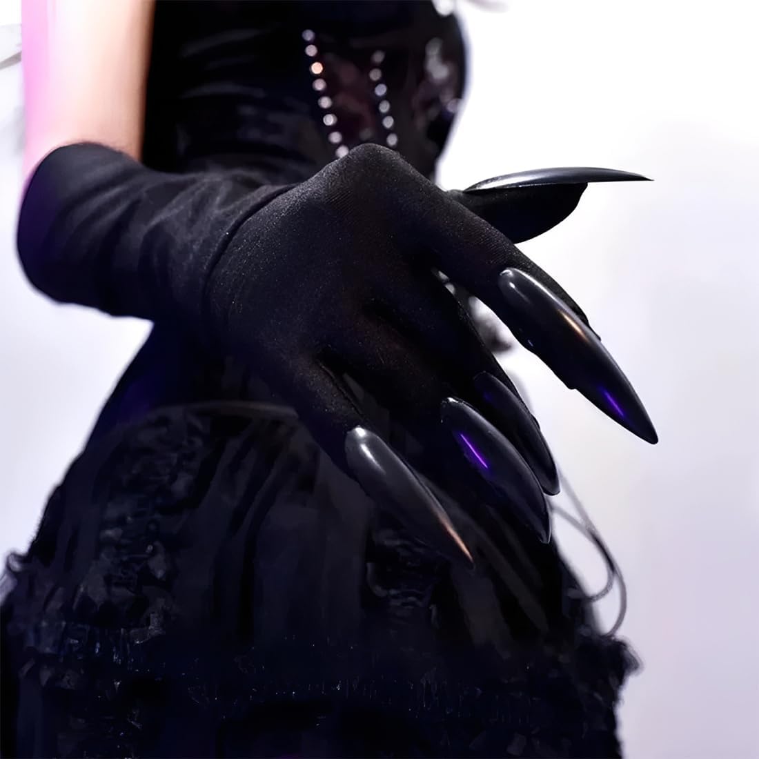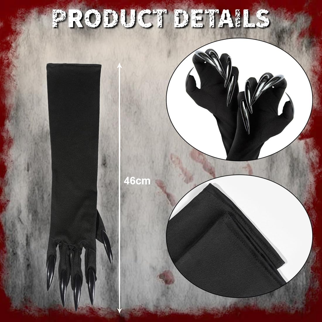 Atmosfera di Halloween al culmine: questi guanti lunghi, completi di affilati artigli neri, si abbinano perfettamente ai costumi di Halloween a tema oscuro come vampiri e streghe. Esaltando immediatamente l'atmosfera inquietante e misteriosa del tuo outfit, ti assicurano di diventare il centro dell'attenzione a qualsiasi festa. Materiali di alta qualità: realizzati in tessuto confortevole e delicato sulla pelle che si adatta al contorno delle mani, garantendo nessuna sensazione di costrizione o fastidio durante l'uso. Inoltre, i guanti possiedono un'eccellente elasticità, adattandosi a varie forme di mani per un uso confortevole e prolungato. Dettagli raffinati: gli artigli neri affilati sono caratterizzati da una lavorazione meticolosa con una finitura lucida, che ricorda gli autentici artigli di bestie o vampiri. Questo aggiunge autenticità al tuo ensemble, con una qualità evidente in ogni dettaglio, creando senza sforzo un effetto costume coinvolgente. Utilizzo versatile: adatti non solo per le feste di Halloween, ma anche per mascherate a tema, fotografie horror, eventi cosplay e altro ancora. Forniscono il tocco finale perfetto per look creativi diversi, soddisfacendo le vostre varie esigenze in fatto di costumi. Vestibilità perfetta: con una lunghezza di circa 46 cm, i guanti coprono efficacemente l'avambraccio, creando un effetto visivo slanciato e misterioso. Sono semplici e comodi da indossare, senza bisogno di passaggi complicati. Potete completare il vostro look rapidamente, risparmiando tempo prezioso.