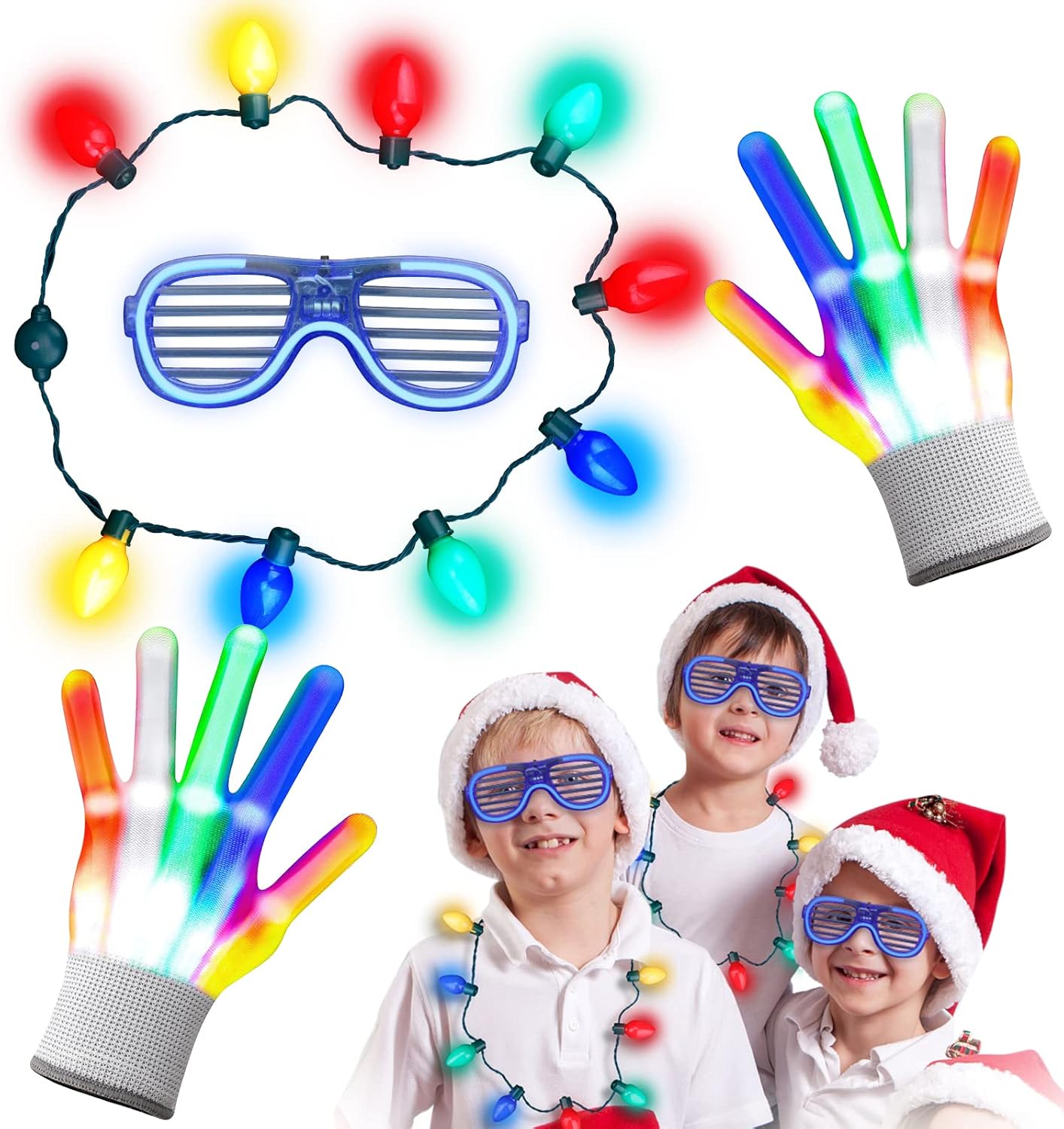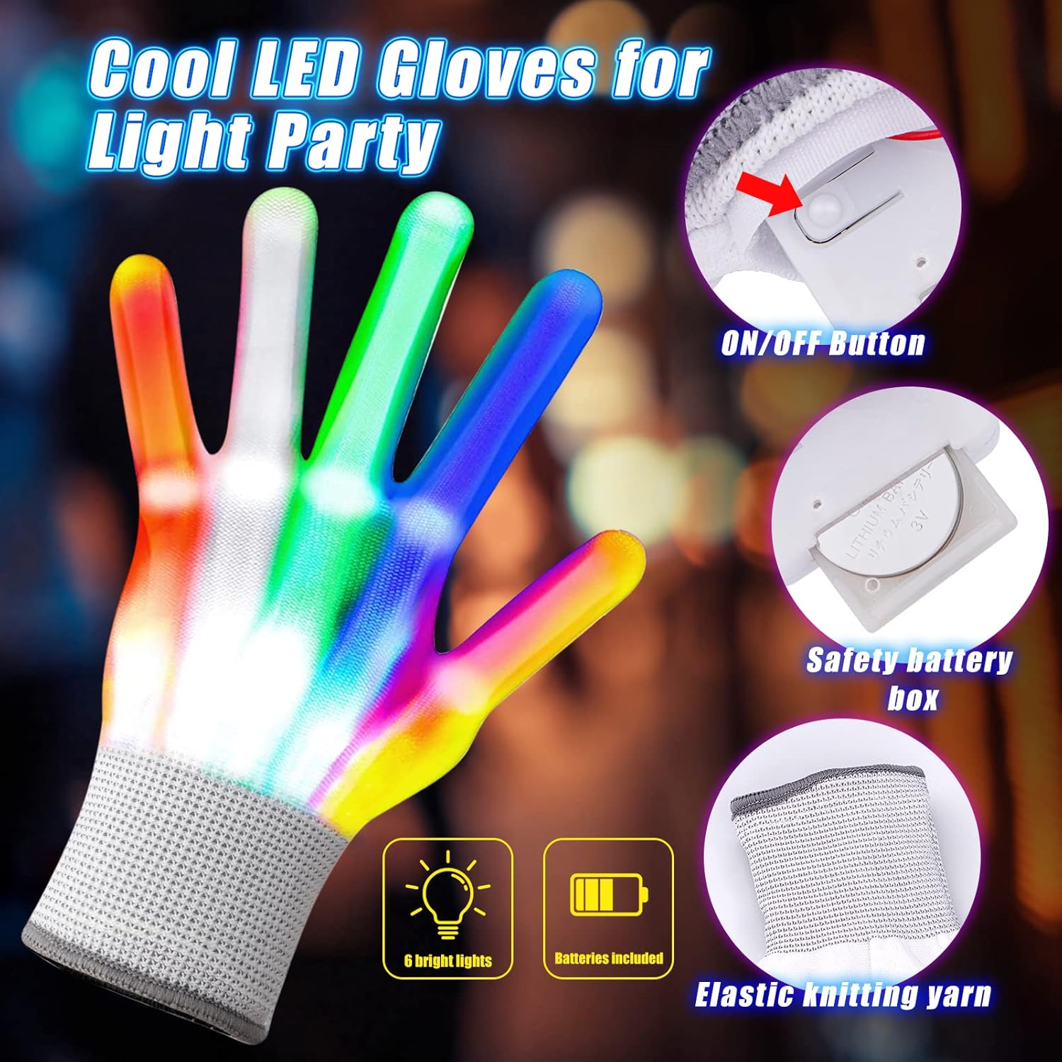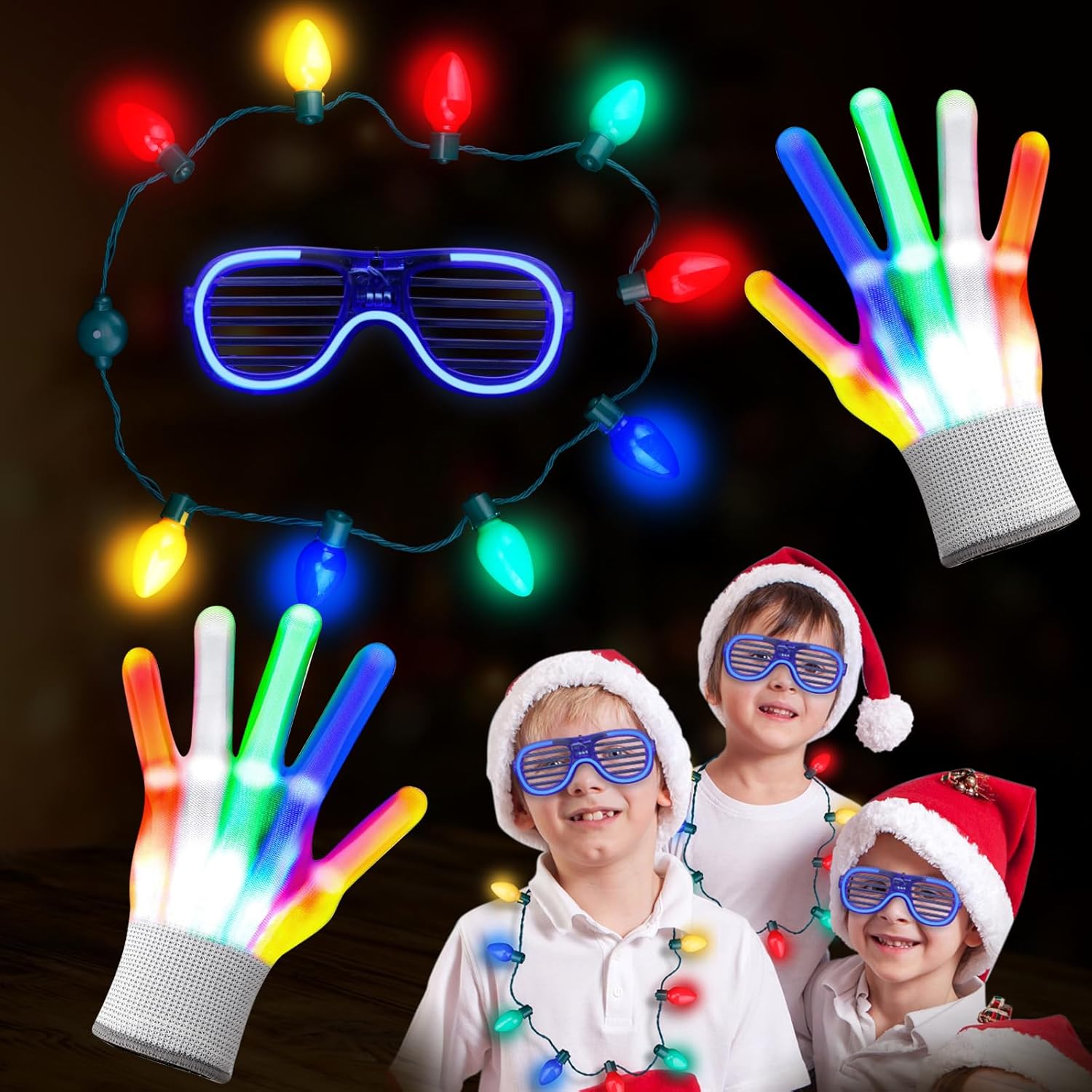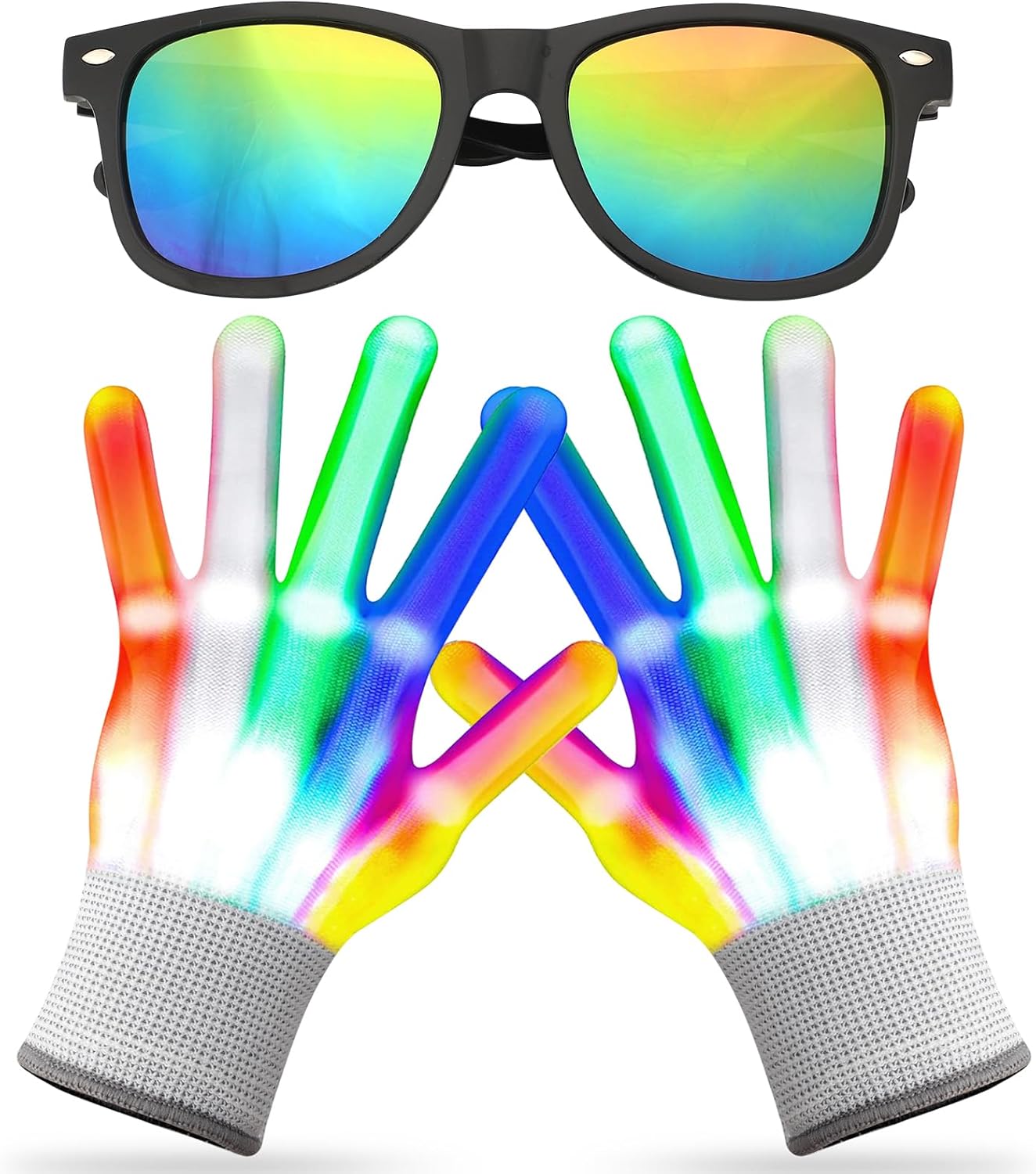 【Sicuro e confortevole】 I nostri guanti luminosi sono comodi e morbidi, realizzati in materiale lavorato a maglia ad alta resistenza, elastico e traspirante, consentendo una grande flessibilità. Ti darà calore in inverno ed è adatto ai bambini. Confezione: 1 paio di guanti (22 cm x 11 cm), 1 paio di occhiali da sole. 【Effetti di luce meravigliosi】 I guanti LED hanno 5 colori e 6 effetti di luce. Premere il pulsante di accensione per modificare 6 modalità di impostazione: flash a 3 colori, deformazione a 3 colori, trascinamento a 3 colori, flash rosso, flash verde, flash blu. 【Star della festa】 Spettacolo di luci perfetto, danza, Halloween, Natale, giochi per bambini, attività scolastiche, attrezzature per feste di famiglia, indossa questi guanti scintillanti, ascolta la tua musica preferita e balla come preferisci. Colore super cool, molto luminoso e vibrante! 【Regalo squisito per i bambini】 I guanti glitter luminosi multicolori sono perfetti per regali di compleanno per bambini/Halloween/Natale/Concerti in maschera/Ringraziamento/Regali di visita/Danza/Discoteca/Spettacoli di luci ecc. Apri il velcro nascosto sul polso del guanto ed estrai la batteria bianca per sostituire facilmente la batteria. Rimuovi semplicemente la linguetta dalla batteria di ciascun guanto e goditi una folle notte di festa!