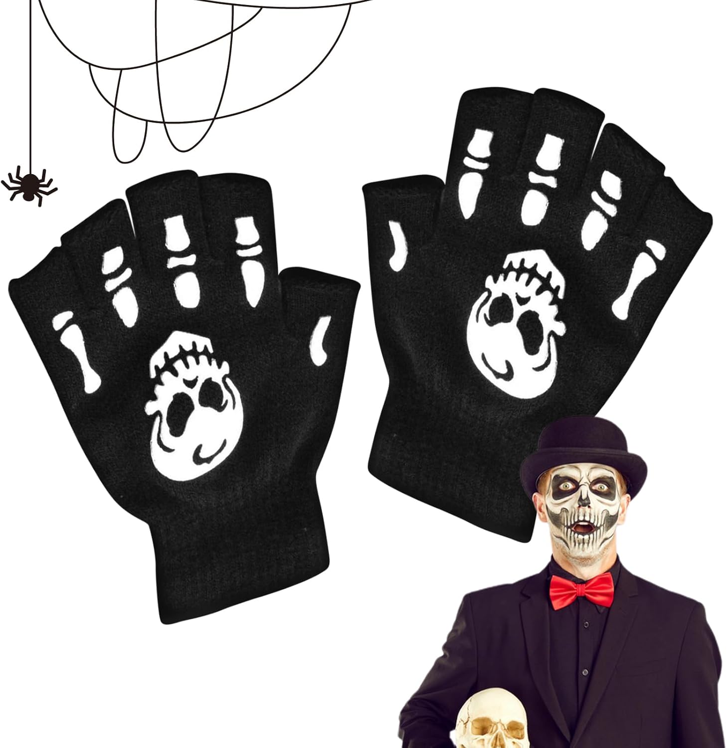 Funzionalità touchscreen efficiente: assicurati una vestibilità perfetta con i nostri guanti scheletro di Halloween. Il design ergonomico a mezzo dito non ostacola l'uso del telefono mantenendo i palmi caldi. La grafica spettrale del teschio aggiunge un tocco spigoloso al tuo costume Bagliore spettrale: fai risaltare il tuo costume di Halloween con i nostri guanti da scheletro che possono brillare al buio di notte. Perfetto per le feste festive. Con un meccanismo per assorbire la luce durante il giorno, brillerai tutta la notte. Materiali di alta qualità: questi guanti scheletro di Halloween sono realizzati in una miscela di nylon e cotone, che li rende comodi, caldi e delicati sulla pelle. Non preoccuparti di deformarsi o sbiadire perché dureranno tutta la notte di Halloween. REGALO UNICO: migliora il tuo gioco di costumi di Halloween con i nostri spettrali guanti da scheletro di Halloween. Ideale come regalo unico e premuroso per la tua ragazza, moglie, fidanzata, sorella, figlia o figlio e perfetto per le feste di Halloween. Ampia applicazione: decora le tue mani con guanti scheletro di Halloween per un tocco spettrale, perfetto per feste in costume, Halloween, feste in maschera, carnevale o feste di Natale.