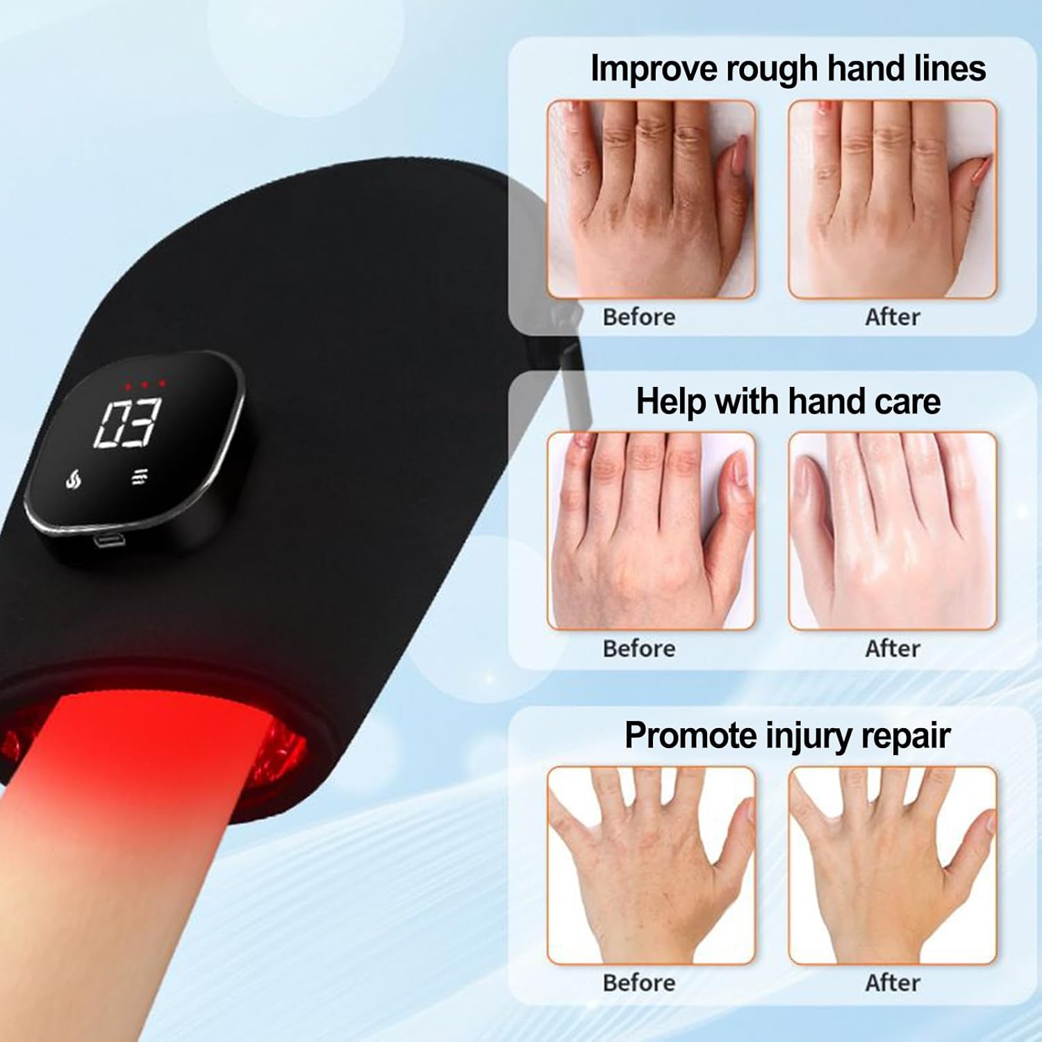 Distribuzione del bagliore uniforme: i guanti a luce rossa per le mani sono realizzati con ottanta lampadine per lato e un layout a 360 gradi, fornendo un'esposizione uniforme a mano piena a una leggera trattamento della luce, ideale per promuovere il comfort durante la lettura o la pratica di esercizi di consapevolezza in ambienti dimagi Opzioni in modalità flessibile: guanti a mano leggera rossa offrono impostazioni basse, medie e alte e impulsi, modalità del respiro, migliorando l'esperienza 'utente adattandosi a varie esigenze garantendo al contempo il comfort durante il rilassamento quotidiano o trattare gli allenamenti Zipper intuitiva: progettati con comodità in mente, i guanti a luce rossa per mano includono un meccanismo di zip facile che semplifica il processo di mettersi e decollare, offrendo una maggiore usabilità per gli utenti che cercano un trattamento per mano rilassante a casa Durata di utilizzo flessibile: l'involucro a mano a luce rossa presenta una batteria ricaricabile da 3000 mAh e consente agli utenti di aumentare la laurea, a partire da un'impostazione bassa per sessanta minuti di esecuzione, garantendo il comfort durante l'uso a casa o per i corsi di formazione, migliorando il rilassamento e il recupero in modo naturale Supporto manuale restaurativo: con una luce rossa a 850 nm di e 660 nm, questi guanti offrono una sensazione di conforto che aiuta a facilitare la tensione della mano, rendendoli fantastici per il recupero post-esercizio o lo stress allevia