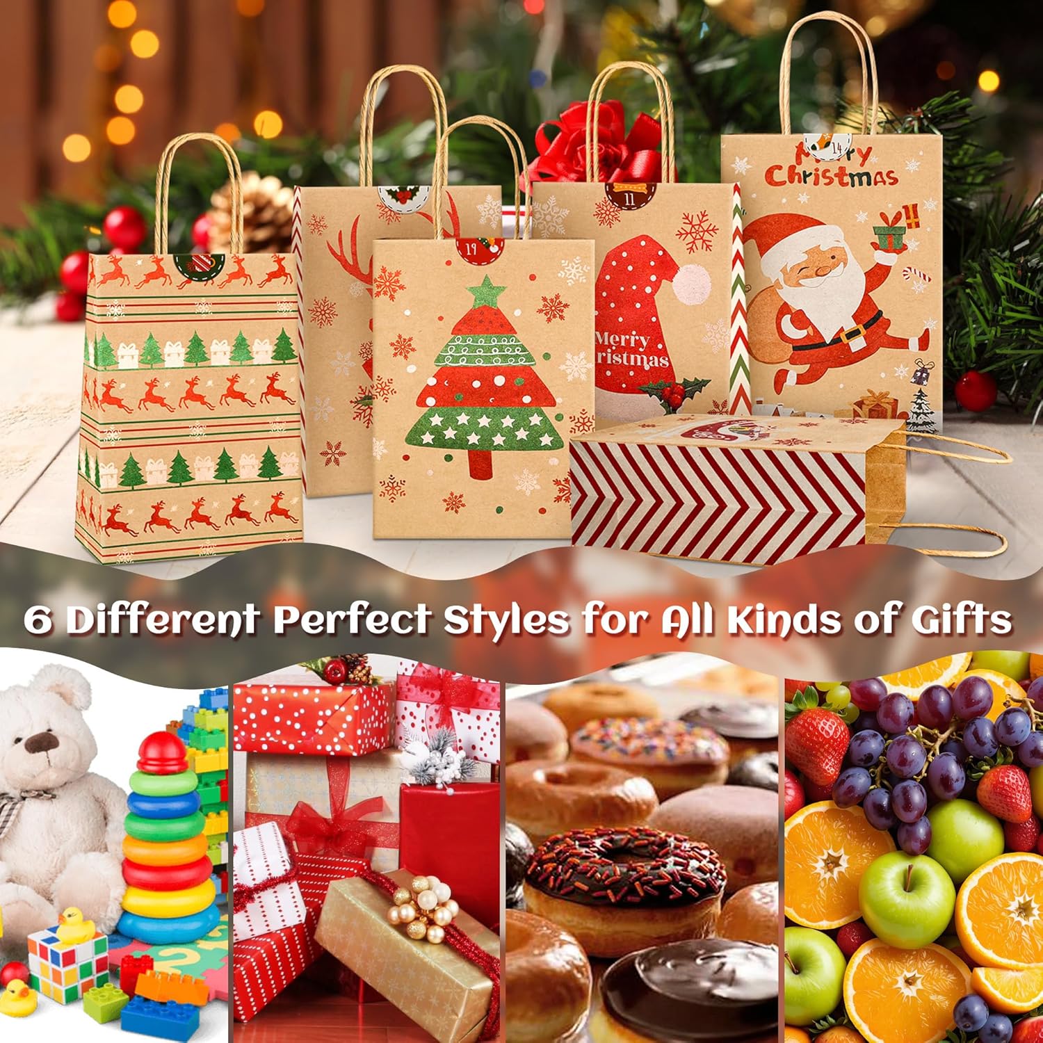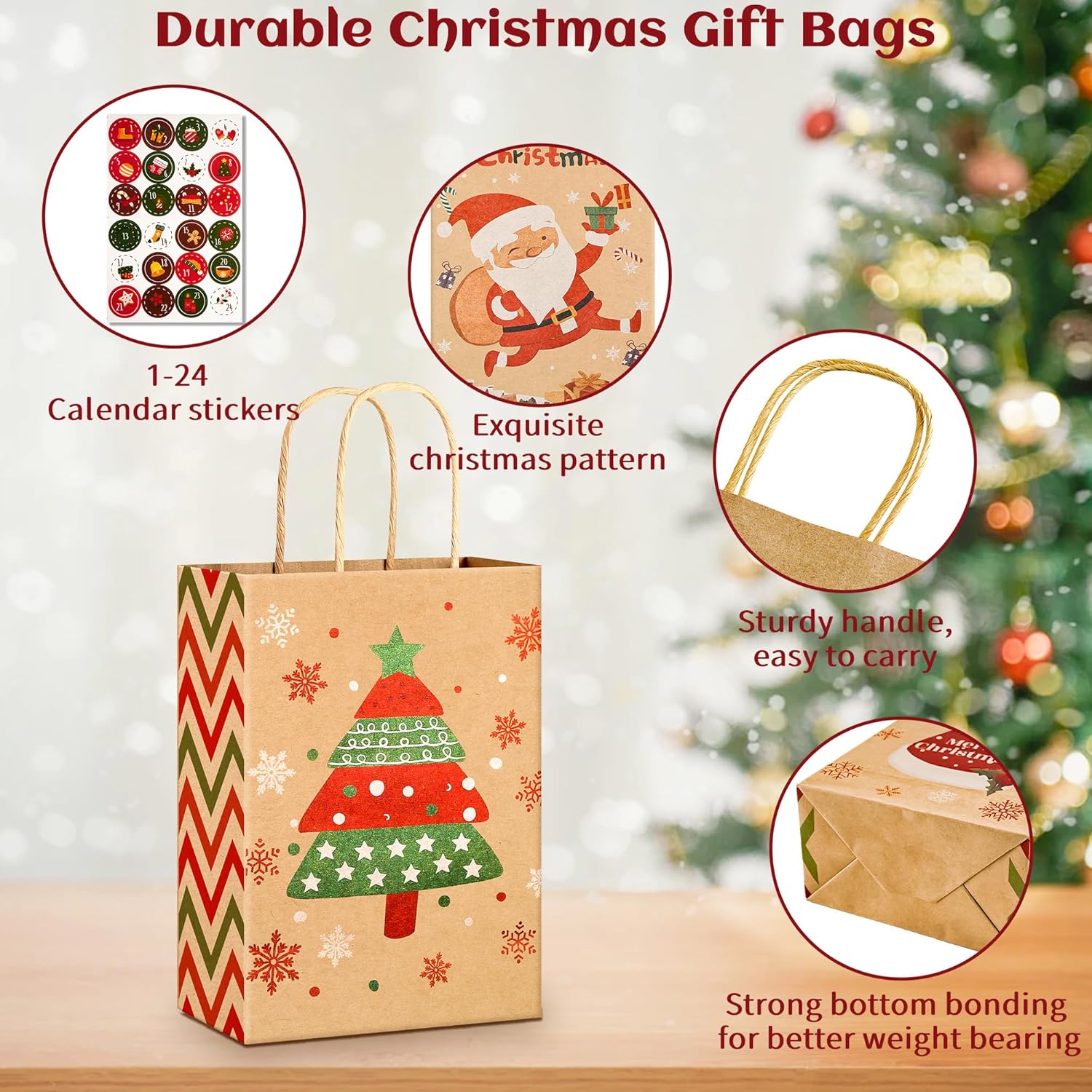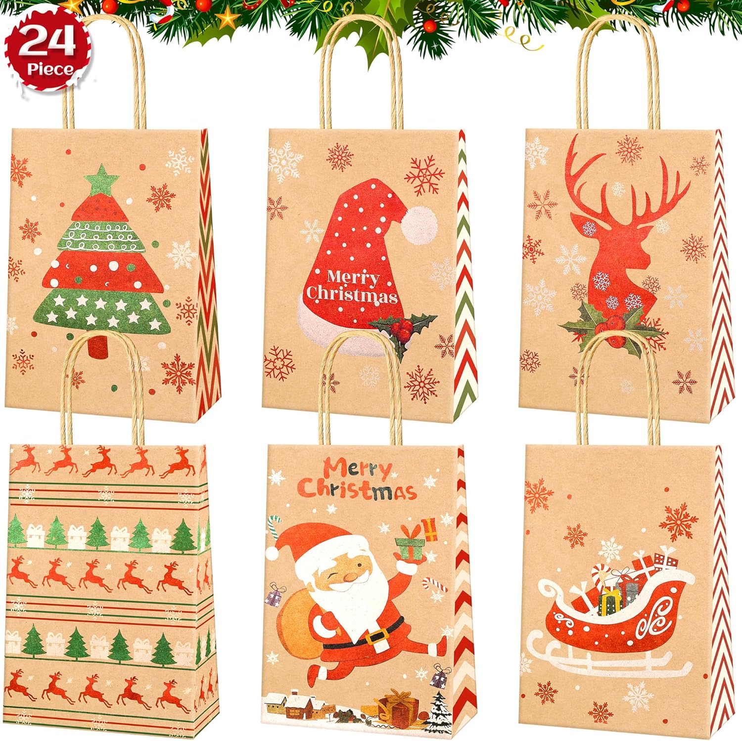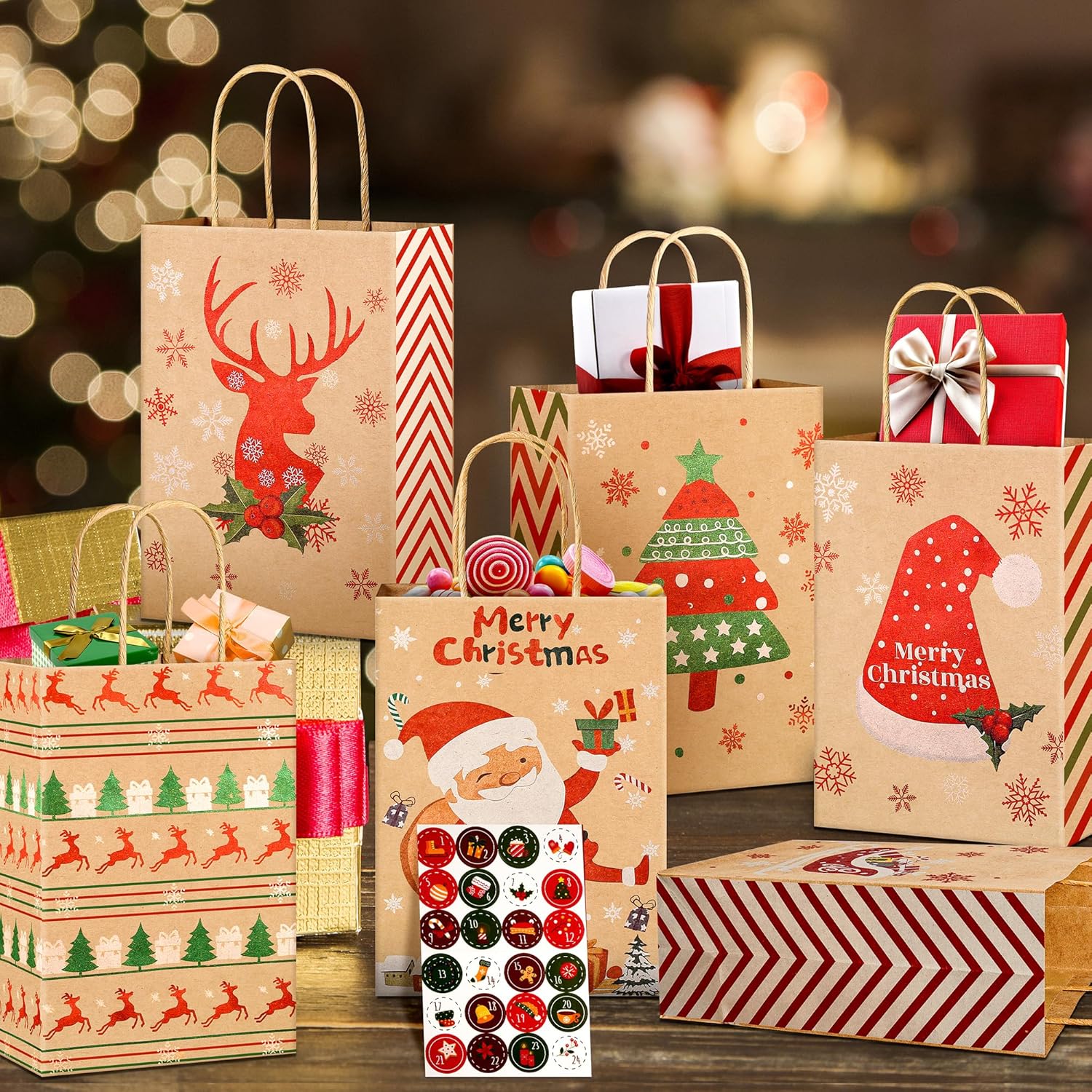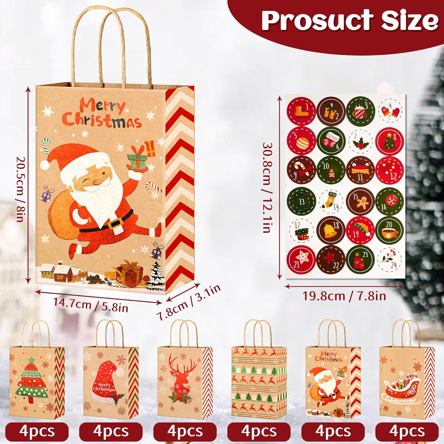 [DIMENSIONI PERFETTE E CONTENUTO DELLA CONFEZIONE] Riceverai 24 sacchetti regalo di Natale, 6 diversi design classici natalizi, ogni design ha 4 pezzi. Ogni sacchetto regalo di Natale in carta kraft misura 21 x 15 x 8 cm e ha un manico di 7-8 cm. È incluso anche un adesivo natalizio da 1 a 24 numeri, Crea un ricordo unico con i nostri sacchetti regalo e adesivi fai-da-te, Progetta il tuo calendario dell'Avvento per i tuoi cari. [MATERIALE IN CARTA KRAFT DI ALTA QUALITÀ] Quando tocchi i nostri sacchetti di carta natalizi, sentirai la qualità distintiva. Sono realizzati in carta kraft da 150 g, il manico è fissato con colla di alta qualità, robusta e durevole, può essere utilizzato per trasportare regali per ridurre il rischio di strappi. I sacchetti natalizi in carta di alta qualità non solo rendono il tuo regalo un vero e proprio eye-catcher, ma mostrano anche quanto apprezzi il destinatario. [VARI MODELLI ACCATTIVANTI] I sacchetti natalizi in carta kraft sono stampati con 6 diversi elementi classici natalizi, come Babbo Natale, albero di Natale, renna, cappello di Babbo Natale, confezione regalo. I colori vivaci e la chiara tecnologia di stampa con motivi natalizi li rendono un vero e proprio eye-catcher, ideali per incartare i tuoi regali di Natale e aggiungere un ulteriore allegria natalizia ai regali di questa stagione. [BORSE DI NATALE MULTIUSO] Sacchetti di carta natalizi con manici Facili da aprire o piegare, facili da trasportare, molto adatti per riempire molti regali di piccole e medie dimensioni, come caramelle, biscotti, cioccolatini, giocattoli, foto, ecc. La scelta migliore per confezionare regali di Natale! Questi 24 sacchetti regalo non sono solo un imballaggio, ma anche uno speciale regalo di Natale per amici e vicini, che trasmettono il tuo calore e i tuoi migliori auguri. [ADATTO A MOLTEPLICI OCCASIONI] I sacchetti regalo di carta sono adatti per varie feste di Natale, riunioni festive, cena del Ringraziamento e altre occasioni. Aggiungono un'atmosfera natalizia più forte alle tue attività e portano più sorprese ai tuoi bambini e amici. Le nostre borse da festa sono adatte ad adulti, ragazze e ragazzi. In caso di problemi, contattaci liberamente. Faremo del nostro meglio per renderti soddisfatto.