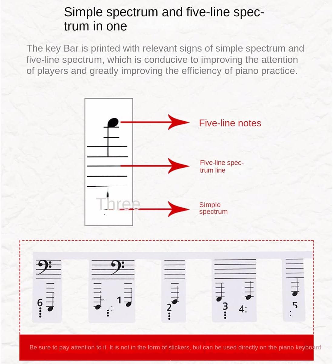 Copre i 61 del pianoforte, universalmente adatto a tutti i tipi di pianoforti a coda a 61 , pianoforti verticali, pianoforti digitali e tastiere. Il è realizzato in PVC e collega le etichette in serie, quindi non è necessario attaccarsi ai come per pianoforte. Facile da installare, facile da rimuovere, lasciare residui e mantenendo la tastiera pulita e ordinata. Mostrare la nota di ogni tasto con il doppio , che aiuta a trovare più velocemente il tasto corrispondente tastiera, perché tutte le partiture per pianoforte utilizzano la del di alti e . Non è necessario conoscere i nomi dei o si trova il Do centrale, è sufficiente mettere le strisce di note tastiera del pianoforte. Fatto in pochi secondi! inizi a conoscere i e acquisisci familiarità con la regola 'ottava, puoi rimuovere le strisce di note tastiera.