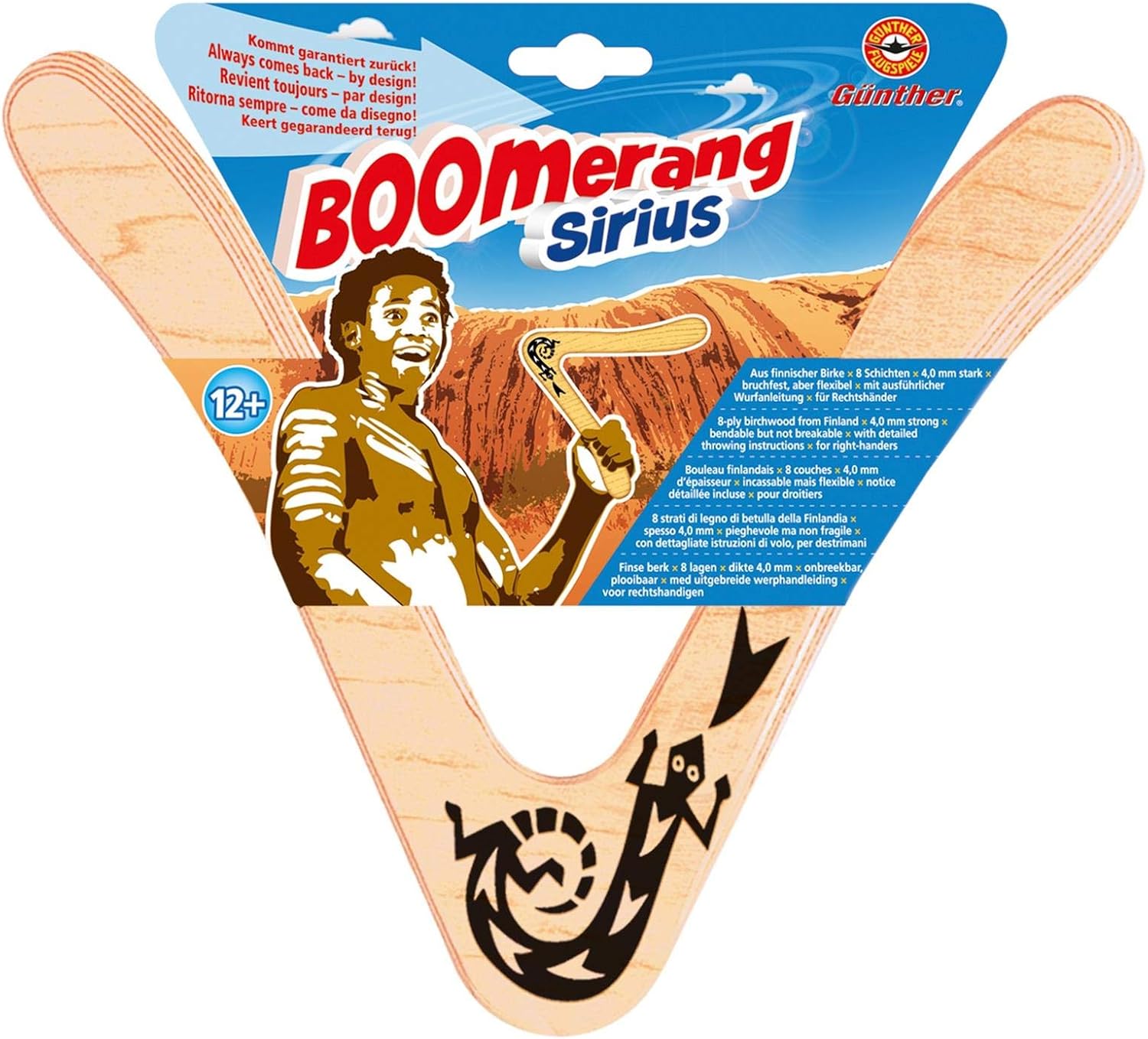 Boomerang in forma classica, garanzia di ritorno Composto da 8 strati di compensato aeronautico finlandese Dimensioni: circa 25 cm Raggio di volo: circa 15-20 m Con istruzioni dettagliate per il lancio, prodotto in Germania