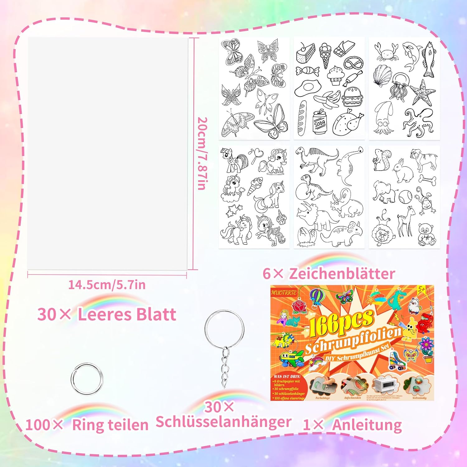 Set di pellicole termoretraibili convenienti: il set contiene 30 pellicole termoretraibili A5, 30 portachiavi, 6 pezzi di carta da stampa con immagini, 100 bottoni e 1 manuale di istruzioni (lingua italiana non garantita) Pellicola termoretraibile: ci sono 30 fogli di carta termoretraibile in formato A5, ognuno misura 7,87 x 5,66 pollici, ha uno spessore di 0,3 mm, un lato ha una finitura opaca e l'altro lato ha una finitura lucida, quando riscaldato, la pellicola termoretraibile si restringe al 20% della sua dimensione originale Istruzioni per l'uso: disegnare con una penna solubile in acqua sulla superficie ruvida, poi tagliare con le forbici lungo il contorno, praticare un foro nella parte superiore e cuocere la pellicola per 2-3 minuti in forno preriscaldato a 165 °C o restringere la pellicola termoretraibile con una pistola termica fino a quando non è piatta Design di stampa ad alta risoluzione: viene fornito con sei carte stampate con motivi, tra cui animali, fiori, cartoni animati e altri motivi. Puoi disegnare la forma direttamente dopo il disegno o creare liberamente il modello Applicabile a più scenari: per creare portachiavi, gioielli per borse da scuola, adatti per feste di compleanno per bambini, lezioni di artigianato, interazione genitore-figlio, materiali per l'insegnamento artistico a scuola, come regalo o per l'uso quotidiano