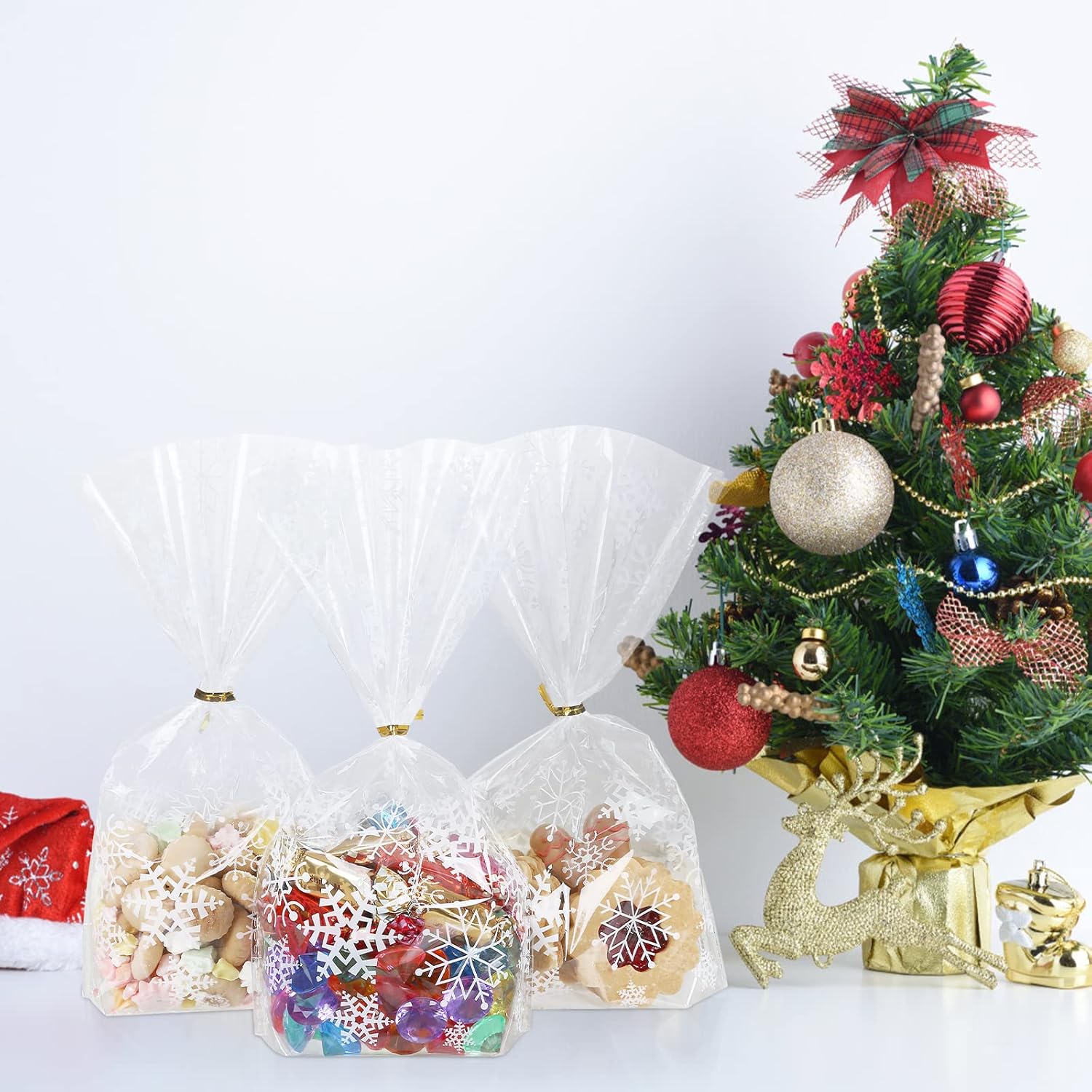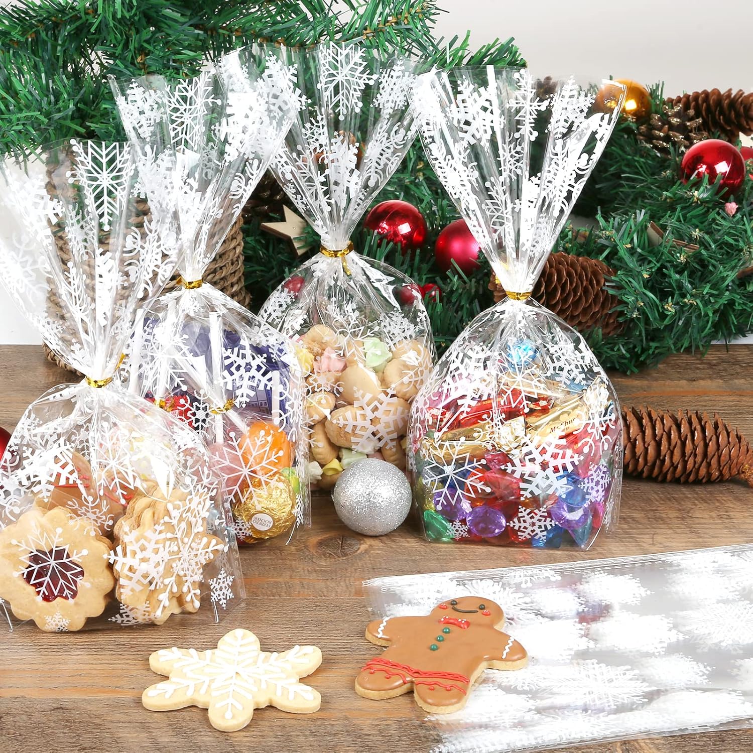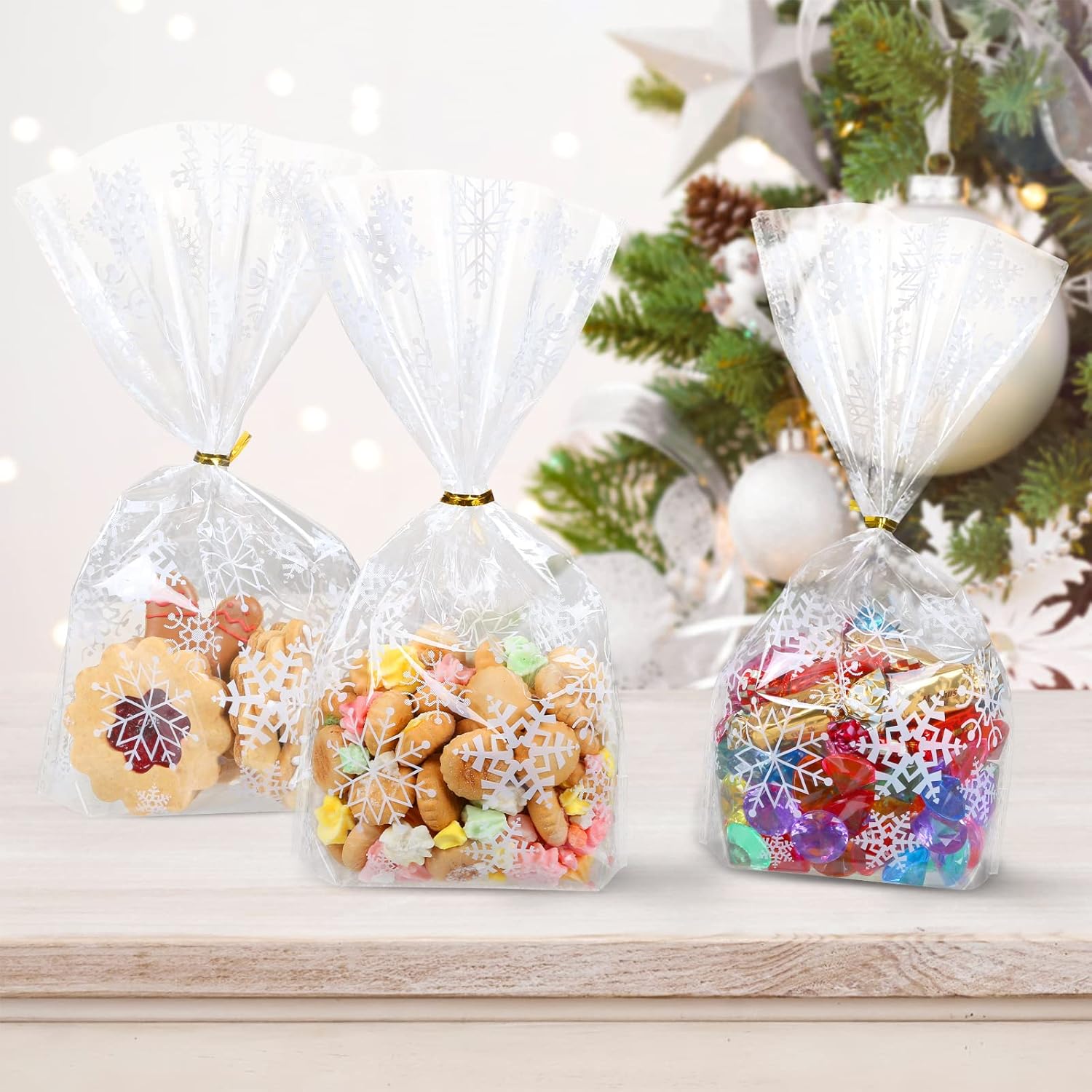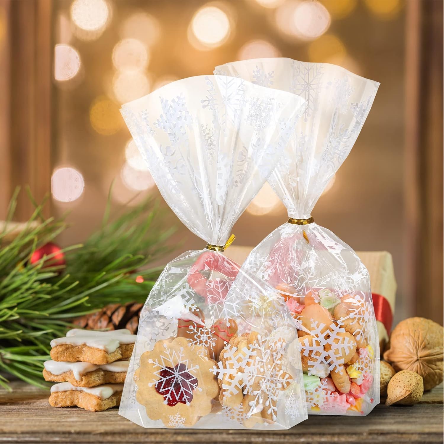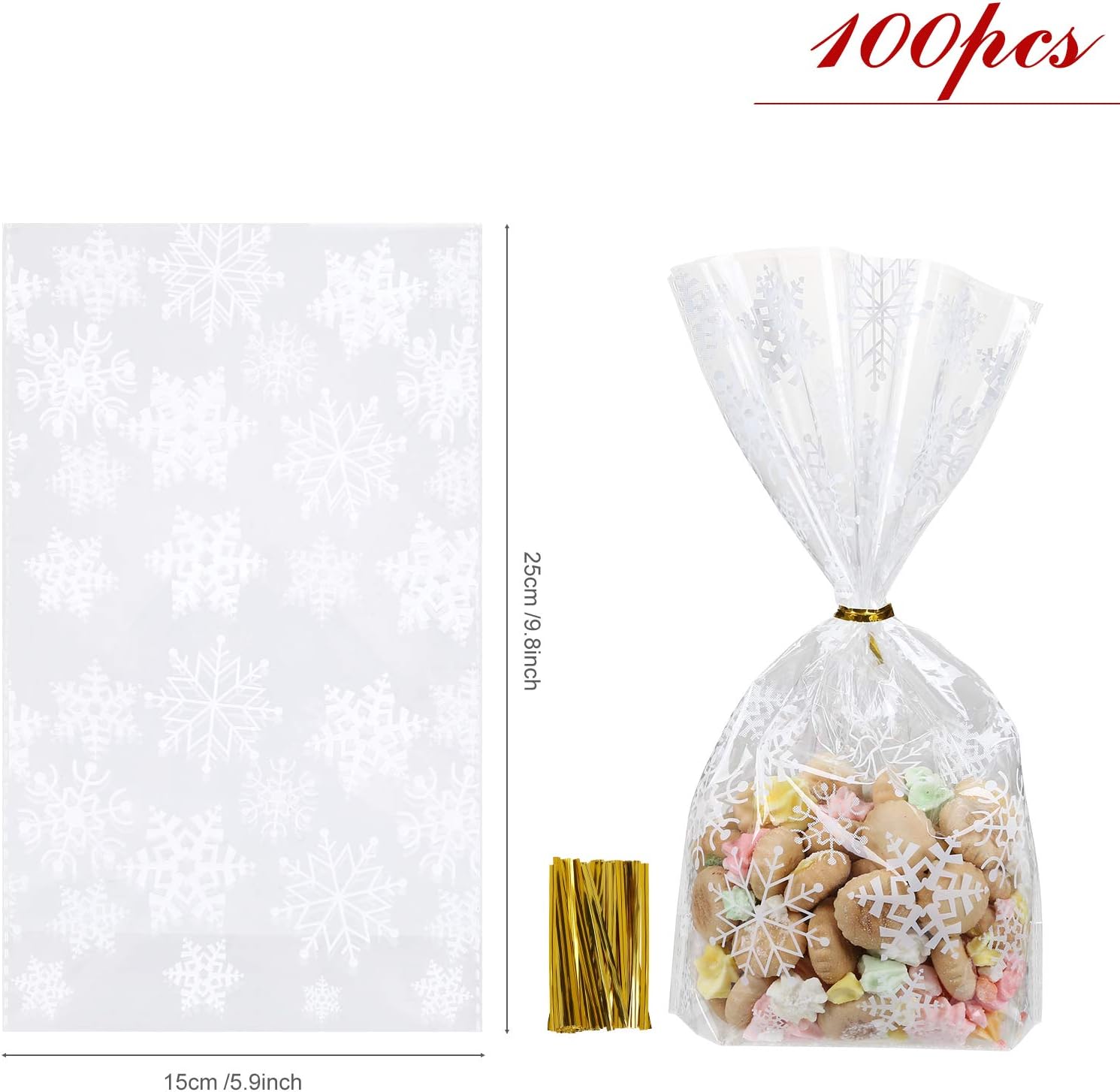 Materiale: OPP, adatto per alimenti e ottima densità di aroma, inodore e insapore 100 sacchetti per biscotti per Natale nella dimensione di 25 x 15 cm, 100 nastri intrecciati dorati. Aspetto brillante e cristallino con design a fiocchi di neve. I biscotti festivi possono essere confezionati con stile. L'ideale è avvolgere dolcetti fatti in casa come biscotti, muffin, cioccolatini, caramelle, mandorle e tanti altri piccoli regali di Natale e poi regalarli. Le vostre prelibatezze fatte in casa sono particolarmente belle nei sacchetti trasparenti e sono ulteriormente protette! Aumenta l'attesa del Natale!