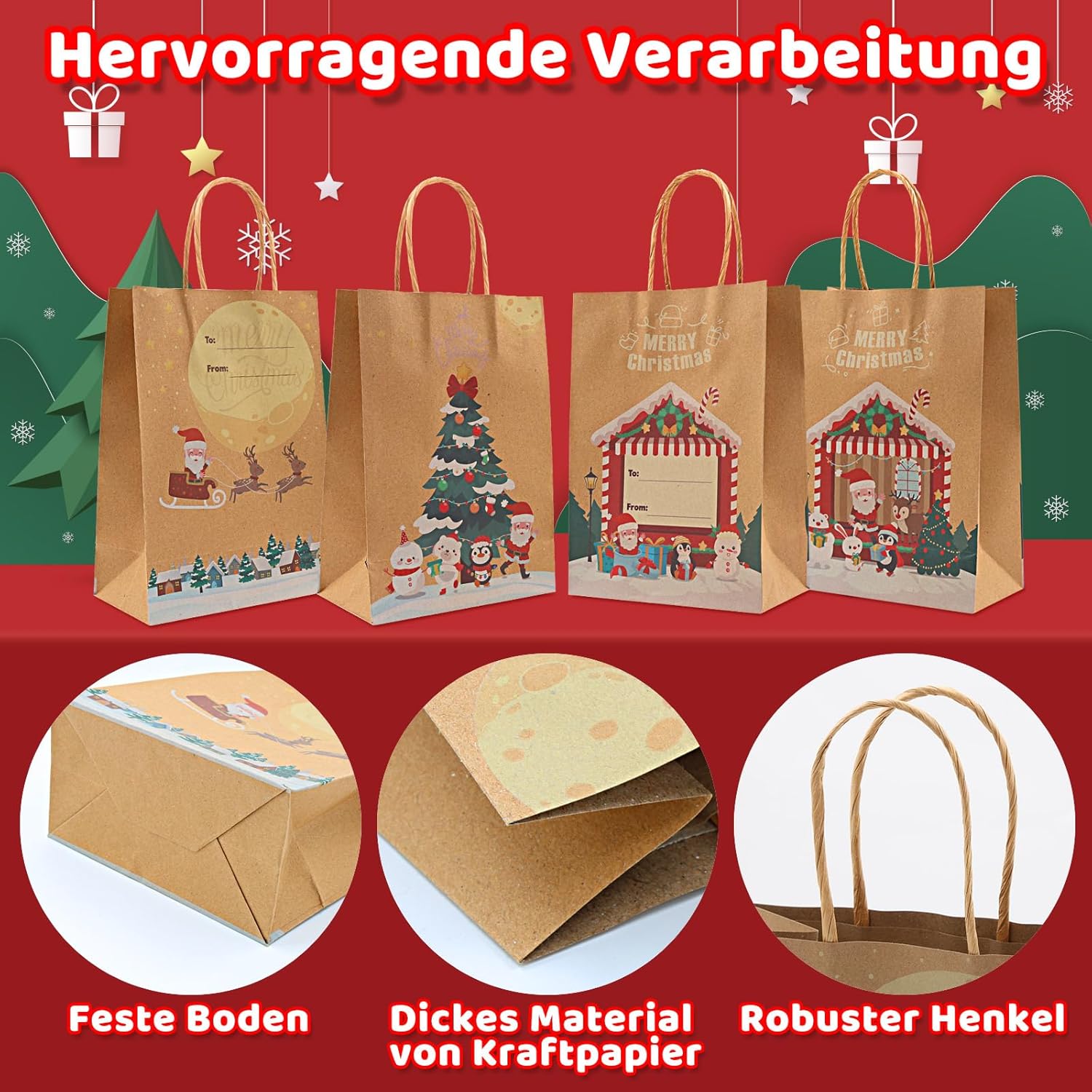 Materiale premium: sacchetti di carta natalizi realizzati in carta kraft di alta qualità, spessi, robusti e durevoli, non facili da rompere e strappare, riciclabili, riutilizzabili. Ottima confezione: ogni confezione include 12 sacchetti di carta natalizi con stili diversi in un modello elegante e bello, che possono servire allo scopo di una varietà di articoli. Dimensioni perfette: 15,5 x 8 x 22 cm (esclusa l'altezza del manico), sufficiente da riempire con dolci, dolcetti, biscotti, piccoli giocattoli ecc., con manico rinforzato e attorcigliato, facile da trasportare, adatto sia per confezionare regali di Natale che per conservare le necessità quotidiane. Design creativo e romantico: ogni lato del sacchetto di carta natalizio ha elementi natalizi con stampe chiare e colori vivaci, i sacchetti regalo natalizi possono aggiungere un'atmosfera natalizia ed enfatizzare una forte atmosfera festosa, sono perfetti per le celebrazioni di Capodanno e le decorazioni delle feste di Natale. Ampio utilizzo: le borse natalizie come scelta ideale possono essere perfettamente utilizzate per regali di Natale, regali del Ringraziamento, feste di Capodanno, feste di compleanno, ecc., adatte a tutte le età, ideali anche per confezionare giocattoli, bambole, artigianato, biscotti, caramelle, cioccolato e altri piccoli oggetti.
