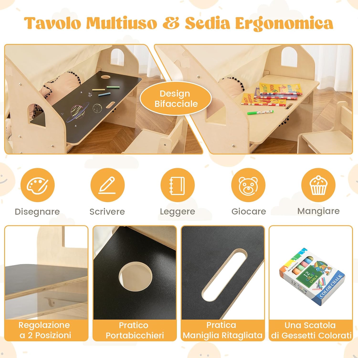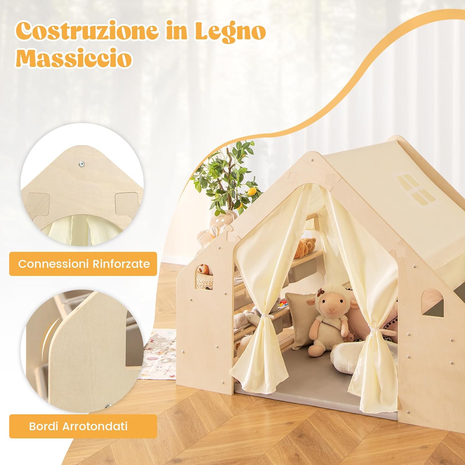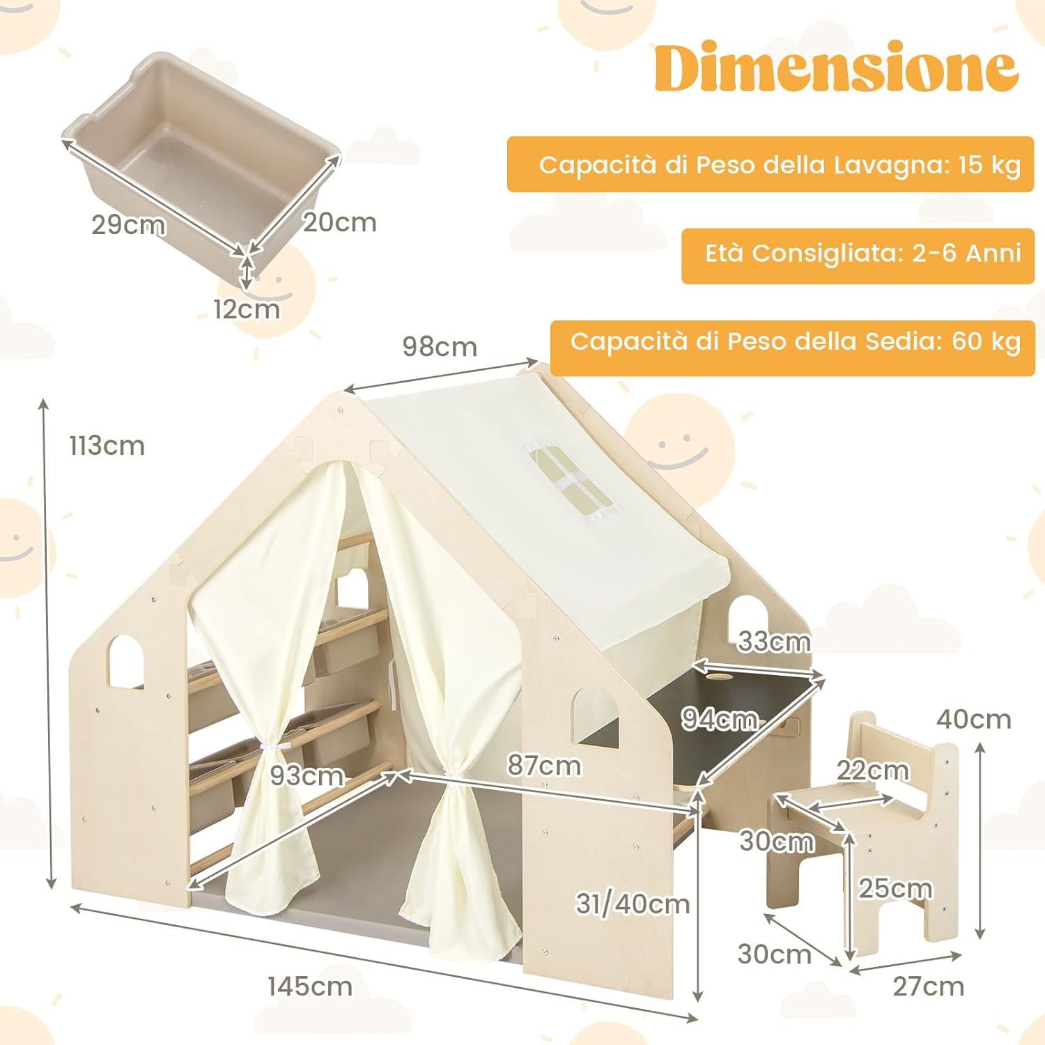 # Casetta per bambini 6 in 1 # Questa casetta 6-in-1 combina una tenda, un tappetino, una tavola, un tavolo, uno spazio di archiviazione e delle sedie, perfette per far giocare e socializzare 5-6 bambini di 2-6 anni. # Sedie ergonomiche # Questa casetta è dotata di tappetini morbidi e delicati per garantire il comfort. Inoltre, la robusta sedia ergonomica può sostenere fino a 60 kg e può essere regolata in 2 posizioni per adattarsi a bambini di diverse altezze. # Ampia gamma di applicazioni # Questa casetta Montessori è adatta a diverse attività come il gioco, l'apprendimento e la tavola. Ideale per la camera dei bambini, il soggiorno o l'asilo nido, offre ai bambini un divertimento senza fine. # Design sicuro e stabile # Questa casetta è realizzata con pannelli di alta qualità per garantire durata e sicurezza. Inoltre, presenta bordi arrotondati per evitare lesioni e chiusure a scatto per garantire un collegamento stabile. # Facile da montare e da pulire # Completa di accessori e istruzioni illustrate, il montaggio della tenda giocattolo è un gioco da ragazzi. Inoltre, la copertura esterna può essere facilmente rimossa e lavata in lavatrice