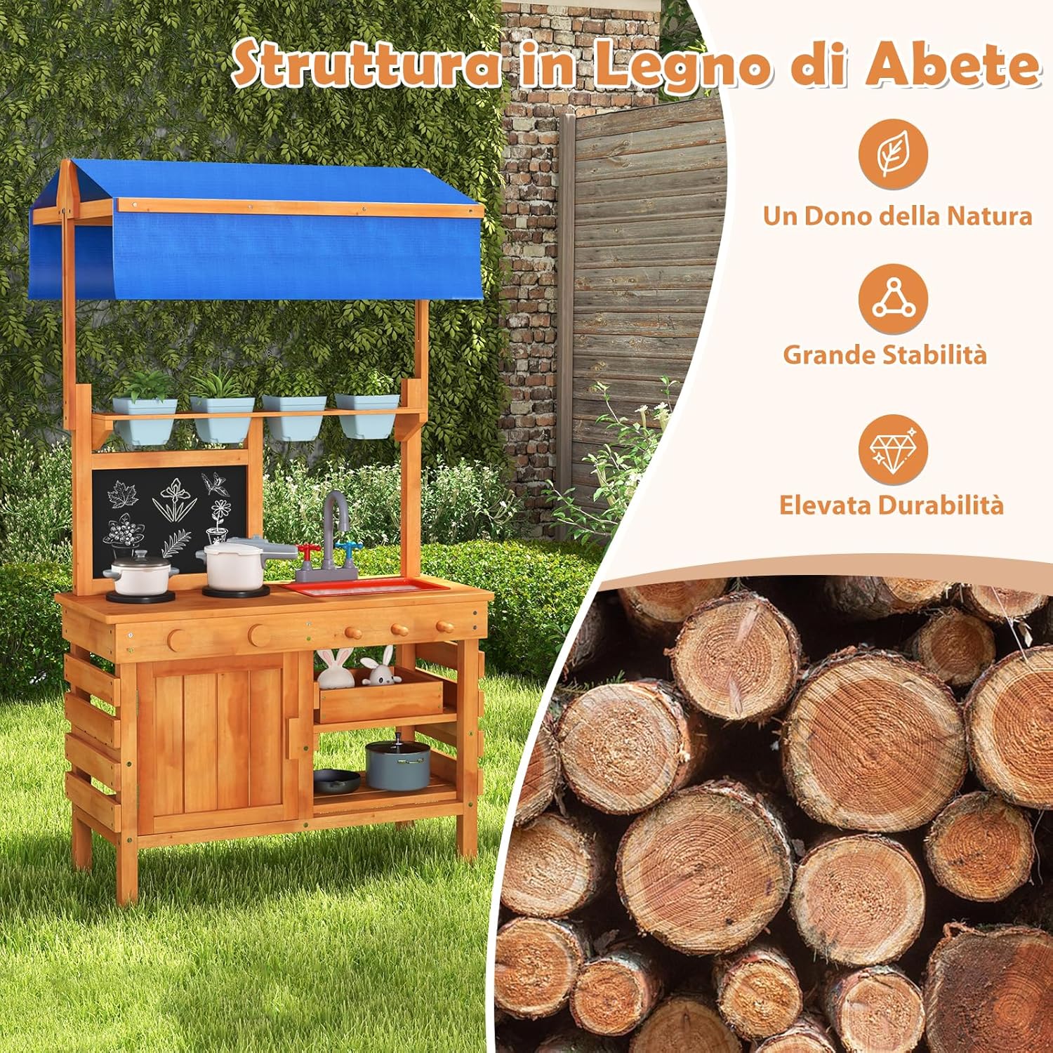 # Design 2 in 1 #Questo giocattolo per bambini è dotato di una scatola per la coltivazione delle piante e di una cucina giocattolo per bambini completamente funzionale. I bambini possono divertirsi a coltivare ortaggi e frutta e a sperimentare il divertimento di cucinare in cucina; # Materiale di alta qualità #Questo banco da giardinaggio per bambini è realizzato in legno di abete rosso di alta qualità, resistente. Il tetto è realizzato in tessuto di alta qualità, impermeabile e resistente al sole, per creare un ambiente ideale per la crescita delle piante. Inoltre, la cucina in legno è regolabile in altezza per adattarsi alle fasi di crescita dei bambini e la tettoia è rimovibile. # Molteplici opzioni di stoccaggio # Il set da cucina per bambini comprende un mobile con ante, un ripiano aperto, un cassetto e 3 pratici ganci per un facile accesso agli utensili. Con dimensioni complessive di 136x77x56,5 cm, un'altezza del piano di lavoro di 55 cm dal pavimento e una dimensione del piano di lavoro di 77x32 cm, il piano di lavoro è abbastanza grande da permettere a più bambini di giocare insieme. # Funzioni Versatili # Gli accessori includono 4 fioriere, 2 piccole cazzuole e 1 rastrello, per dare ai bambini la possibilità di piantare e fare giardinaggio. Inoltre, i bambini possono utilizzare la lavagna integrata per registrare la crescita delle loro piante. I ripiani inferiori aiutano i bambini a sviluppare buone abitudini di organizzazione. # Significato Educativo # Più che una cucina da gioco, questo set è uno strumento di apprendimento e di sviluppo per bambini dai 3 agli 8 anni. Promuove il gioco educativo, sviluppa le abilità di base della vita, incoraggia la creatività, migliora le funzioni cognitive e permette ai bambini di imparare attraverso il gioco.