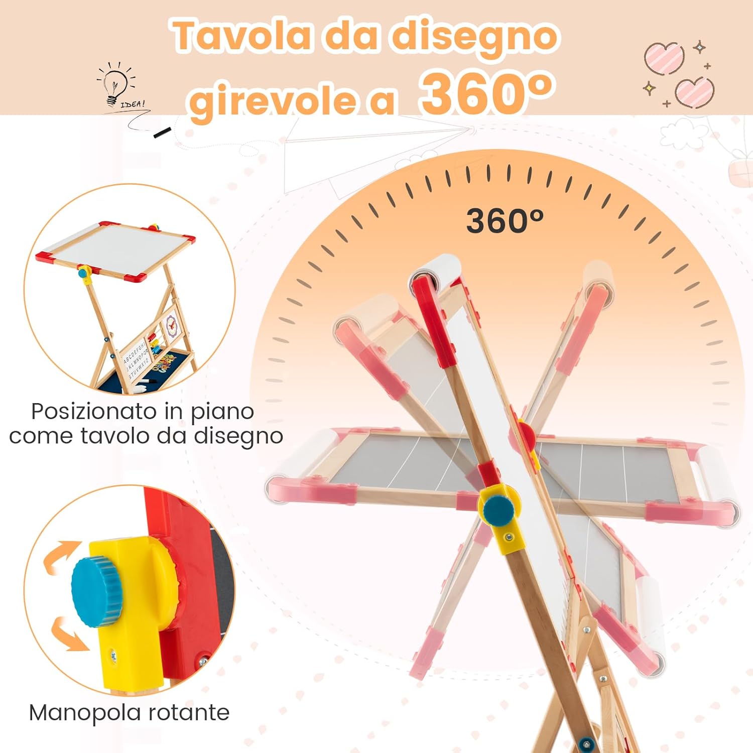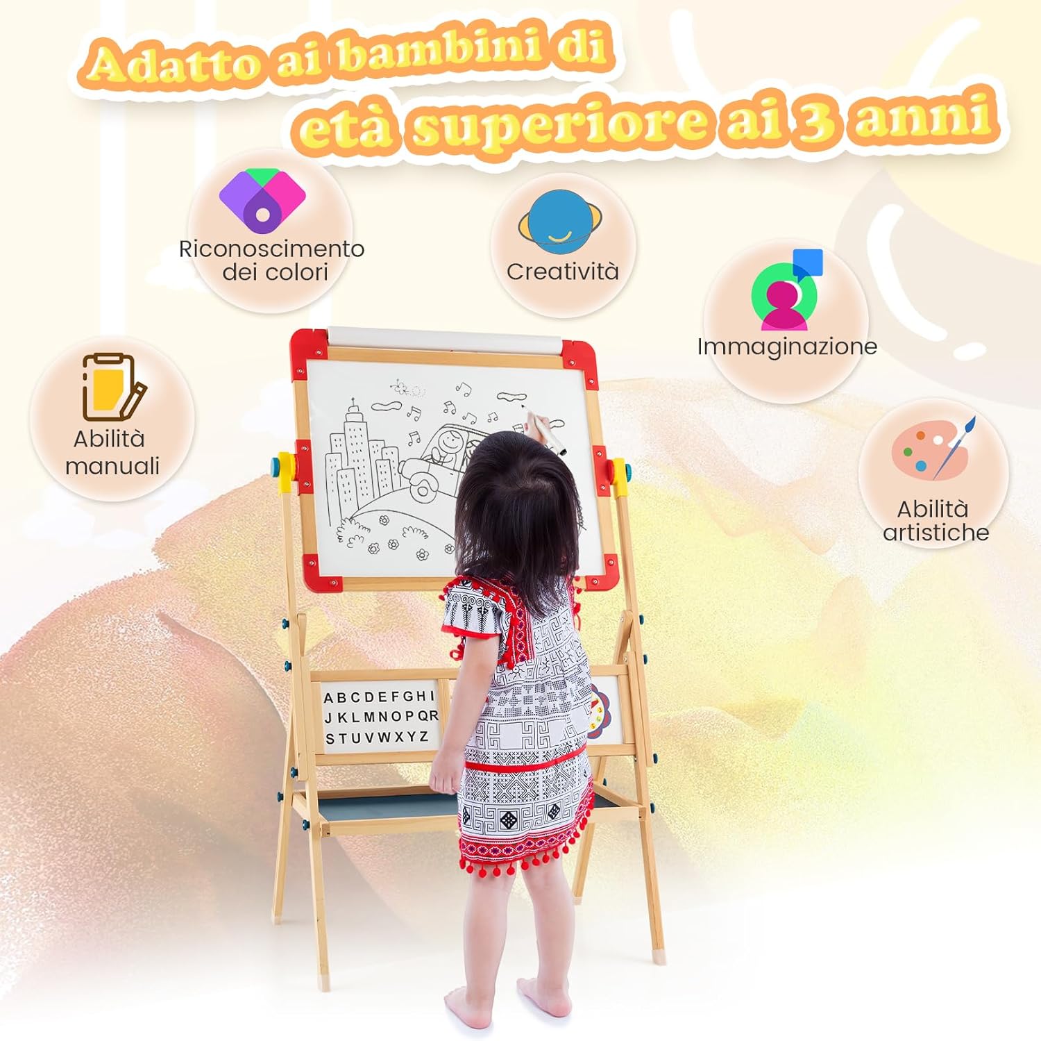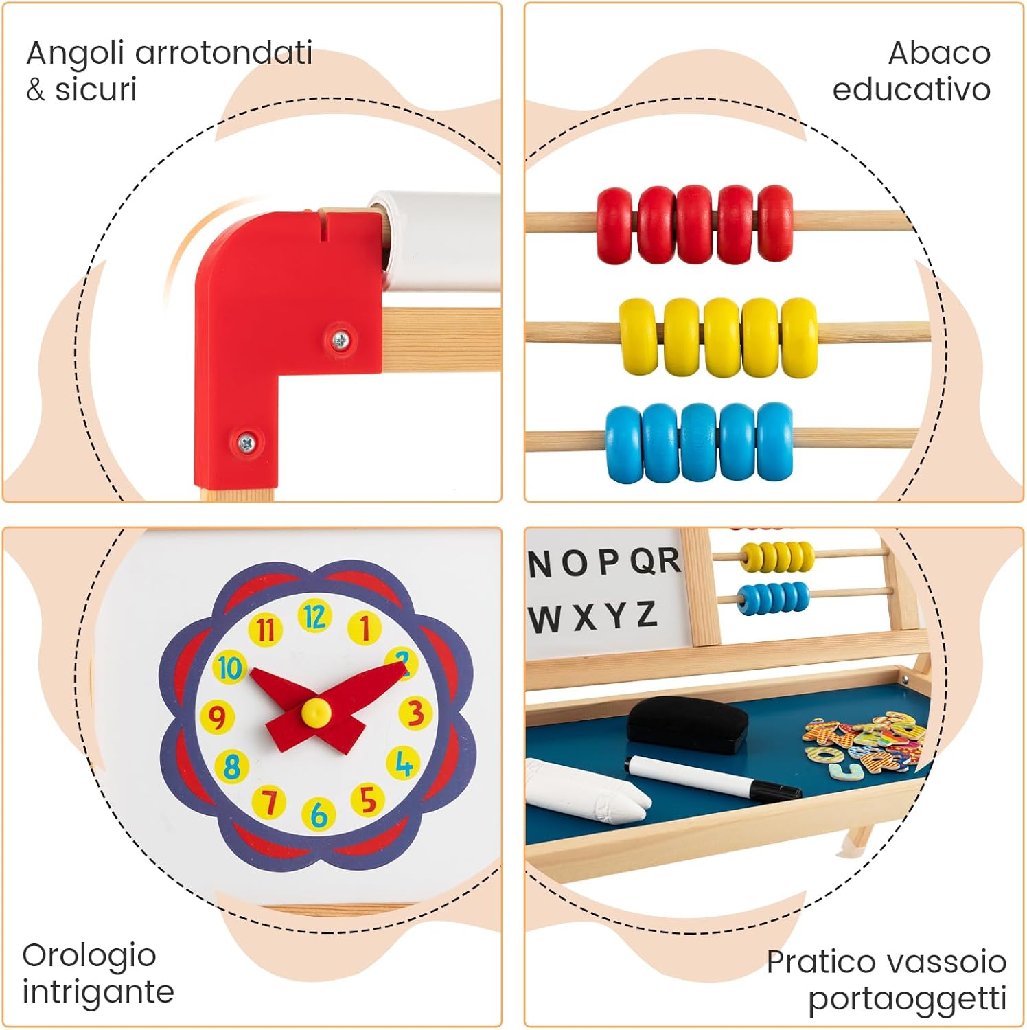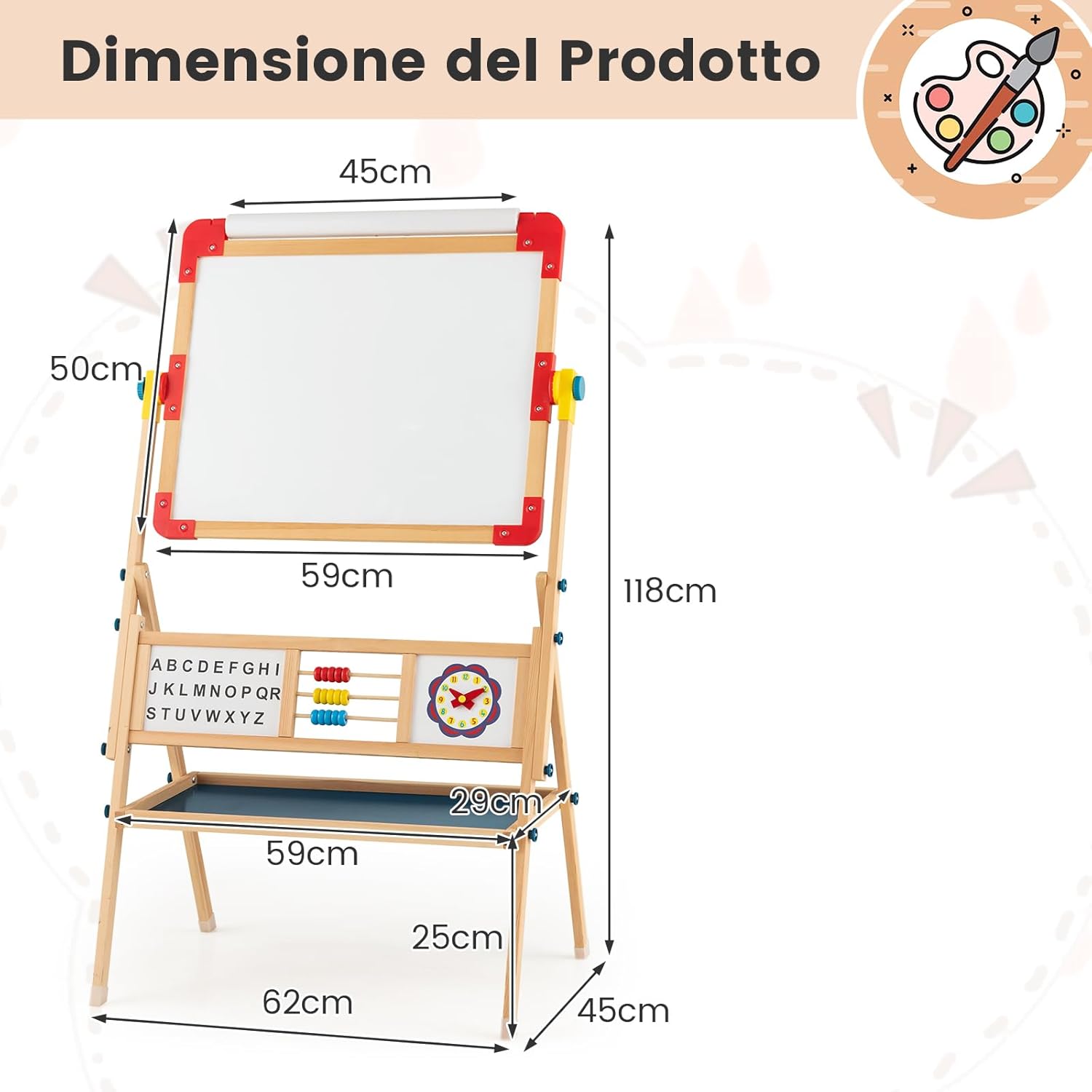 # Design 3 in 1 e lavagna rotante a 360° # Questo cavalletto artistico per bambini è dotato di una lavagna da disegno a doppia faccia (lavagna a gesso e lavagna magnetica) e di un rotolo di carta fissato in alto per un uso versatile. Inoltre, grazie al design aggiornato e regolabile, il tavolo da disegno può essere ruotato in qualsiasi angolazione per soddisfare le diverse esigenze dei bambini. # Regalo educativo per bambini e bambine # Dotato di orologio, abaco e adesivi dell’alfabeto, questo cavalletto artistico bifacciale non è solo adatto per dipingere, ma anche un ottimo strumento per far imparare la matematica, il vocabolario e la cognizione del tempo ai vostri figli. Questo set di cavalletti multifunzionali è un regalo di compleanno o di Natale perfetto per i bambini dai 3 anni in su. # Materiali selezionati e struttura stabile # Realizzato in legno di pino naturale e solido, questo cavalletto artistico bifacciale per bambini garantisce un uso duraturo e un’elevata sicurezza. La stabile struttura triangolare e i feltrini antiscivolo sul fondo fanno sì che il cavalletto non si rovesci od oscilli facilmente. # Dettagli a misura di bambino e ampio spazio # Il cavalletto artistico è progettato con angoli arrotondati e lisci per evitare abrasioni e urti accidentali, garantendo la massima sicurezza dei bambini. Inoltre, sotto il tavolo da disegno è presente un ampio vassoio per riporre penne, gessetti, fogli, libri, gomme e qualsiasi altro accessorio. # Accessori e facilità di montaggio # Questo cavalletto artistico bifacciale viene fornito con 2 gessetti antipolvere per lavagna, 1 pennarello per lavagna bianca, 1 cancellino per lavagna, 26 adesivi magnetici con le lettere e 1 rotolo di carta sostituibile. Seguendo le istruzioni dettagliate, è possibile montarlo in breve tempo. Prima dell’uso, strappare la pellicola protettiva della lavagna.