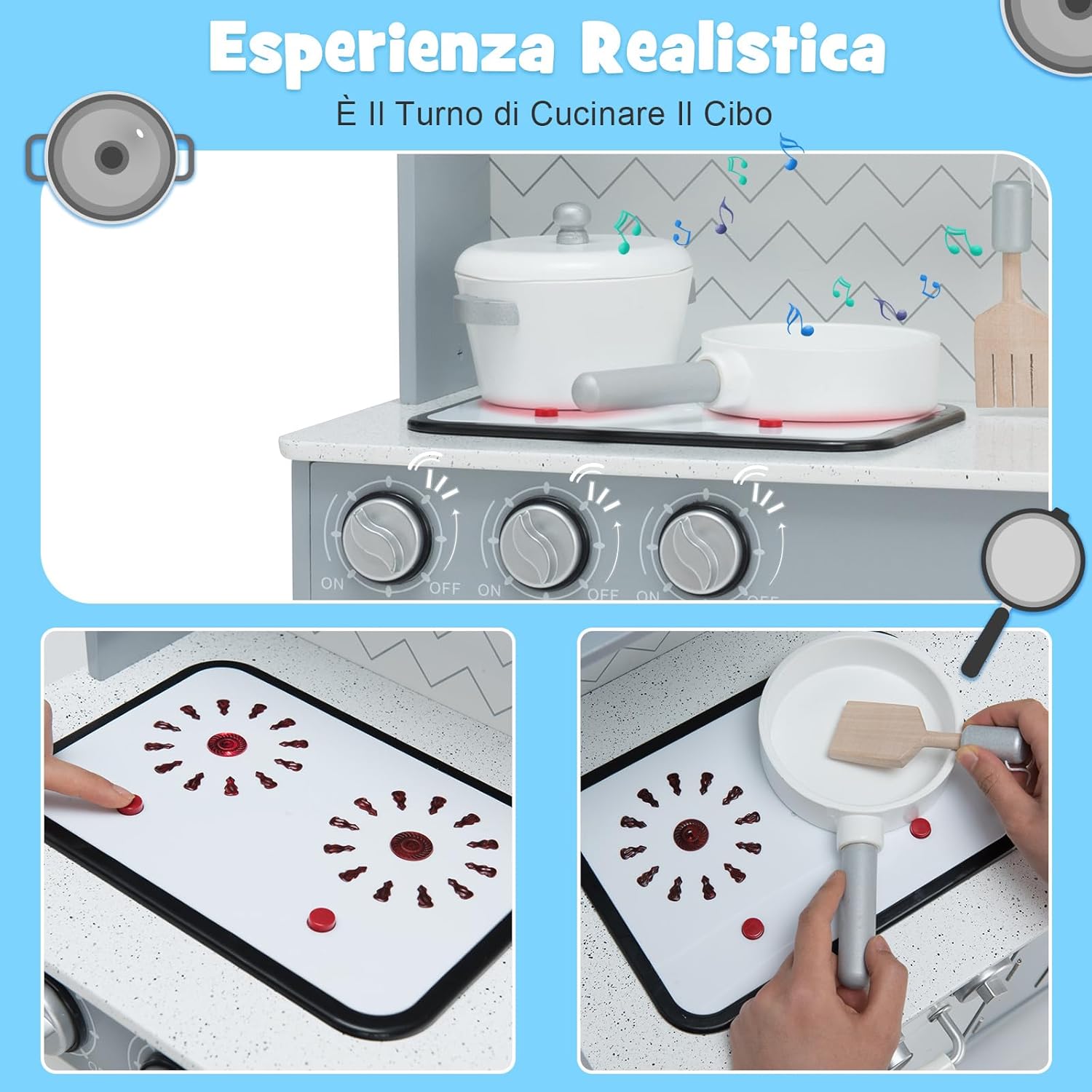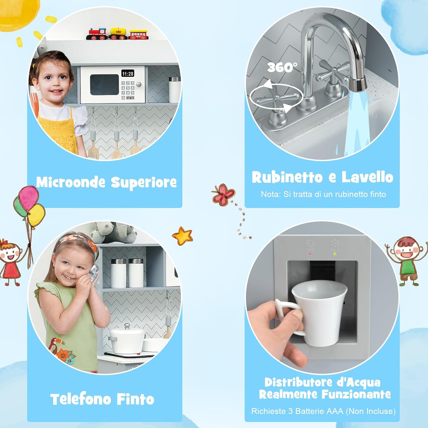 # Divertimento senza fine per i bambini # Questa cucina da gioco per bambini comprende un forno a microonde, un distributore d'acqua, un rubinetto, un lavello, un piano cottura e un forno, ecc. Gli elettrodomestici da cucina funzionali, con luci e suoni, permettono ai bambini di vivere un'esperienza di cucina vivace senza subire danni dal calore. # Grande capacità e accessori aggiuntivi # Diversi armadietti offrono più spazio e organizzazione nella stanza. Gli armadietti con ante offrono molto spazio per riporre i giocattoli senza lasciare polvere. Abbiamo pensato anche a una pentola con coperchio, una padella, 3 utensili da cucina e un vecchio cellulare per intrattenere i bambini. # Materiali sicuri e di alta qualità # Questo giocattolo da cucina indipendente è realizzato in materiale MDF di alta qualità, squisitamente artigianale, resistente, inodore, sicuro e innocuo, non causa alcun danno ai bambini. Inoltre, non ci sono bave o bordi taglienti, il che protegge notevolmente la pelle delicata dei bambini. # Sviluppo attraverso il gioco # Giocare con la nostra cucina da gioco non solo fa divertire i bambini, ma stimola anche la loro immaginazione facendoli entrare in ruoli diversi. Inoltre, migliora le abilità sociali e ha un effetto positivo sulle funzioni manuali dei bambini. È un regalo perfetto per le vacanze! # Facile installazione e pulizia # Per facilitare l'installazione, forniamo istruzioni dettagliate e confezioni di viti di alta qualità. Inoltre, la superficie liscia è priva di bave e può essere pulita con un panno umido.
