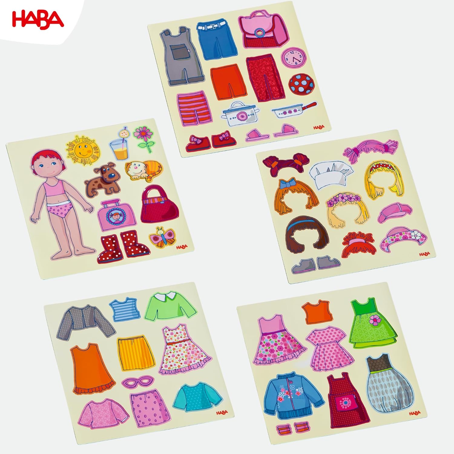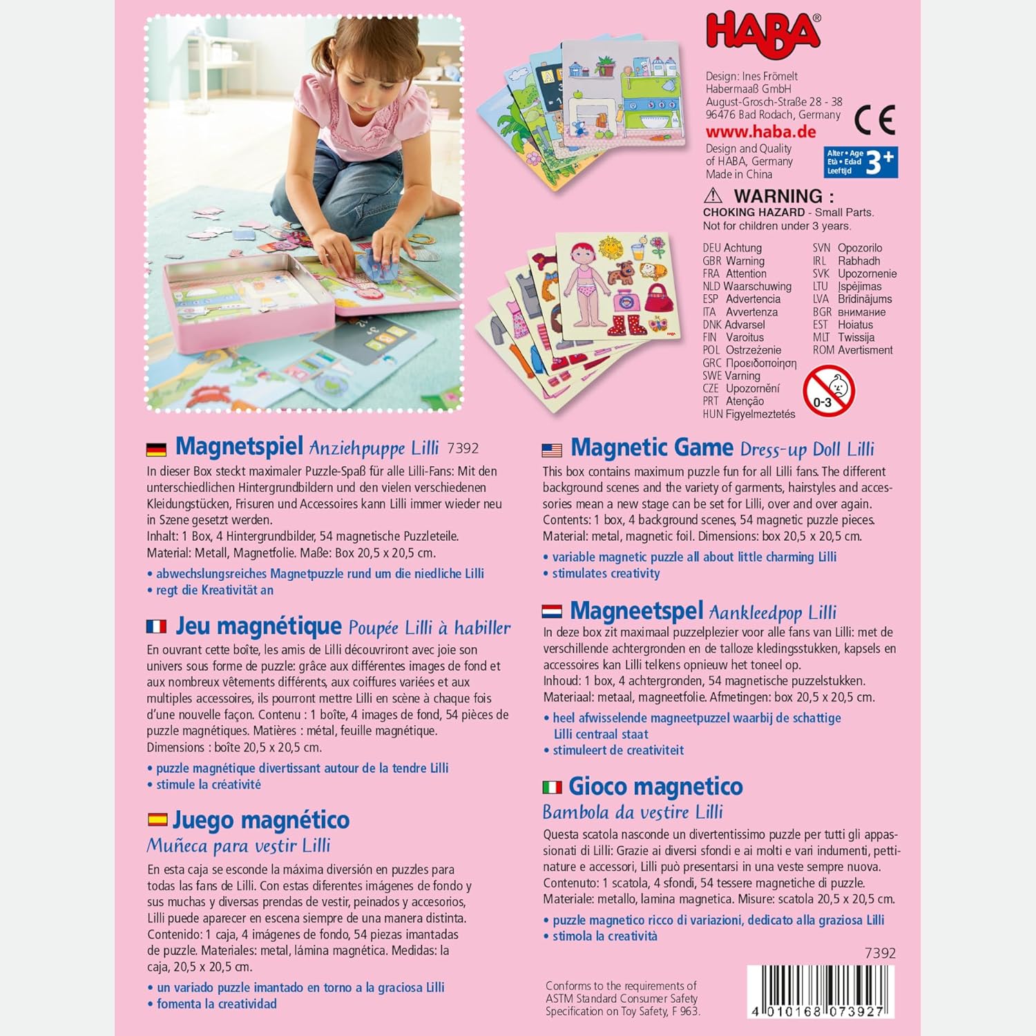 Grazioso gioco magnetico per la bambola Lilli con molti accessori. Scatola con 4 bellissime immagini di sfondo e 54 pezzi di puzzle magnetici. La pratica scatola di metallo è la superficie di gioco e scatola dove riporre il gioco. I vestiti, le acconciature e gli accessori magnetici della bambola Lilli si possono sempre attaccare e ri-attaccare senza fatica. Stimola la creatività e la gioia dei bambini dai 3 anni in su.