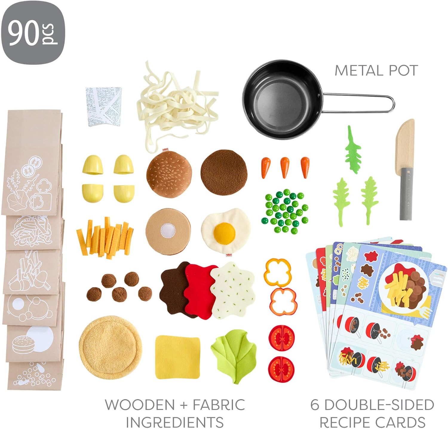 INGREDIENTI VARI: La Fresh Box contiene numerosi alimenti colorati in legno e tessuto: da patatine fritte e hamburger a piadine, ramen, verdure e patate. AVVENTURE DI CUCINA COME GLI ADULTI: i bambini possono vestire i panni di uno chef e provare numerose idee di ricette, ideali per giochi di ruolo su come cucinare e mangiare. SCHEDE CON RICETTE INCLUSE: schede dal design visivo mostrano le singole fasi di cottura e ti incoraggiano a ricreare ricette o provare nuove creazioni. PROMUOVE LO SVILUPPO DEL LINGUAGGIO: allena l'immaginazione e la creatività, rafforza le abilità sociali e insegna le prime situazioni quotidiane quando si gioca insieme ad amici e familiari. COMBINABILE: si adatta perfettamente ai negozi e come complemento alla cucina da gioco HABA Creative Play (set 3 in 1 - articolo 2011830001) o come varia idea regalo.