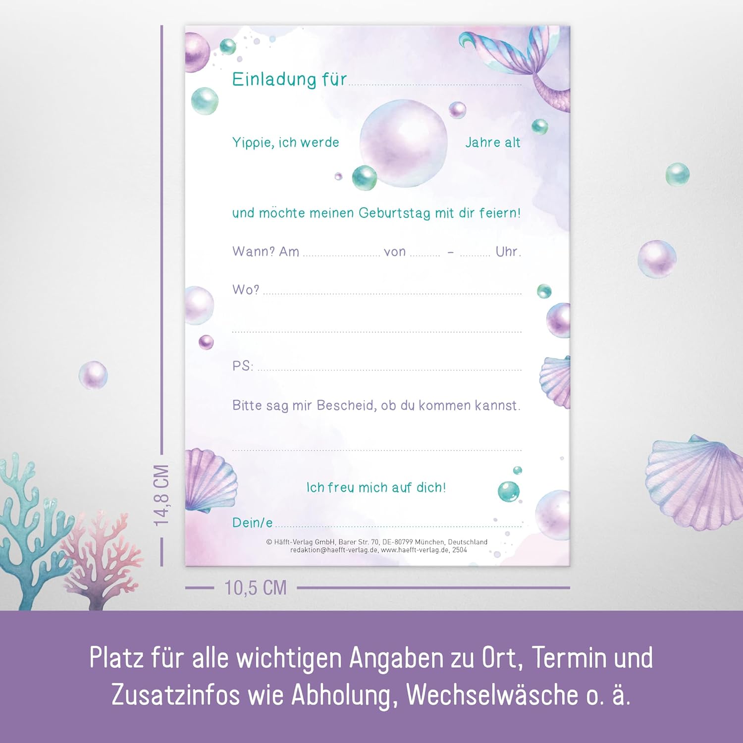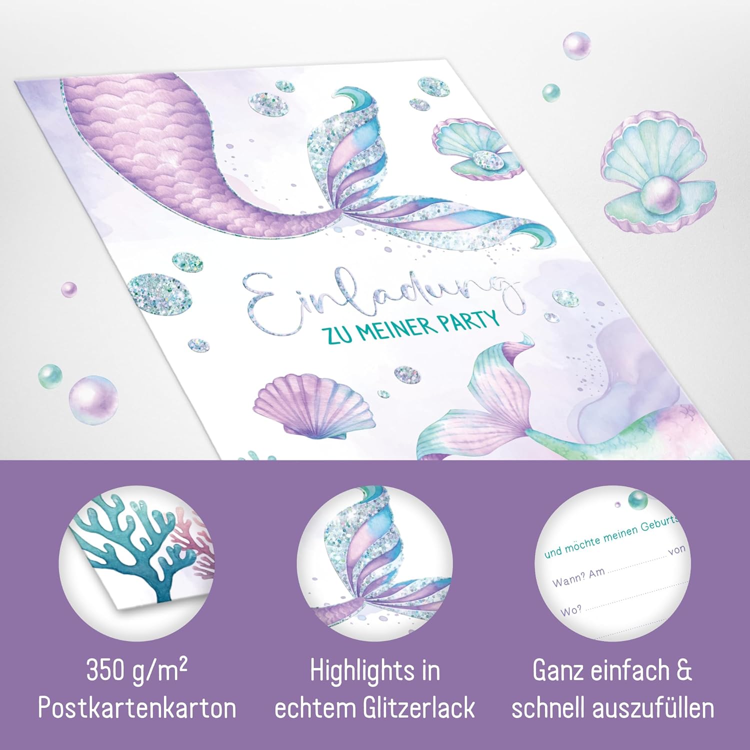 🎉 12 x BIGLIETTI D'INVITO SIRENA - Formato compatto DIN A6 in formato cartolina (10,5 x 14,8 cm), ideale per mani piccole e grandi aspettative di compleanno! 🎉 ATTRATTORI RADIANTI - Cartoncino di alta qualità da 350 g/m² con vera vernice glitterata sulla parte anteriore - per far brillare gli occhi dei bambini e degli ospiti che compiono gli anni. 🎉 RISPARMIA TEMPO, PIANIFICA DIVERTIMENTO - Cancella i campi per informazioni importanti come posizione, data e informazioni extra (ad esempio cambio di vestiti o orario di ritiro) - compilati in modo pratico e rapido. 🎉CIAO ANTICIPAZIONE - Biglietti d'invito con disegni creativi, perfettamente coordinati con i temi popolari dei compleanni dei bambini. Basta compilarlo, distribuirlo e che l'attesa abbia inizio! 🎉 SOSTENIBILE E RISPETTOSO DEL CLIMA - Pianifica con la coscienza pulita: il nostro cartone da 350 g/m² è certificato FSC (FSC N004440) e stampato in modo rispettoso del clima.