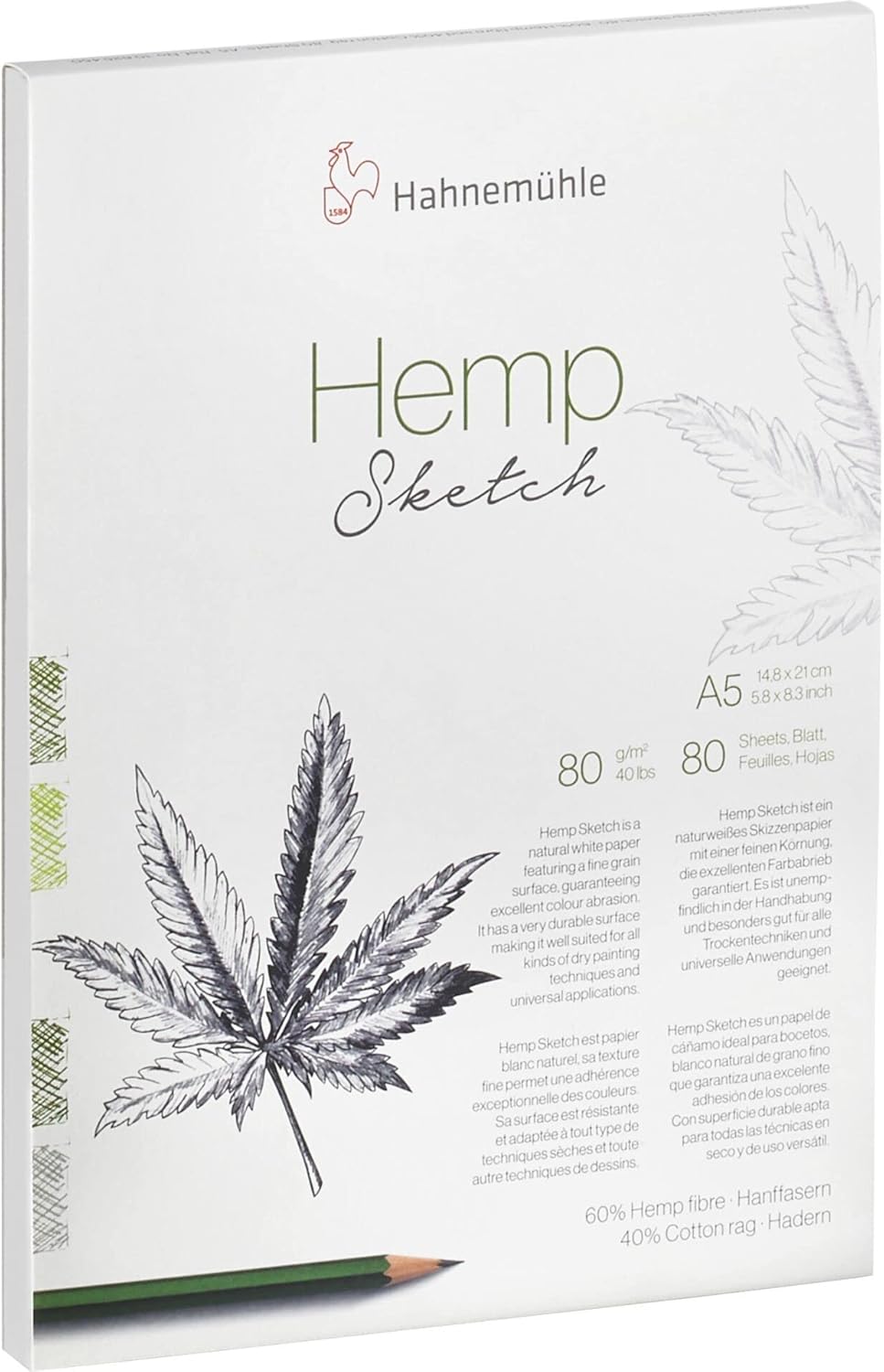 80 sheets of high quality 80gsm sketch paper made from hemp Acid free, age resistant, and vegan Fine grain paper with excellent color abrasion for sketching & drawing Fast growing hemp is sustainable while conserving slow growing resources Size A5 measures 5.8x8.3 in