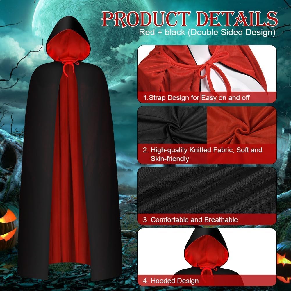 Halloween cape is a very well made Cape well designed being revisable so can be worn red or black it fits comfortably and is a good length so good especially at a Halloween party a must for anybody going to a Halloween party or wanting to dress up in a cape very good quality very well made