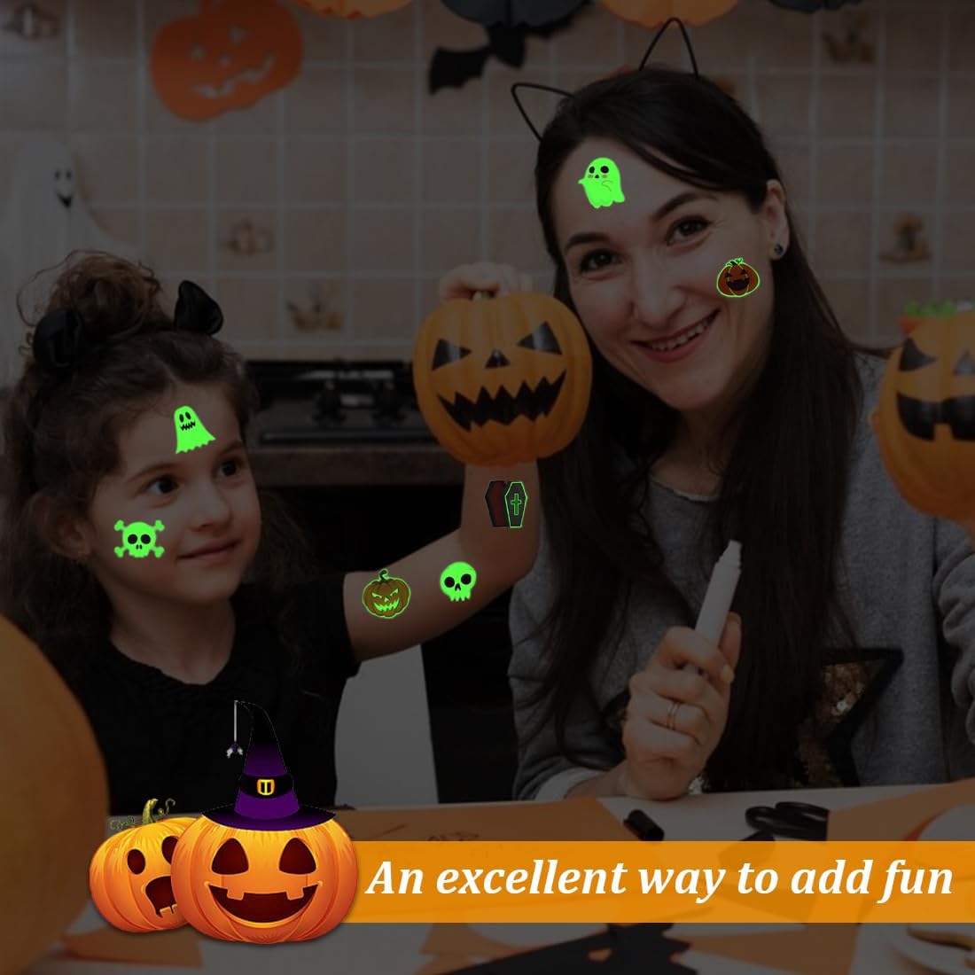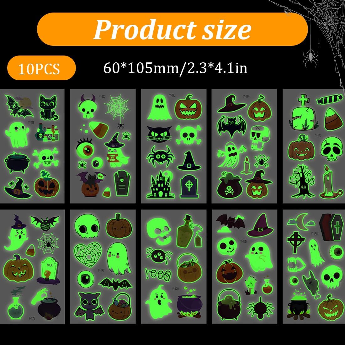 👻Confezione di tatuaggi di Halloween grandi: include 10 tatuaggi fluorescenti a temperatura controllata con motivi come zombie, teschi, zucche, streghe e altri elementi di Halloween. 👻Articoli per feste di Halloween: questi tatuaggi fluorescenti ti faranno distinguere dalla massa, anche al buio o a una festa. I bambini possono divertirsi con feste di compleanno, ritrovi e giochi senza preoccupazioni. 👻Consiglio: illuminare i tatuaggi con la luce del sole o con la luce del sole qualche minuto prima li renderà ancora più belli al buio. 👻Decorazioni di Halloween per bambini: questi tatuaggi temporanei possono essere usati come riempitivi per sacchetti regalo di Halloween, giocattoli di Halloween e oggetti di scena di Halloween, rendendoli perfetti per decorazioni per feste di Halloween, articoli per feste di Halloween, decorazioni per compleanni di Halloween e giochi di Halloween per bambini. 👻Sicuro e duraturo: realizzato con carta di alta qualità e inchiostro ecologico, questo tatuaggio temporaneo è sicuro e non tossico, facile da usare e non si stacca facilmente. Dura dai 3 ai 5 giorni o più. Questi tatuaggi per bambini sono delicati sulla pelle, impermeabili e resistenti.