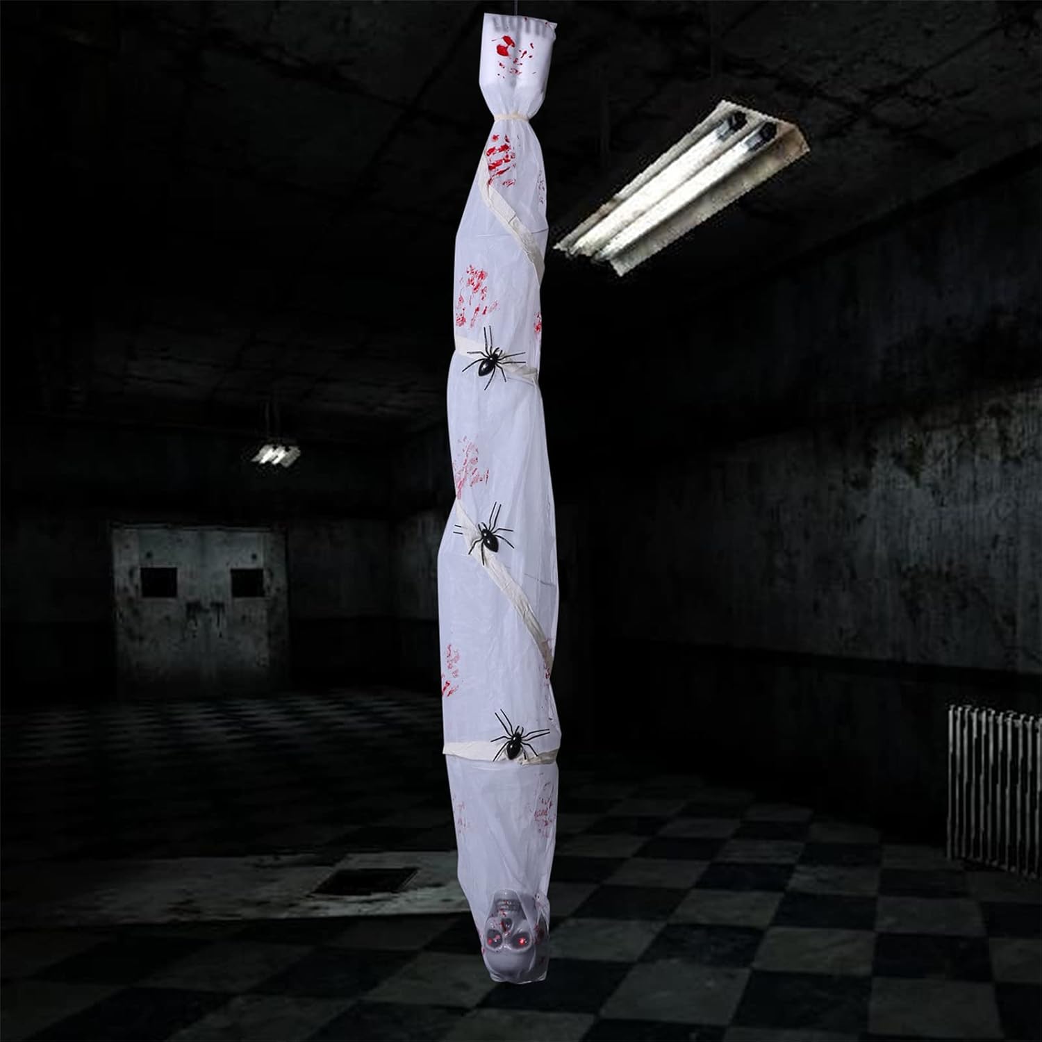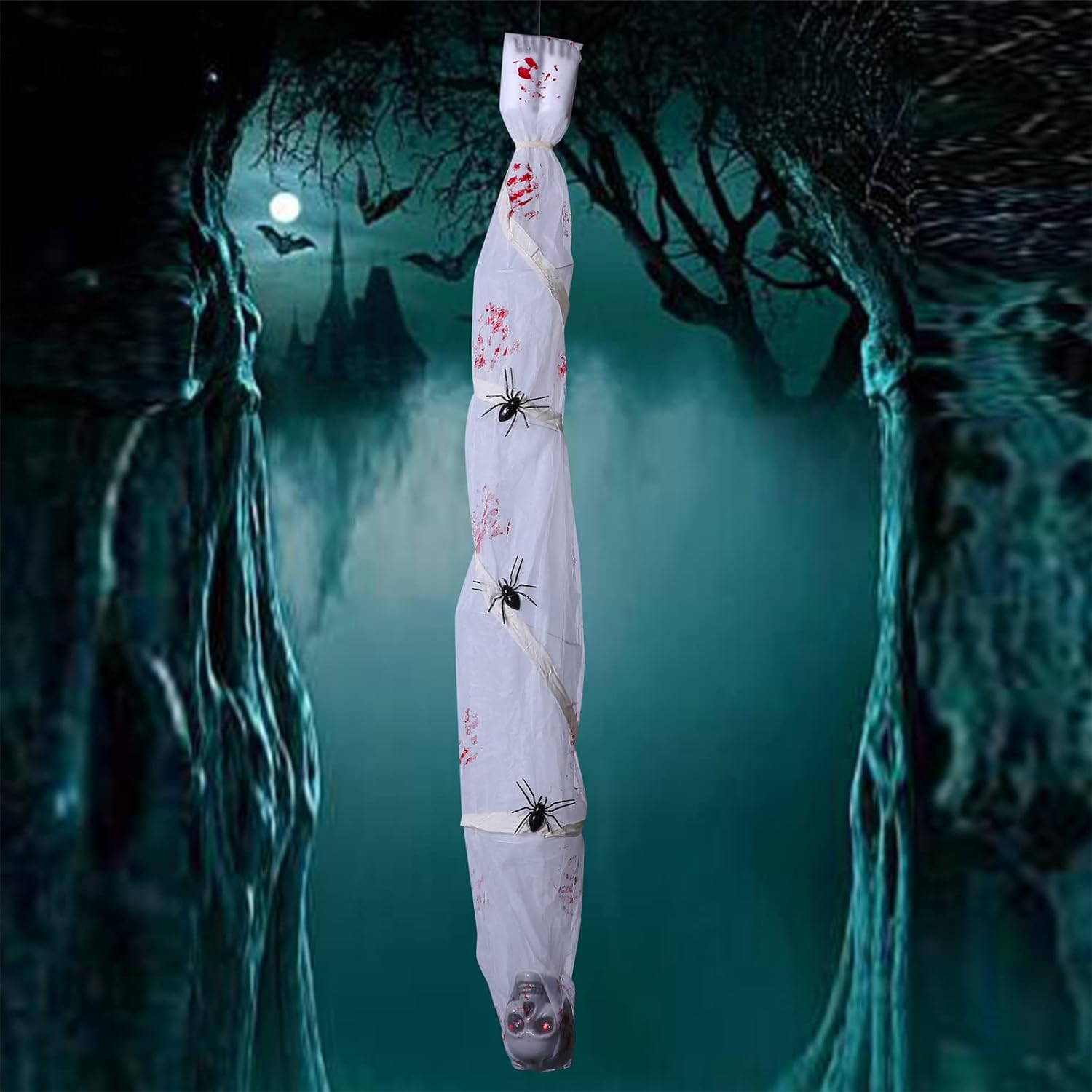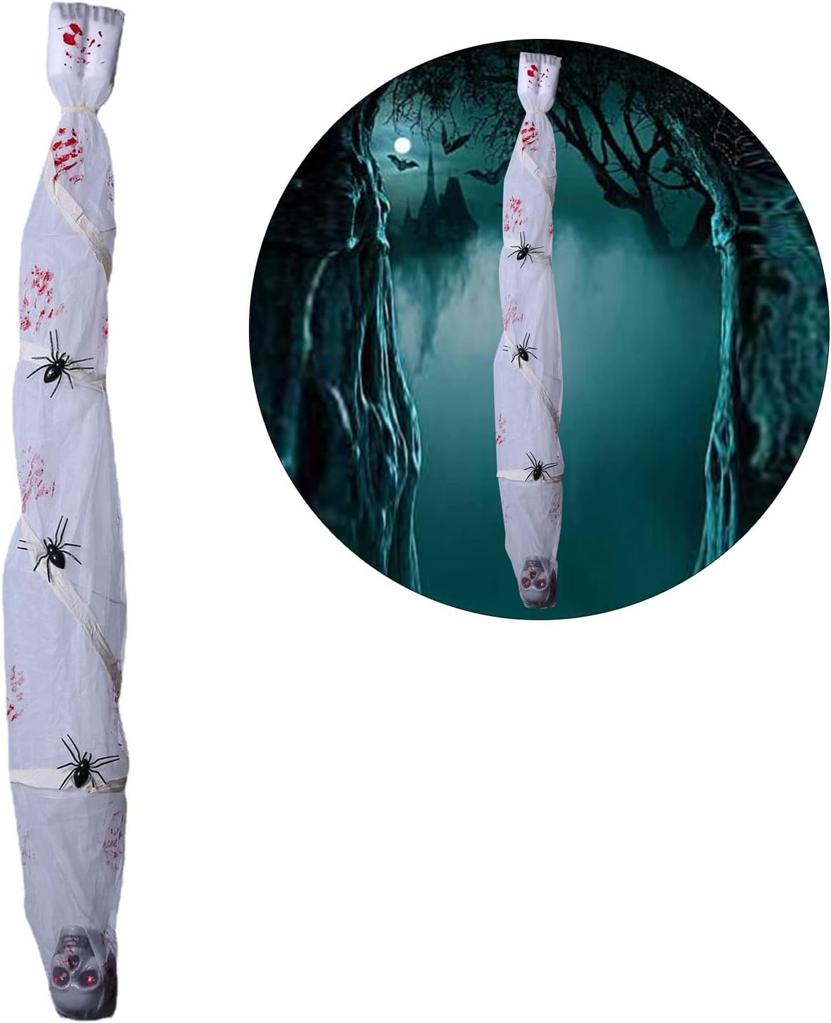Evidenzia il tuo arredamento di Halloween con questa decorazione da appendere mummia incandescente attivata dal suono. Ideale per gli appassionati di horror e gli appassionati di Halloween che vogliono portare le loro decorazioni al prossimo tessuto, questo accessorio da appendere presenta un design realistico a forma di mummia che è per decorazioni a tema escape room. in un angolo buio o vicino a un nascosto per sorprendere e spaventare i tuoi ospiti con i suoi occhi luminosi attivati dal suono e suoni lamentosi inquietanti. per decorare la casa, l'ufficio o qualsiasi spazio in cui si desidera creare un