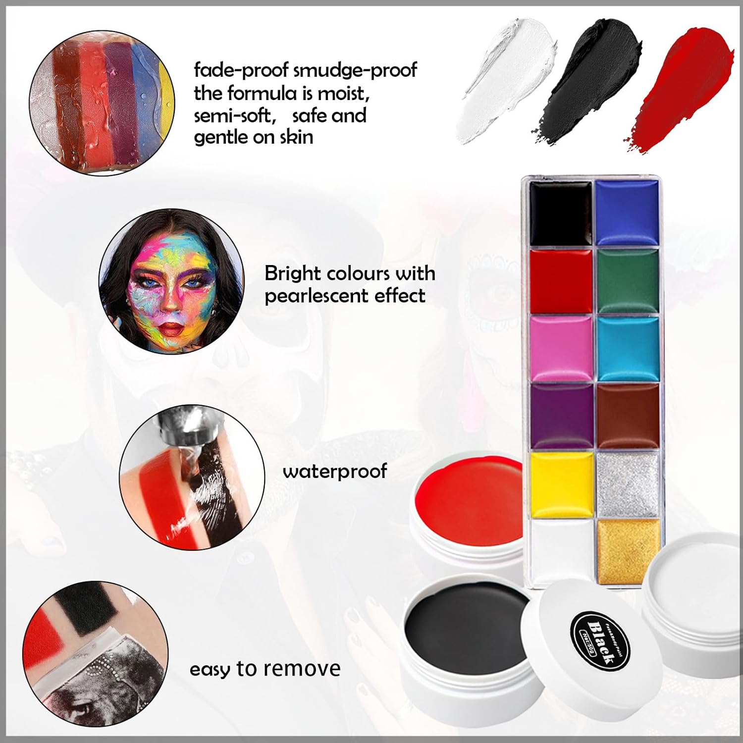 【Set di Halloween】Halloween sangue finto set contiene trucco Viso Rosso Nero Bianco, Vernice per il Corpo per Lividi 12 Colori, 5 spazzola, 4 modelli dipinti. Fornendo tutto il necessario per un look realistico di Halloween. 【Materiali sicuri】La trucchi halloween nostra pittura per il viso è realizzata con materiali di alta qualità, delicato sulla pelle, non provoca prurito o irritazione, ha una consistenza morbida e delicata. Sicuro da usare ovunque sulla pelle, sul viso e sui vestiti. 【Materiali sicuri】La trucchi halloween nostra pittura per il viso è realizzata con materiali di alta qualità, delicato sulla pelle, non provoca prurito o irritazione, ha una consistenza morbida e delicata. Sicuro da usare ovunque sulla pelle, sul viso e sui vestiti. 【Facile da usare】La nostra vernice per il viso è facile da usare e può essere applicata sulla pelle con una spugna, un pennello o con la punta delle dita. Dopo aver finito il trucco, si consiglia di utilizzare la polvere sciolta per fissare il trucco per ottenere risultati migliori! I pigmenti si rimuovono facilmente con acqua tiepida e sapone. 【Facile da usare】La nostra vernice per il viso è facile da usare e può essere applicata sulla pelle con una spugna, un pennello o con la punta delle dita. Dopo aver finito il trucco, si consiglia di utilizzare la polvere sciolta per fissare il trucco per ottenere risultati migliori! I pigmenti si rimuovono facilmente con acqua tiepida e sapone.