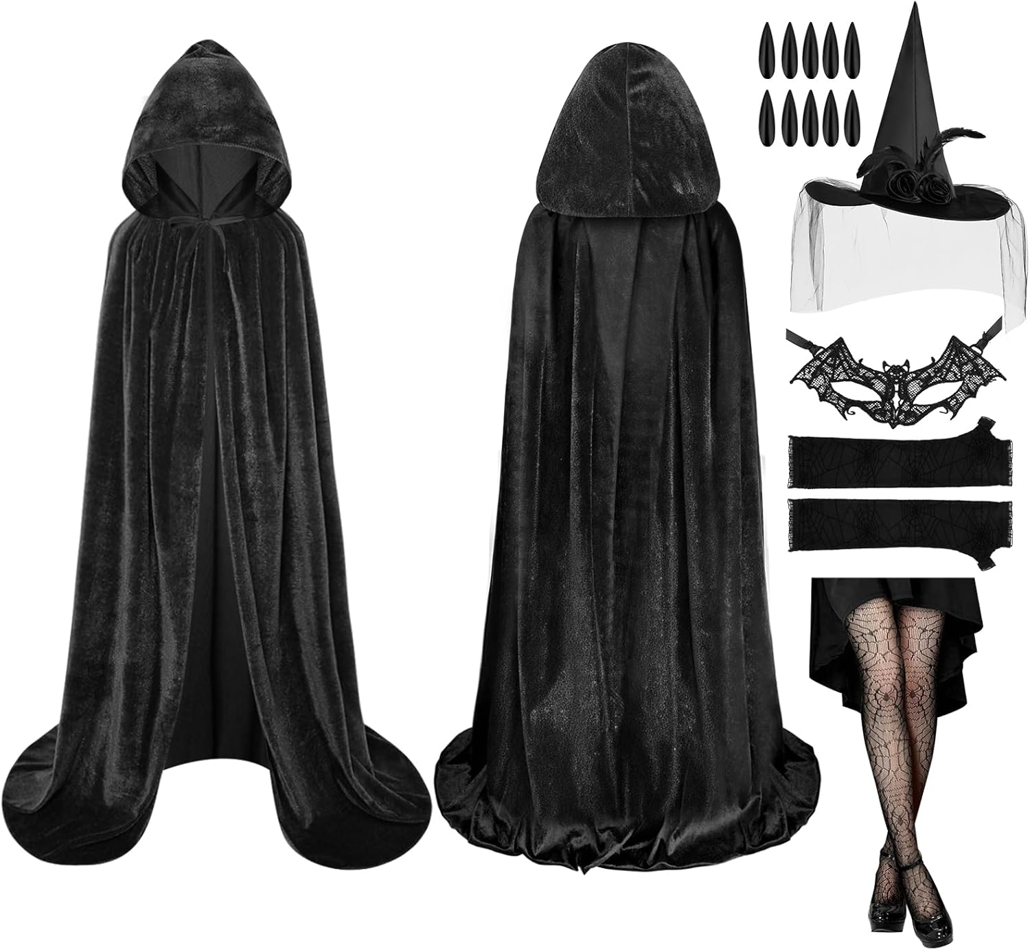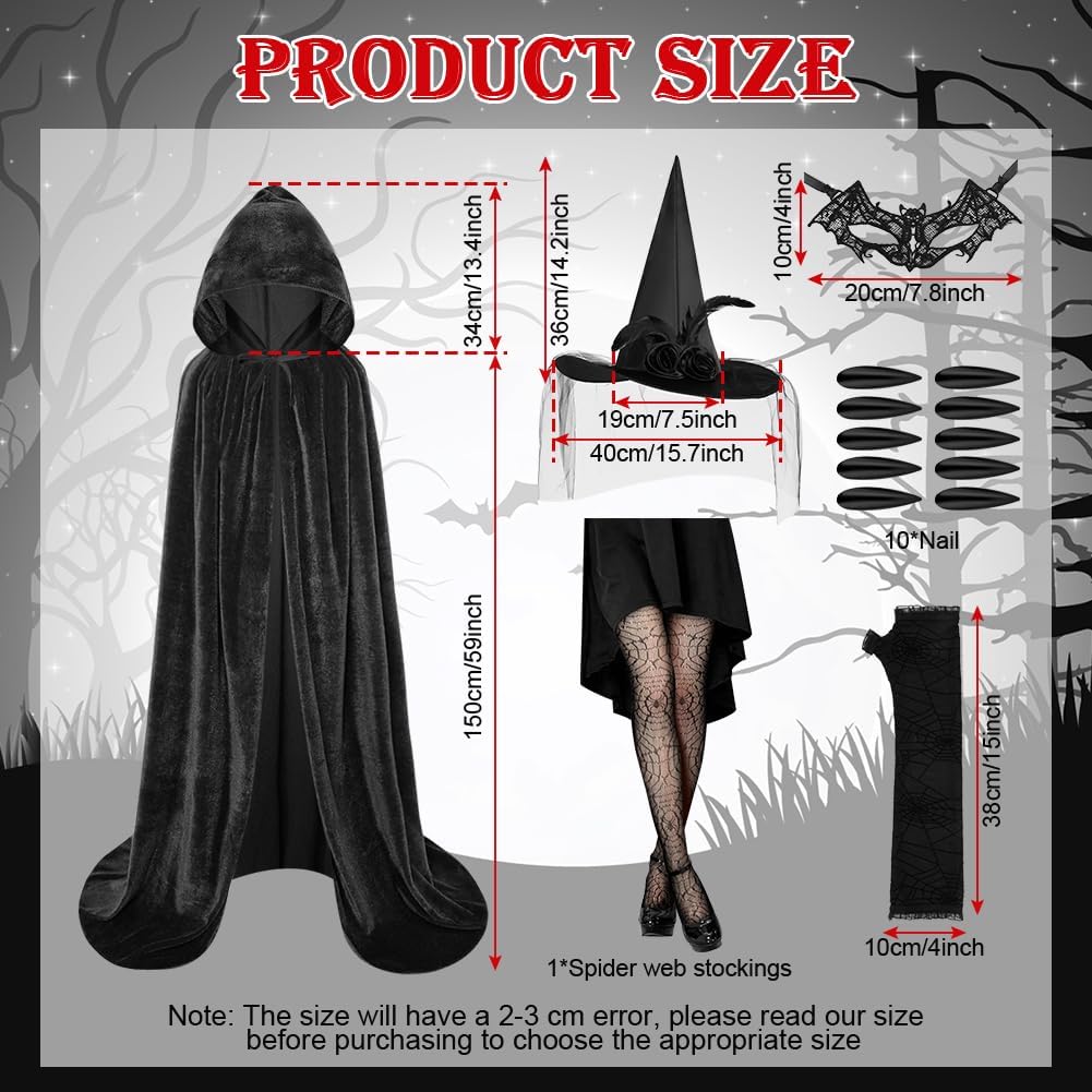 CARATTERISTICA: - Il lungo mantello di Halloween è adatto a persone di tutte le corporature, soddisfacendo le tue esigenze di gioco di ruolo e aggiungendo un tocco di mistero alla festa. - Il mantello da strega per adulti di Halloween è dotato di spalline regolabili, basta legarlo al collo per fissarlo sulle spalle, adatto per l'uso domestico, oppure puoi indossarlo in base alla tua personalità, per un'esperienza più confortevole. - Questo mantello da vampiro è adatto a qualsiasi festa a tema gotico, Halloween, mascherata, vampiro, strega, festa in maschera, mago, personaggio misterioso e altri luoghi. SPECIFICA: Quantità: 6 set Dimensioni del prodotto Parte del cappello: 34 cm Lunghezza del mantello: 100/150 cm Cappello da mago: diametro grande 40 cm/diametro piccolo 19 cm, altezza: 36 cm Guanti: 38*10 cm Maschera: 20*10 cm Unghie nere: 19*15 cm (parte in cartone) Materiale: 100% poliestere Colore: nero AVVISO: 1. Poiché le dimensioni vengono misurate manualmente, si prega di considerare un margine di errore di 1-3 cm. 2. A causa delle diverse luci e del display, potrebbe esserci una leggera differenza di colore, fare riferimento al colore reale.