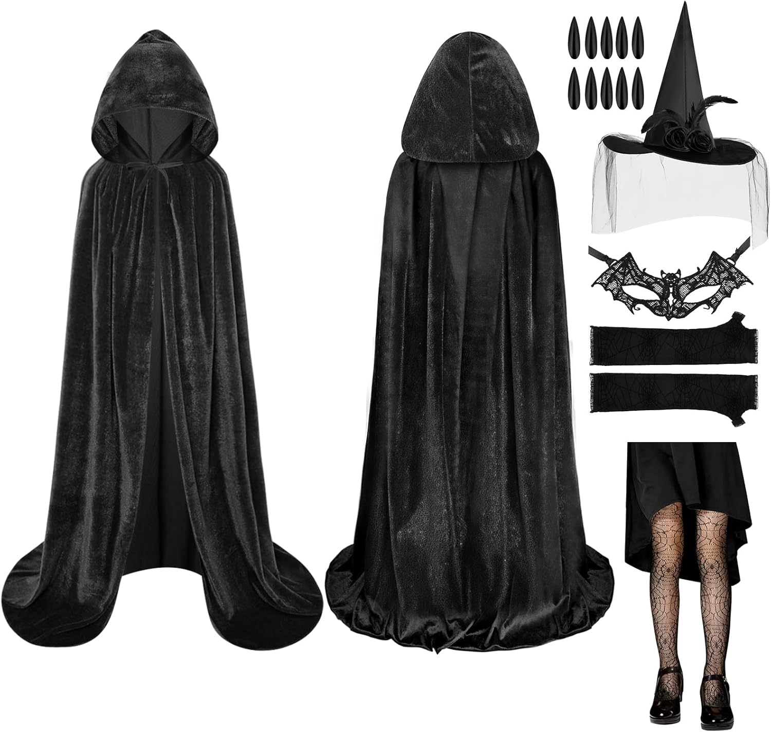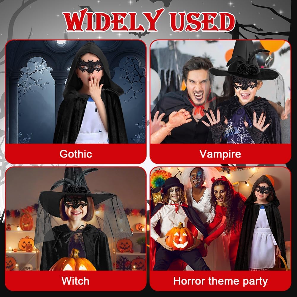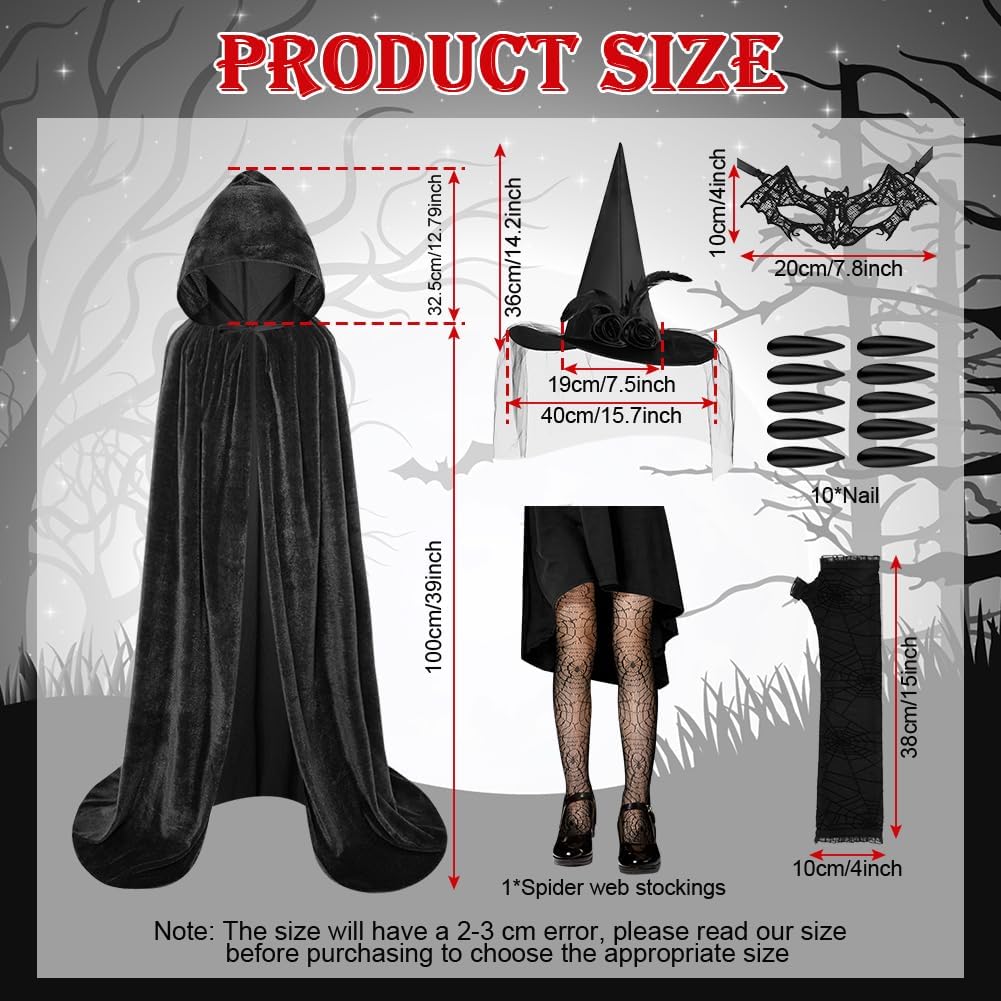 CARATTERISTICA: - Il lungo mantello di Halloween è adatto a persone di tutte le corporature, soddisfacendo le tue esigenze di gioco di ruolo e aggiungendo un tocco di mistero alla festa. - Il mantello da strega per adulti di Halloween è dotato di spalline regolabili, basta legarlo al collo per fissarlo sulle spalle, adatto per l'uso domestico, oppure puoi indossarlo in base alla tua personalità, per un'esperienza più confortevole. - Questo mantello da vampiro è adatto a qualsiasi festa a tema gotico, Halloween, mascherata, vampiro, strega, festa in maschera, mago, personaggio misterioso e altri luoghi. SPECIFICA: Quantità: 6 set Dimensioni del prodotto Parte del cappello: 34 cm Lunghezza del mantello: 100/150 cm Cappello da mago: diametro grande 40 cm/diametro piccolo 19 cm, altezza: 36 cm Guanti: 38*10 cm Maschera: 20*10 cm Unghie nere: 19*15 cm (parte in cartone) Materiale: 100% poliestere Colore: nero AVVISO: 1. Poiché le dimensioni vengono misurate manualmente, si prega di considerare un margine di errore di 1-3 cm. 2. A causa delle diverse luci e del display, potrebbe esserci una leggera differenza di colore, fare riferimento al colore reale.