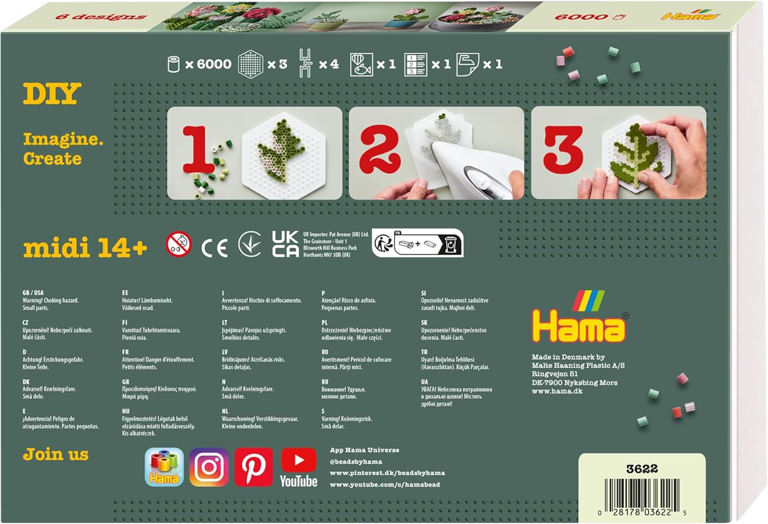 La forza speciale dei prodotti Hama è che sono educativi. Non sono solo giocattoli ordinari. Sfidano le capacità motorie dei bambini, la creatività e allenano la loro capacità di concentrazione. I bambini sviluppano le loro abilità più elementari durante il loro primo anno di vita. Imparano a riconoscere i colori, afferrare piccoli oggetti, distinguere una forma dall'altra, farsi un'idea delle quantità e così via. Ed è in questa giovane età che i prodotti Hama entrano davvero nella loro forma come giocattolo educativo. Hama i prodotti offrono ai bambini di tre anni una sfida creativa. Hama è progettato e adattato per seguire lo sviluppo del bambino, a partire dai tentativi del bambino di controllare le capacità motorie. Poi, man mano che il bambino cresce, i prodotti Hama passano gradualmente da giocattoli educativi a hobby creativi. HAMA EST. 1971: I prodotti Hama vengono sviluppati e fabbricati a Nykøbing Mors in Danimarca, dove ha sede anche la nostra distribuzione. Siamo orgogliosi di fornire costantemente un prodotto sicuro e di alta qualità che è pienamente conforme agli standard UE.