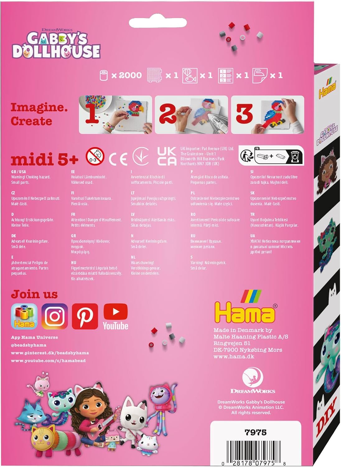 ESPERIENZA ARTIGIANALE A TEMA CON LA DOLLHOUSE DI GABBY Immergi i bambini nell'incantevole mondo della casa delle bambole di Gabby mentre si impegnano nel processo creativo. L'inclusione del tema Dollhouse di Gabby aggiunge un ulteriore livello di eccitazione all'esperienza di creazione, consentendo ai bambini di connettersi con personaggi e scene del popolare spettacolo esprimendo il loro tocco artistico. Narrazione interattiva attraverso fogli di design: il foglio di design stampato funge da guida creativa per i bambini e stimola anche la narrazione fantasiosa. I bambini possono seguire i disegni suggeriti ispirati ai personaggi della casa delle bambole di Gabby o usarli come trampolino di lancio per le loro narrazioni uniche, promuovendo sia l'espressione artistica che il gioco fantasioso. Divertimento educativo con istruzioni passo passo: il kit viene fornito con istruzioni chiare e facili da seguire, consentendo ai bambini di creare autonomamente i loro capolavori di mosaico. Questo aspetto educativo favorisce un senso di realizzazione e aumenta la fiducia quando i bambini completano con successo ogni passo, rafforzando la loro capacità di seguire le istruzioni e pensare in modo critico in un contesto giocoso e divertente. I bambini sviluppano le loro abilità più elementari durante il loro primo anno di vita. Imparano a riconoscere i colori, afferrare piccoli oggetti, distinguere una forma dall'altra, farsi un'idea delle quantità e così via. Ed è in questa giovane età che i prodotti Hama entrano davvero in gioco educativo. HAMA EST. 1971: i prodotti Hama vengono sviluppati e fabbricati a Nykøbing Mors in Danimarca, dove ha sede anche la nostra distribuzione. Siamo orgogliosi di fornire costantemente un prodotto sicuro e di alta qualità che è pienamente conforme agli standard UE.