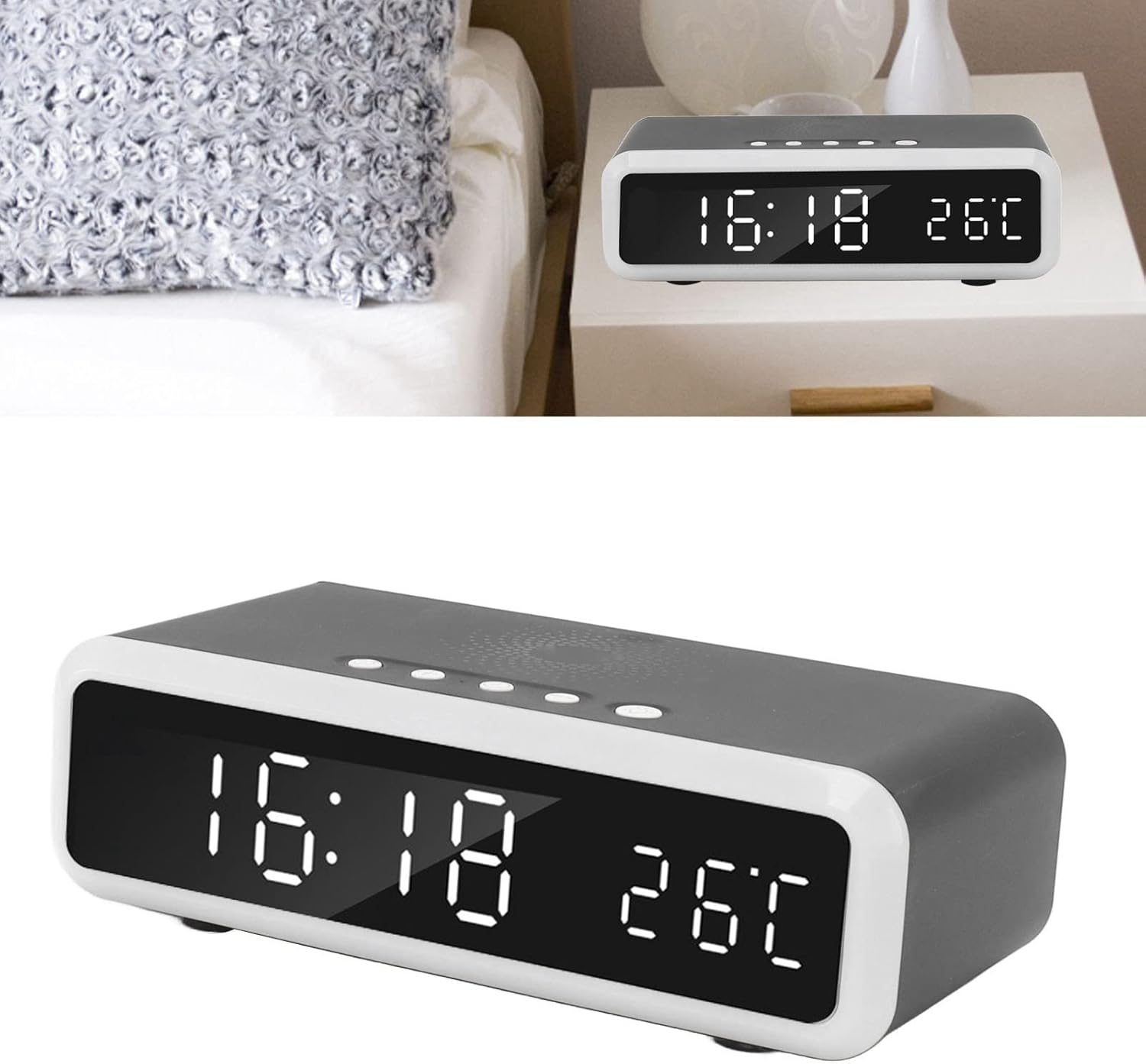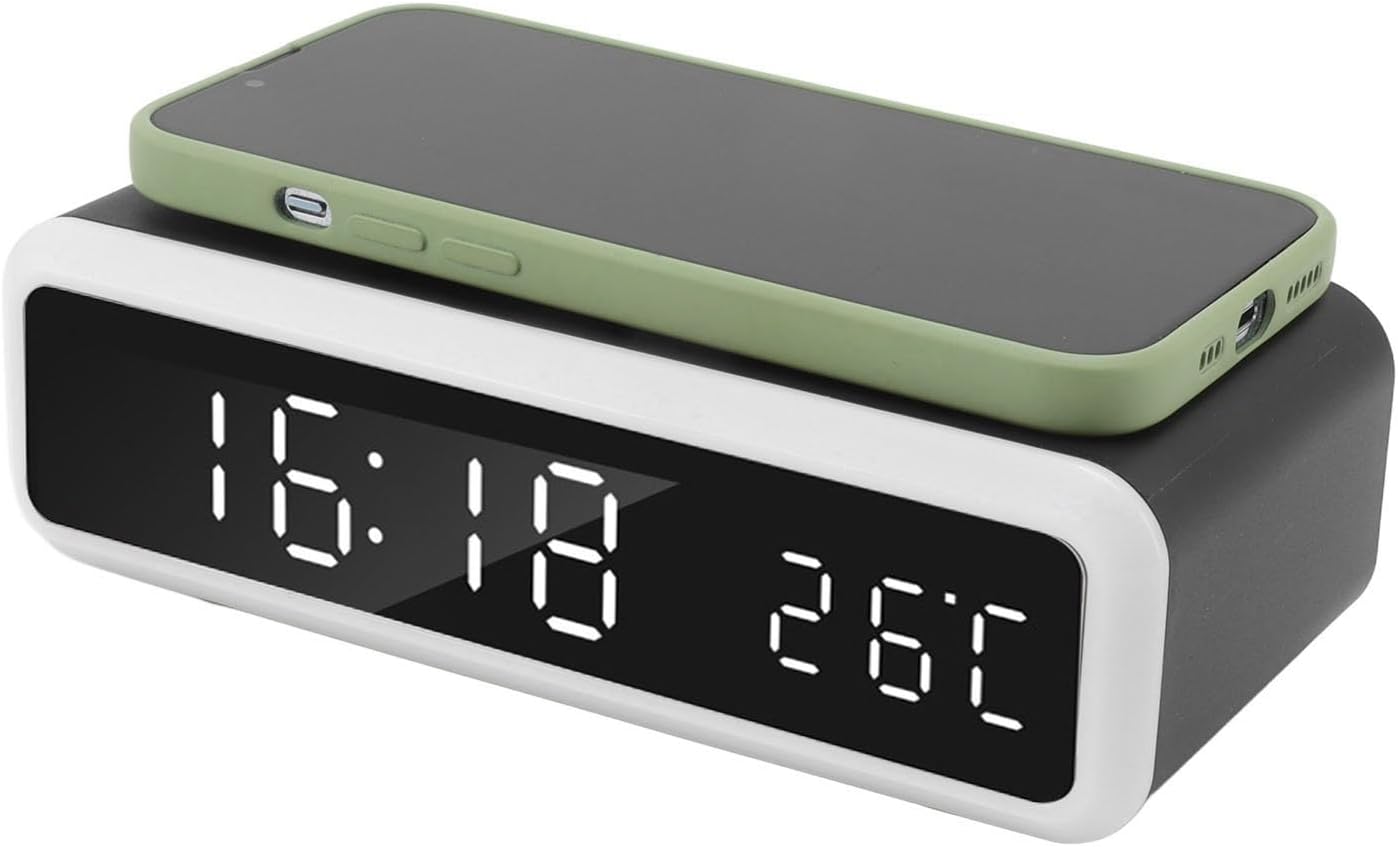 Visualizzazione della temperatura: visualizzazione in tempo reale del caricatore wireless della lampada da notte della temperatura interna, percezione sensibile della temperatura interna, cura della salute della famiglia. Display digitale HD: il caricatore della sveglia è 'interfaccia hd con display ad alto rapporto del 90%, ampio display digitale intuitivo, chiaro e luminoso, facile da usare. Sveglia: il pad del caricatore della sveglia può impostare la sveglia, ma il 12 ore non può impostare la sveglia, cambiare il 12 ore annullerà la sveglia impostata per 24 ore. 4 livelli: la luminosità della luce notturna del caricabatterie wireless della lampada da notte può essere regolata, interruttore a chiave, luce gialla calda, luce bianca morbida a scelta, accompagnarti a dormire calorosamente. Ricarica rapida: la sveglia multifunzionale è una ricarica super veloce ad alta potenza da 15 W, alta efficienza, ricarica rapida, supporto per IOS e per .