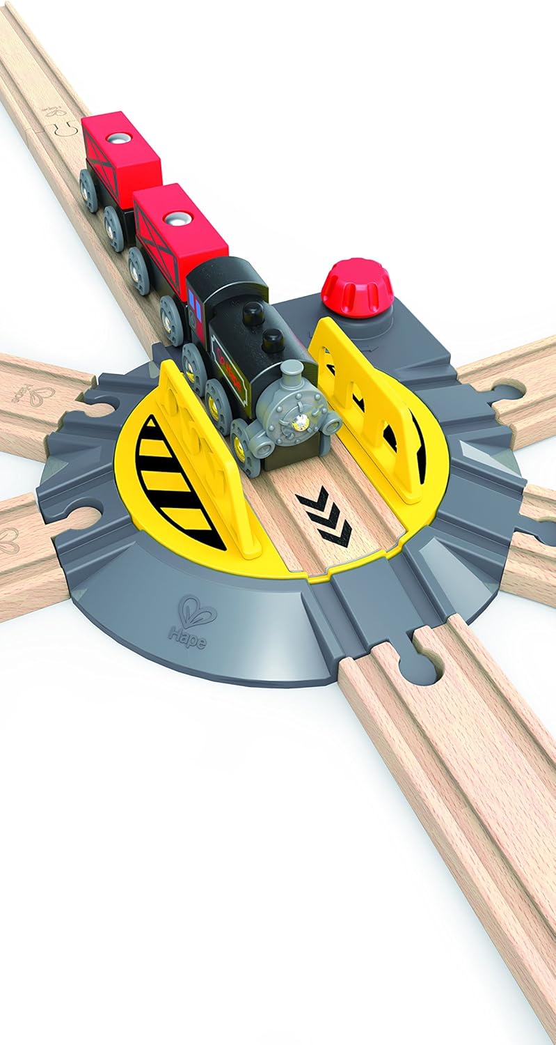 PIATTAFORMA DI SCAMBIO BINARI: Questa piattaforma girevole porta il set ferroviario di tuo figlio a un livello superiore. Robusta e facile da usare, permette di effettuare scambi a sei binari grazie alla manopola rossa. SUPPORTA LA MOTRICITÀ FINE: Manovrare la manopola e giocare con i trenini sono attività utili allo sviluppo della coordinazione occhio-mano, delle capacità motorie fini e della consapevolezza spaziale. METTI LE BASI DEL PENSIERO SCIENTIFICO: Il movimento semplice e intuitivo della piattaforma girevole aiuta i bambini a comprendere le leggi di causa-effetto e stimola il pensiero logico-scientifico. Seleziona uno dei sei binari: in che direzione andrà il treno? INSEGNA LO STORY-TELLING: Giocare con i trenini è un ottimo modo di stimolare l‘immaginazione alla base del gioco di ruolo. Inventare storie aiuta a migliorare le abilità linguistiche, narrative e sociali dei bambini. MATERIALI SICURI, ROBUSTI E DI QUALITÀ: La piattaforma girevole di Hape è realizzata in legno e plastica vegetale di qualità. Le rifiniture curate nei minimi dettagli sono completate da colori brillanti ottenuti con vernici atossiche.