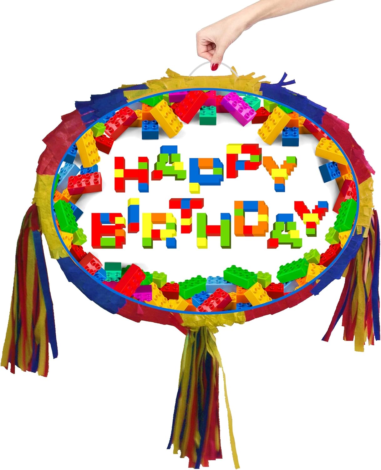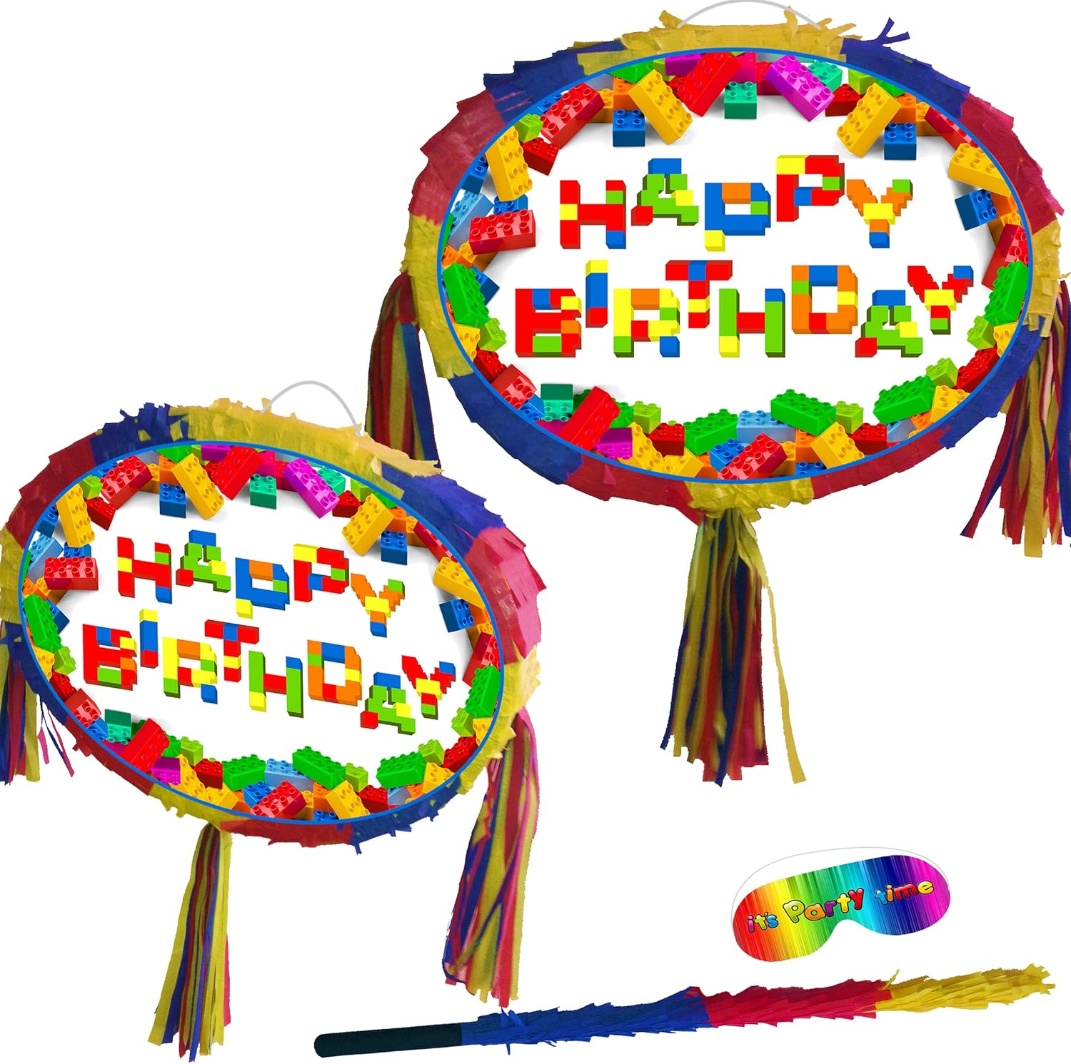 La pinata viene fornita con un bastone e una maschera di carta. La piñata include una finestra di riempimento e un anello di tenuta. Adatto sia a bambini che ad adulti. Taglia grande unisex, può contenere oggetti da 1-2 kg. Tema dei mattoncini Buon compleanno Design colorato e accattivante.