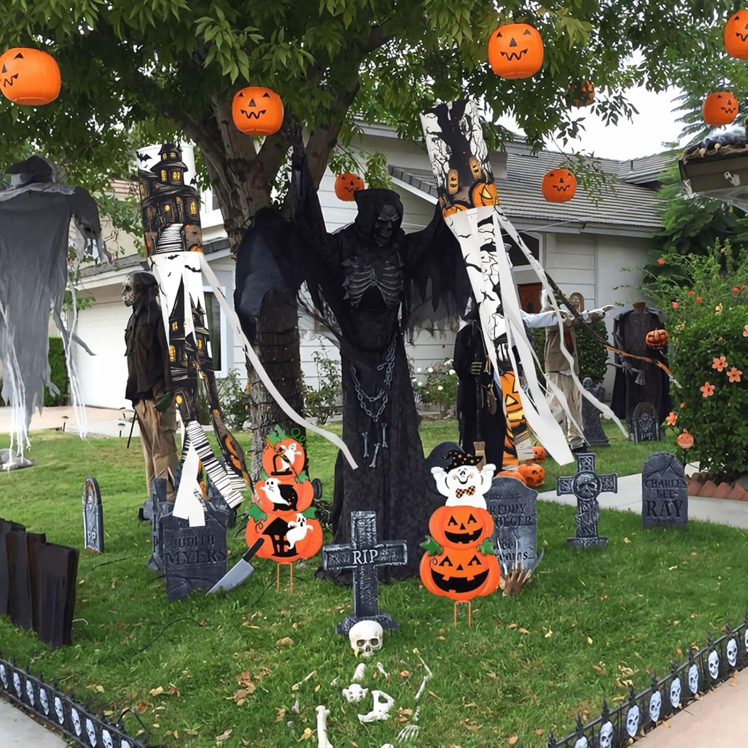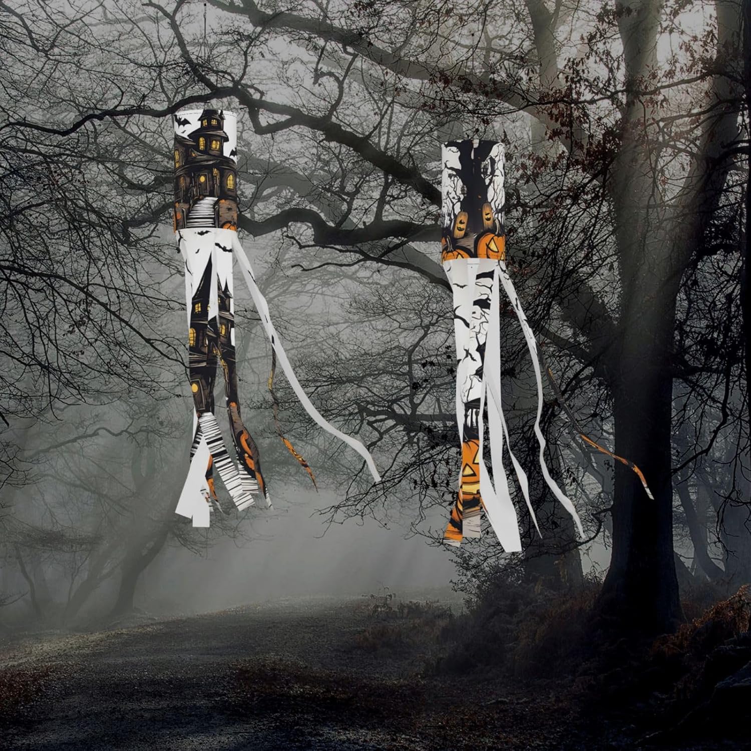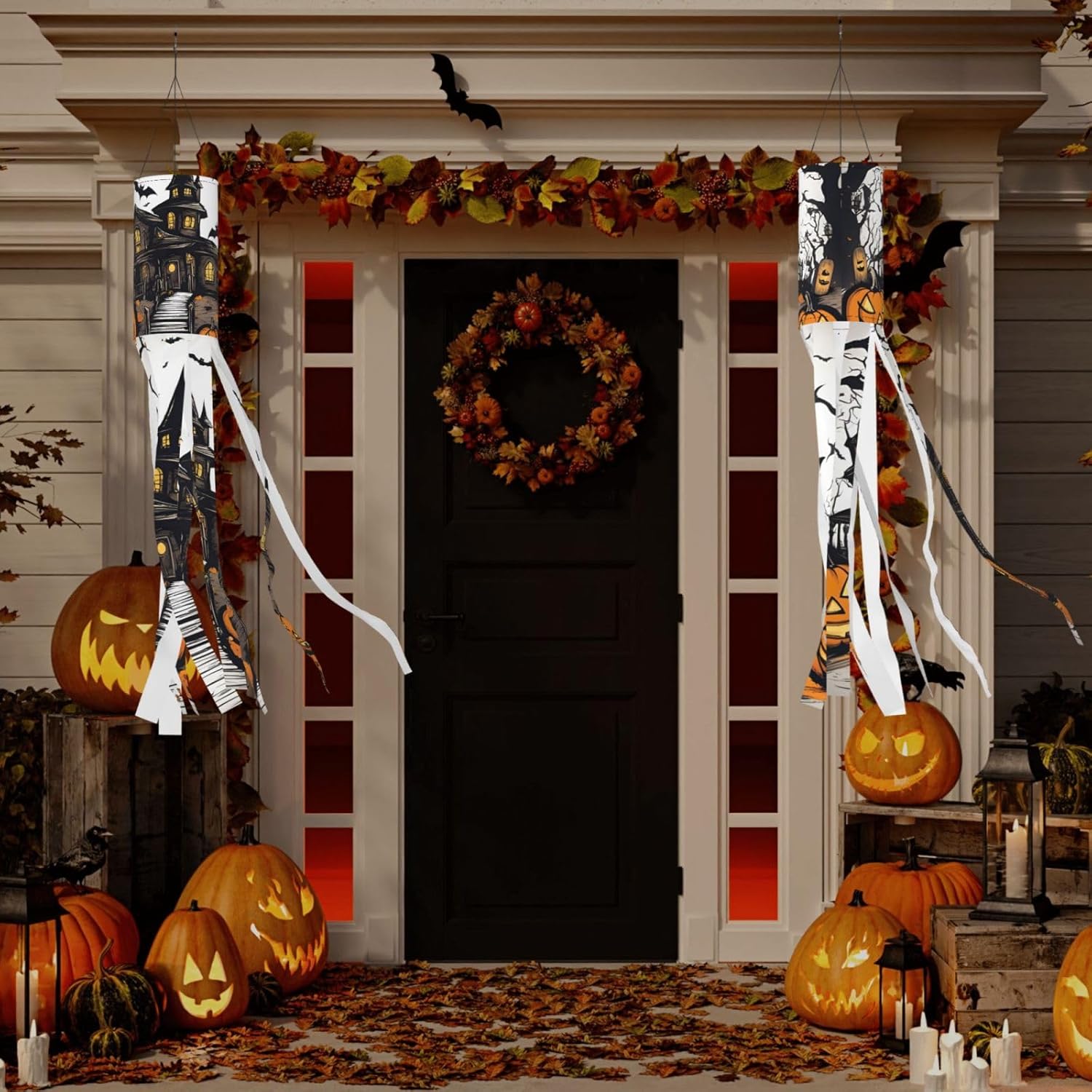 Happy-Halloween-Vector Deliziosa illuminazione esterna festiva: calze a vento da strega di Halloween per esposizione stagionale mozzafiato