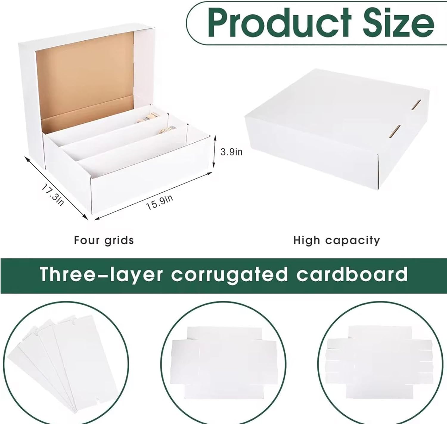 【Comodità】: la scatola di cartone presenta un design pre-piegato per un facile montaggio e smontaggio senza attrezzi 【Organizzazione】: la nostra scatola per la raccolta delle carte include scomparti multipli e spaziosi per ordinare e conservare separatamente diversi tipi di carte 【Protezione】: la scatola per carte presenta una struttura robusta e un'elegante finitura bianca per proteggere le carte da polvere e umidità 【Resistenza】: questa scatola portaoggetti è realizzata in carta ondulata spessa e ad alta resistenza per resistere alla deformazione 【Versatilità】: Questo porta carte collezionabili è ideale per riporre varie carte sportive