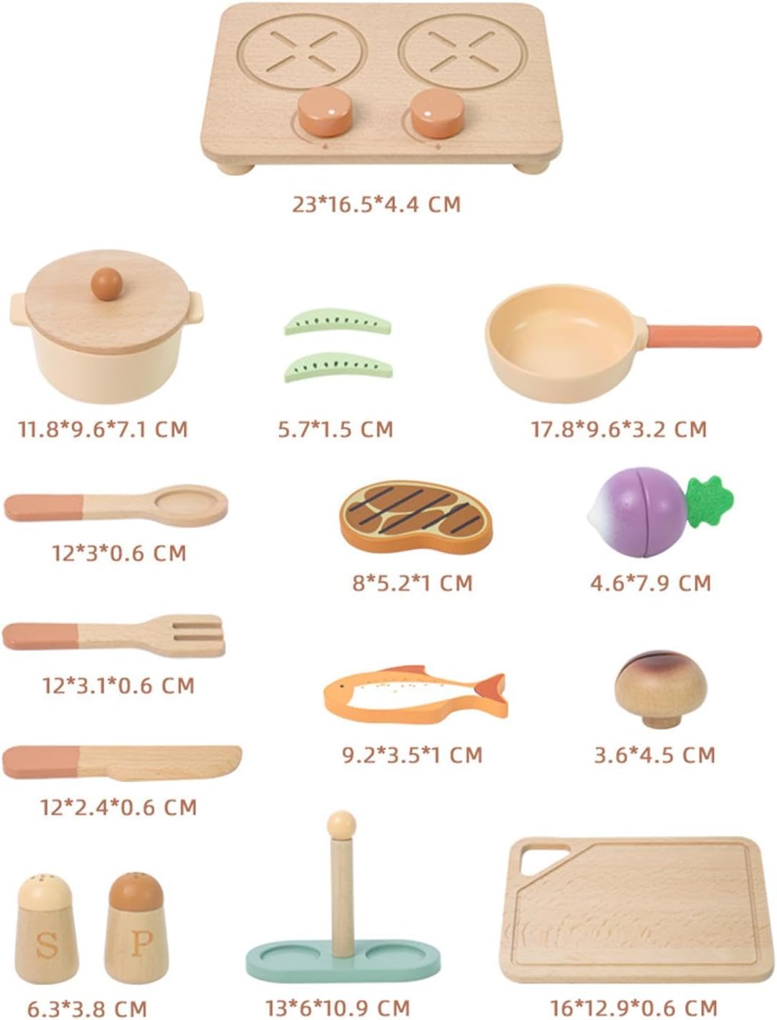 【Sviluppo e abilità fini】: Attraverso il set da gioco di giocattoli in legno da cucina, i bambini possono imparare a cucinare, esercitare abilità pratiche e capacità motorie fini 【Istruzione】: il set di giocattoli da cucina simulati aiuta il bambino a comprendere utensili da cucina e le sue capacità cognitive 【Gioco di ruolo interattivo】: i bambini possono giocare con il set di cucina finta con la famia o amici, giocare di ruolo, re le abilità sociali e le abilità culinarie di base 【Set da gioco da cucina】: giocattoli da cucina finti, inclusi stoviglie e modelli di cibo da cucina, come bistecche, uova, pesce per migliorare l'esperienza di gioco in cucina 【Scelta regalo】: il set di accessori da cucina per bambini è una scelta regalo per bambini, , ragazzi e ragazze