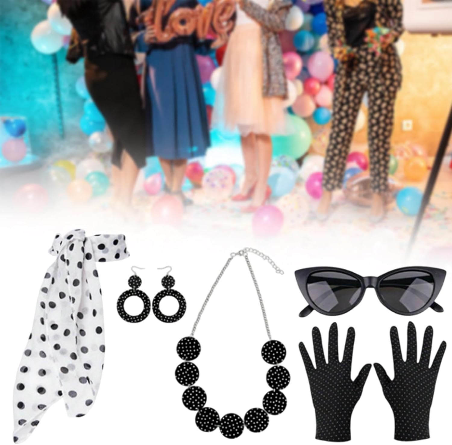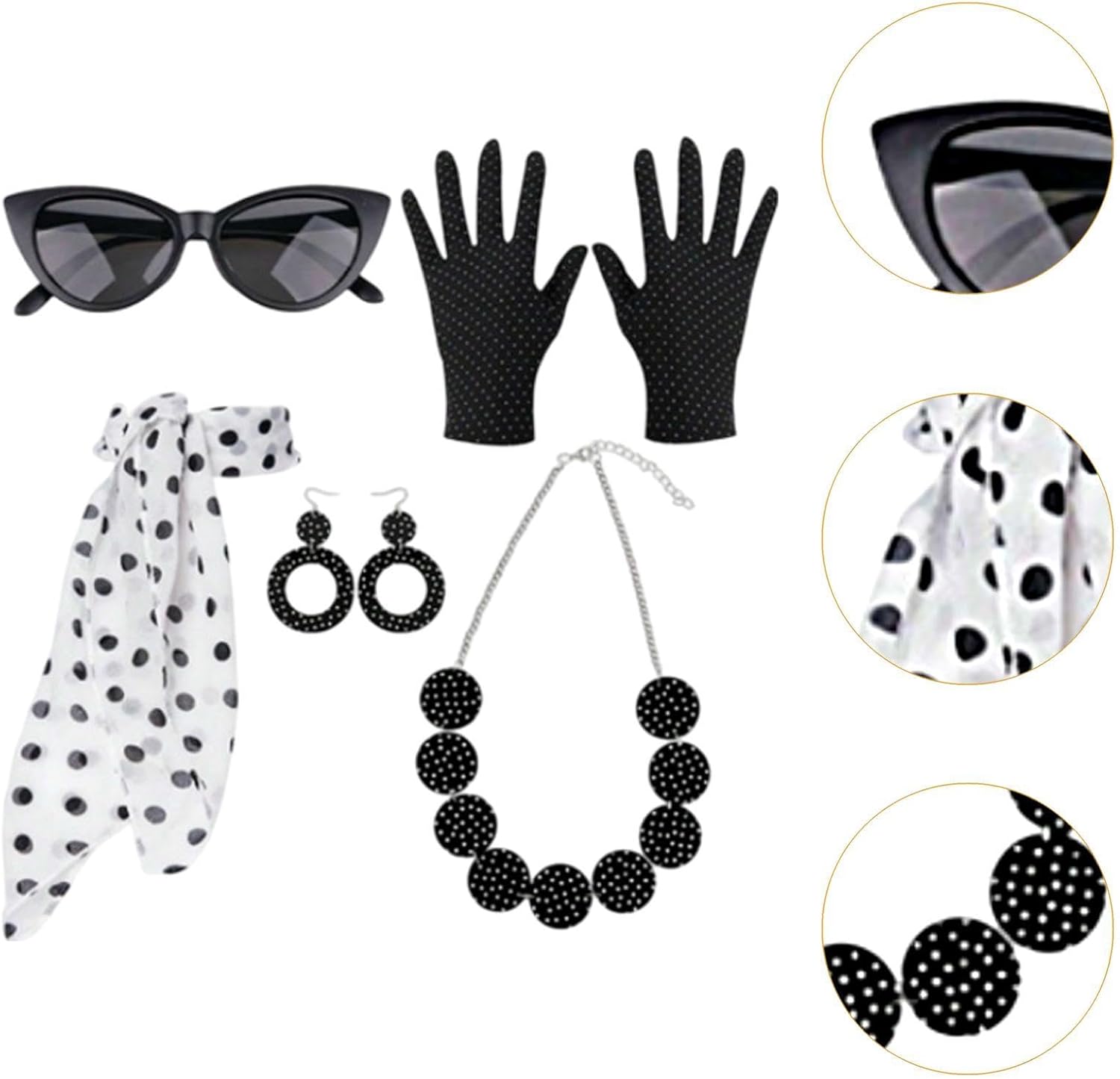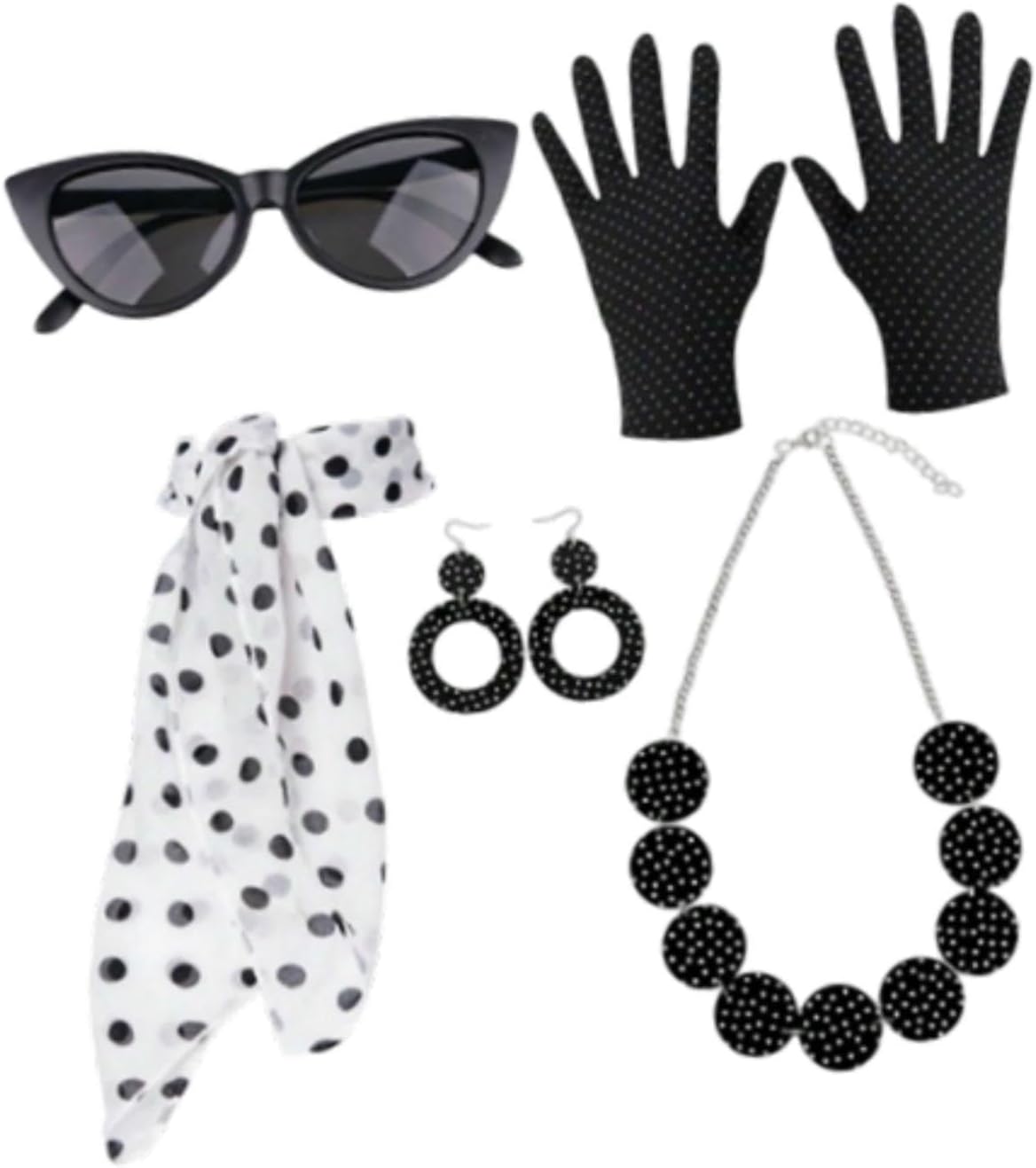 【Set di accessori per costumi】: questo set di accessori per costumi dal design retrò include sciarpa, guanti, orecchini, occhiali, pezzi essenziali per un look anni '50 【Materiali di qualità】: la sciarpa è realizzata in tessuto di alta qualità, morbido sulla pelle e comodo da indossare durante l'. Garantisce durata mantenendo un aspetto vintage 【 regalo】: caratterizzato da orecchini a pois in vero stile anni '50, questo set è un ottimo regalo per chiunque ami lo stile vintage o voglia aggiungere un tocco di stile retrò al proprio guardaroba 【Uso versatile】: ideale per feste di Halloween, eventi a tema anni '50, balli di fine anno, matrimoni e occasioni in maschera. Questi accessori per costumi da donna anni '50 sono ideali anche per celebrazioni speciali come compleanni o qualsiasi in cui si desidera distinguersi con un classico 【Adatto a tutte le età】: Progettati per adattarsi alle donne, questi accessori in stile retrò sono perfetti per chiunque desideri abbracciare il fascino degli anni '50 alle feste in maschera o agli incontri a tema