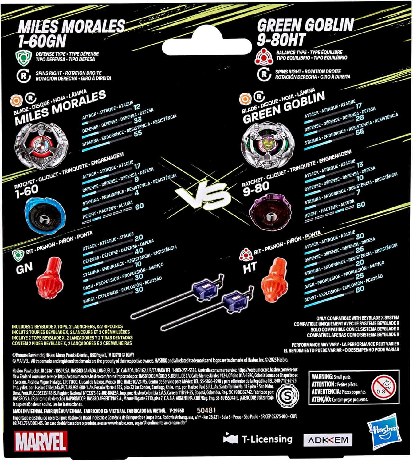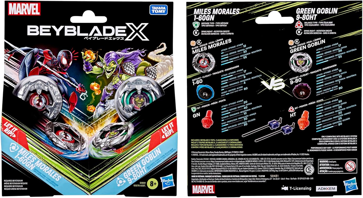 COLPISCI L'X-CELERATOR CON BEYBLADE X: questo gioco frenetico sfida gli aspiranti Beymaster a migliorare il loro gioco! Assembla le trottole, carica i lanciatori, 3-2-1, pronti... lancio (richiesto Beystadium Beyblade X, venduto separatamente) METTI IL TURBO CON L'X-CELERATOR GEAR SYSTEM: quando gli ingranaggi della punta e la guida X-Celerator si incontrano, le trottole raggiungono l'Xtreme Dash, producendo esplosioni mozzafiato e scontri epici (compatibile solo con Sistema Beyblade X) 3 PEZZI FACILI DA MONTARE: gli strati intercambiabili della lama, del cricchetto e della punta del Beyblade X si smontano e rimontano con una rapida rotazione e 2 clic, così che non dovrai mai esitare a lanciarti in battaglia MILES MORALES CONTRO GREEN GOBLIN: questi 2 personaggi Marvel si danno battaglia nel tuo Beystadium Beyblade X in questa collaborazione tra Marvel e le trottole Beyblade X SFRUTTA LA POTENZA: include 2 lanciatori e 2 trottole Beyblade X di Takara Tomy con rotazione a destra e parti in metallo pressofuso, ovvero il bey di difesa Miles Morales 1-60GN e il bey bilanciato Green Goblin 9-80HT