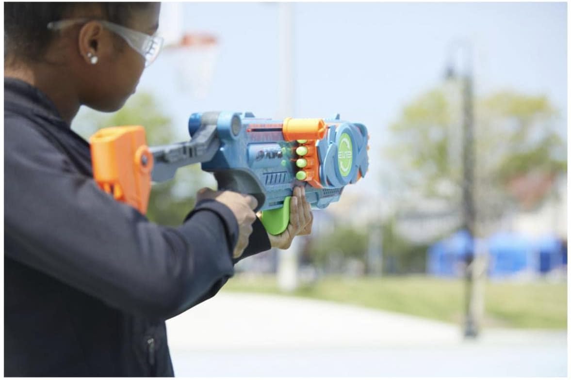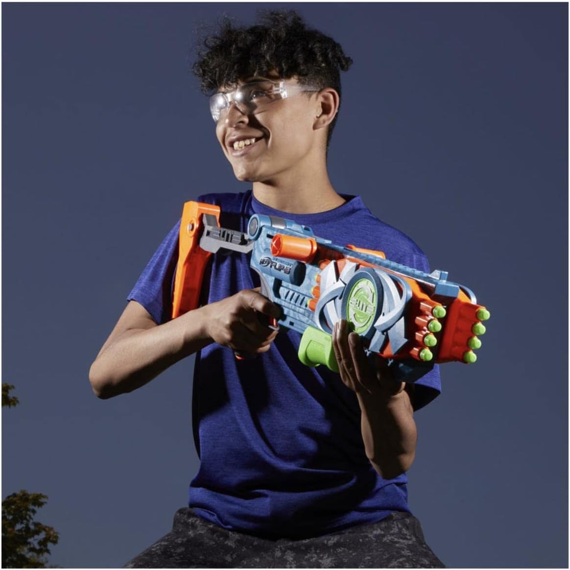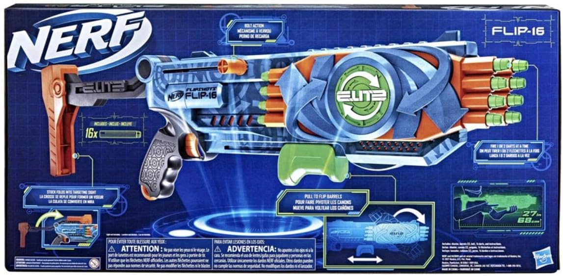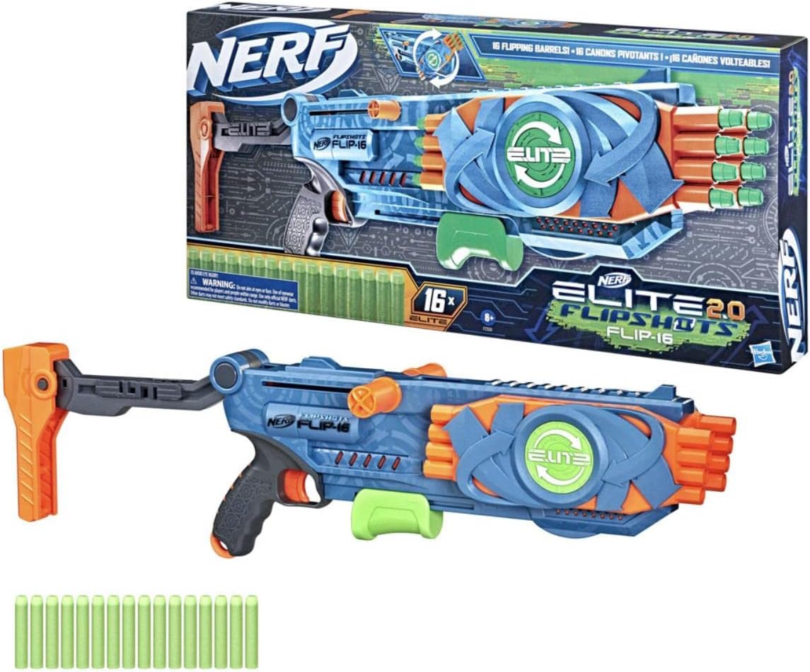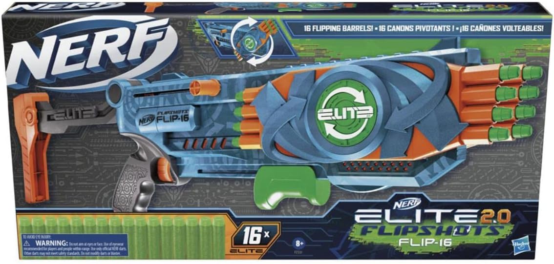 RIBALTA LE SORTI: il blaster Nerf Elite 2.0 Flipshots Flip-16 presenta 16 canne, 8 rivolte in avanti e 8 rivolte all'indietro. Lancia i dardi dalle 8 canne rivolte in avanti e poi ribalta in avanti le canne posteriori per continuare a lanciare CAPACITÀ DA 16 DARDI E 16 DARDI NERF: ogni canna può contenere 1 dardo, per una capacità totale di 16 dardi. Il blaster include 16 dardi originali Nerf Elite in gommapiuma per caricare tutte e 16 le canne TIRA LA MANIGLIA PER RIBALTARE LE CANNE: lancia 8 dardi di fila dalle canne rivolte in avanti, poi tira la maniglia per ribaltare le canne posteriori in avanti e sorprendere gli avversari con altri 8 dardi LANCIA 1 O 2 DARDI ALLA VOLTA: premi il grilletto per metà per lanciare 1 dardo oppure lancia 2 dardi insieme premendo il grilletto fino in fondo. Armamento tramite tiretto. Il calcio si solleva per creare un mirino CONFEZIONE SOSTENIBILE: venduto in una semplice confezione riciclabile, facile da aprire per giocarci immediatamente