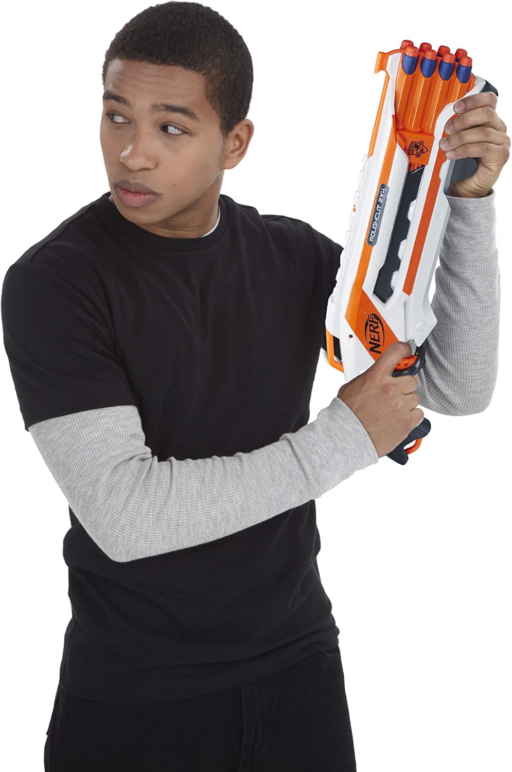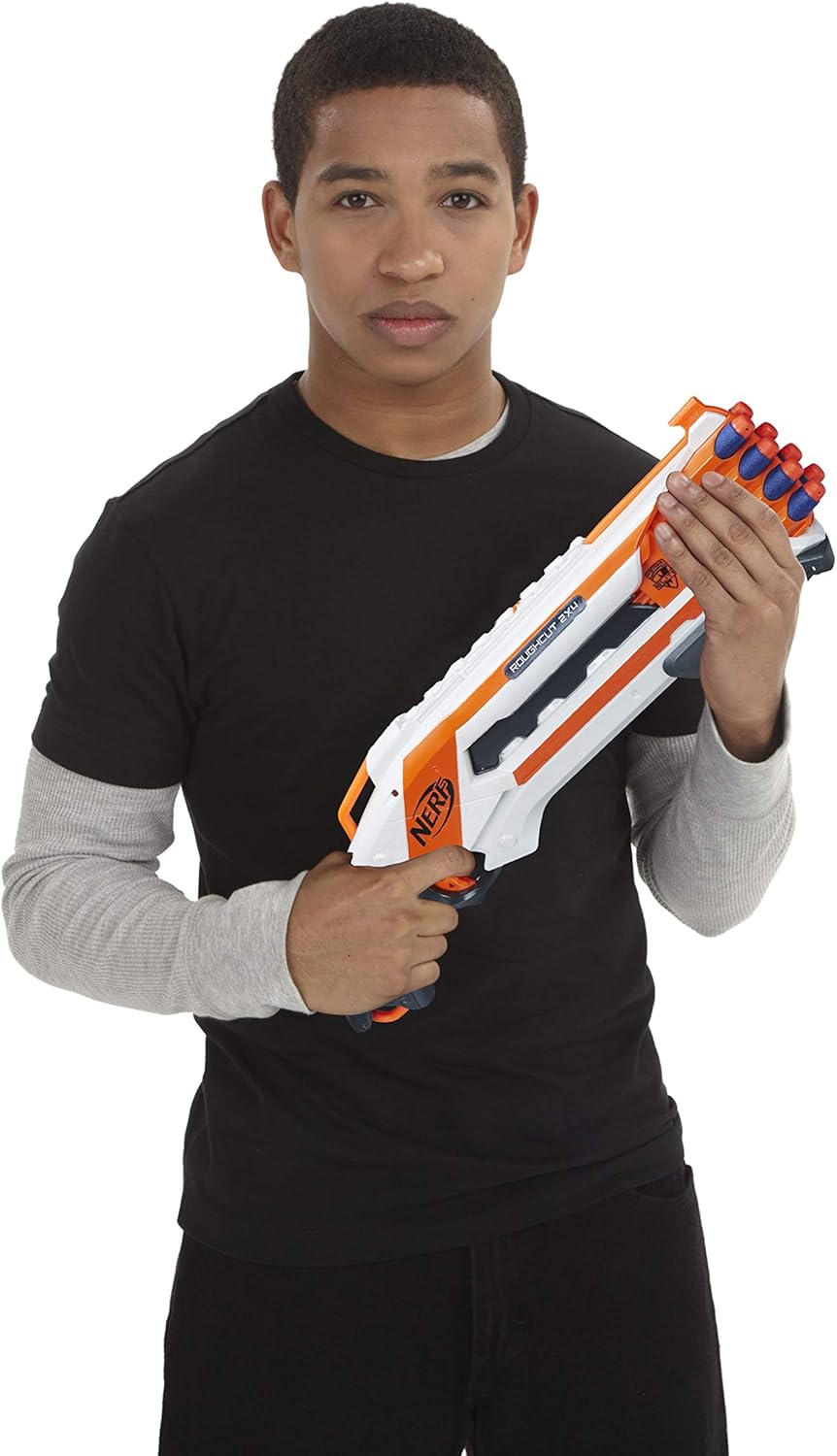 Spara 2 dardi alla volta Meccanismo per sparare rapidamente con sistema di ripetizione a pompa Spara 8 dardi senza bisogno di ricaricare Viene fornito con 8 dardi Elite Spara fino a una distanza di 26 metri