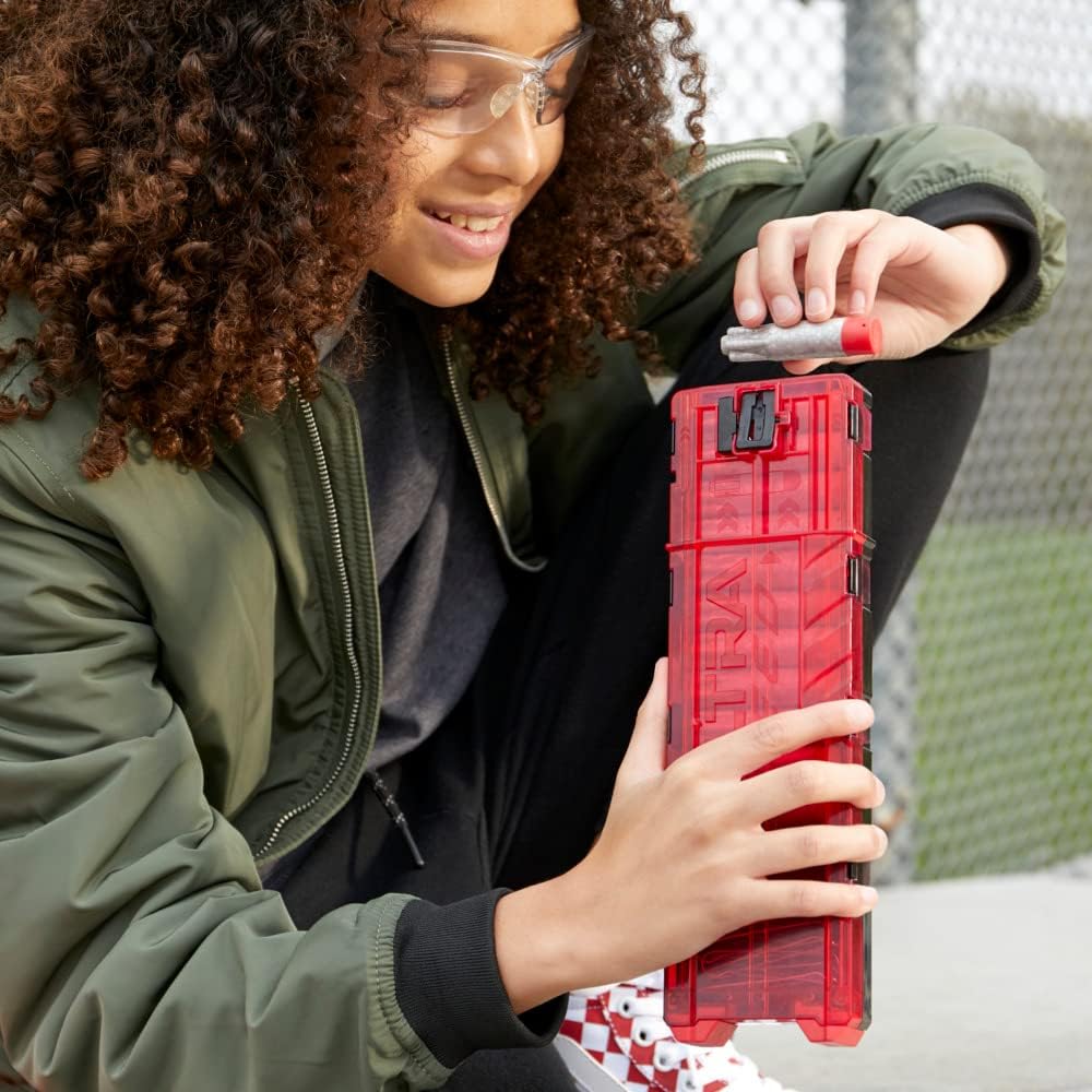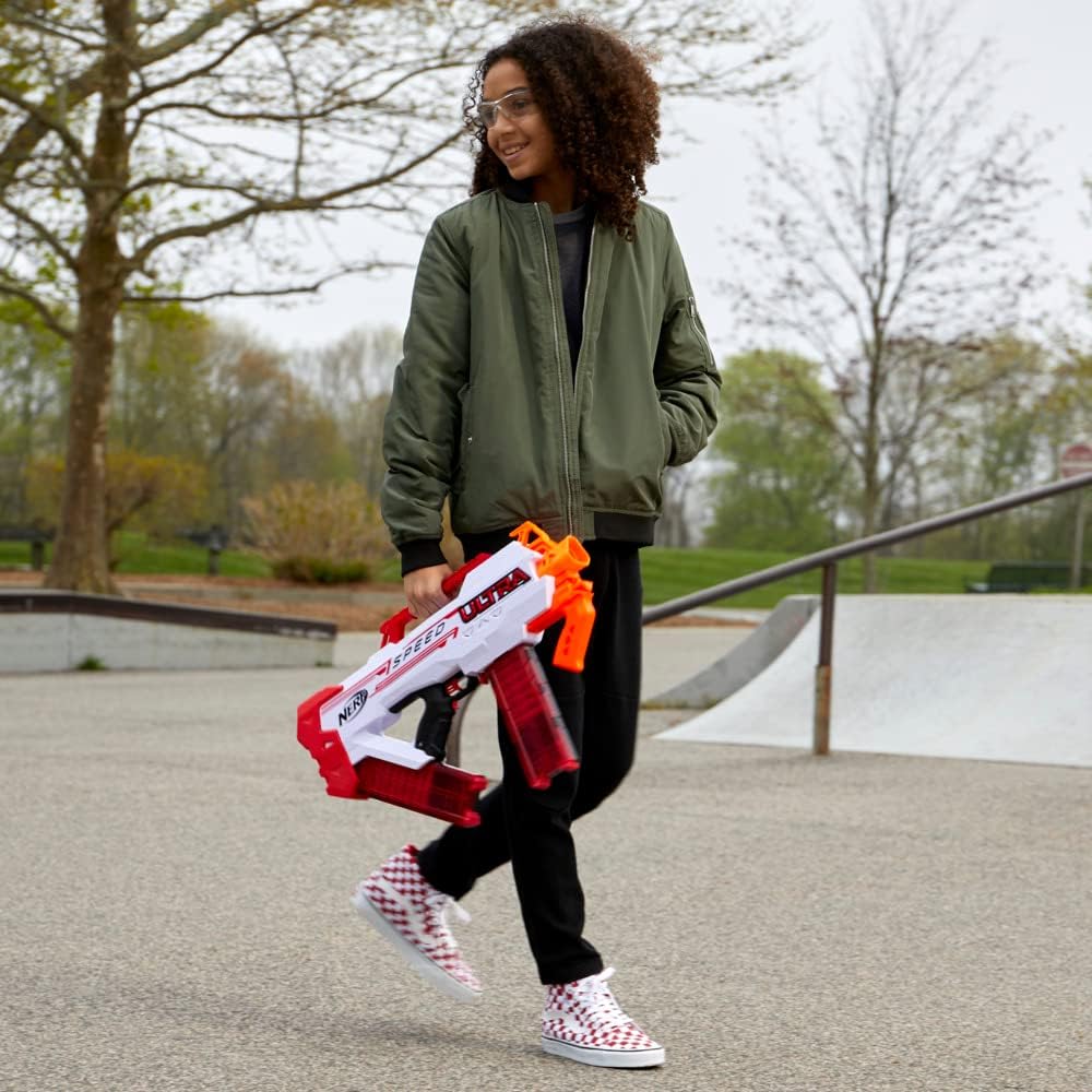 BLASTER NERF ULTRA CON VELOCITÀ DI LANCIO MAGGIORE: il blaster Nerf Ultra Speed lancia 7 dardi al secondo grazie al lancio dei dardi completamente motorizzato Sono necessarie 6 batterie alcaline di tipo C da 1,5 V (non incluse) CARICATORE A CLIP: lancia una velocissima pioggia di dardi con il caricatore a clip Contiene 2 caricatori da 12 dardi. Caricatori non compatibili con altri blaster Nerf Ultra. Blaster non compatibile con altri caricatori Nerf Ultra POTENZIATI E INIZIA A LANCIARE: carica il caricatore nel blaster, tieni premuto il pulsante d'accelerazione per potenziare il motore e premi il grilletto per lanciare velocemente tutti i dardi I DARDI NERF ULTRA PIà PRECISI: contiene 24 dardi Nerf AccuStrike Ultra, i dardi Nerf Ultra più precisi. Blaster compatibile solo con i dardi Nerf Ultra IMPUGNATURA SGANCIABILE E IMPUGNATURA DA TRASPORTO: stabilizza il tuo veloce lancio di dardi grazie all'impugnatura sganciabile. Usa l'impugnatura da trasporto integrata per portare comodamente il blaster a ogni battaglia Nerf