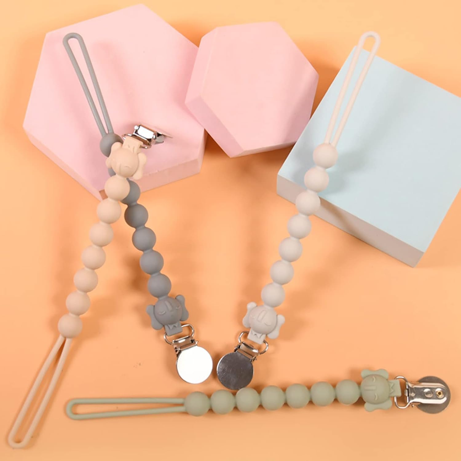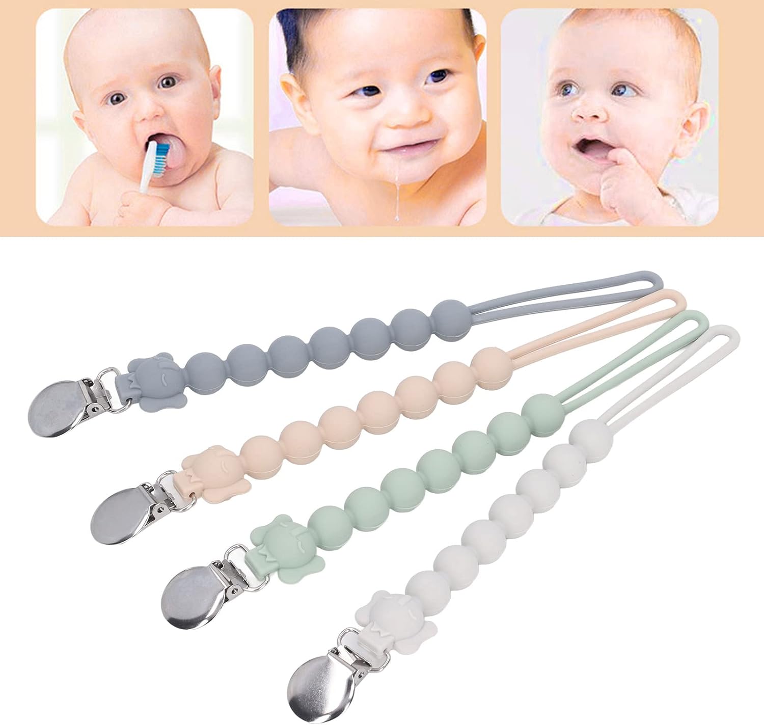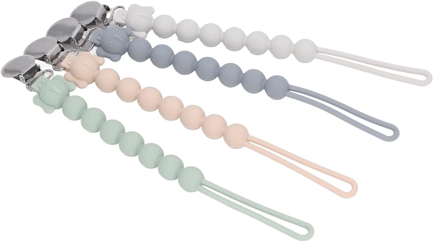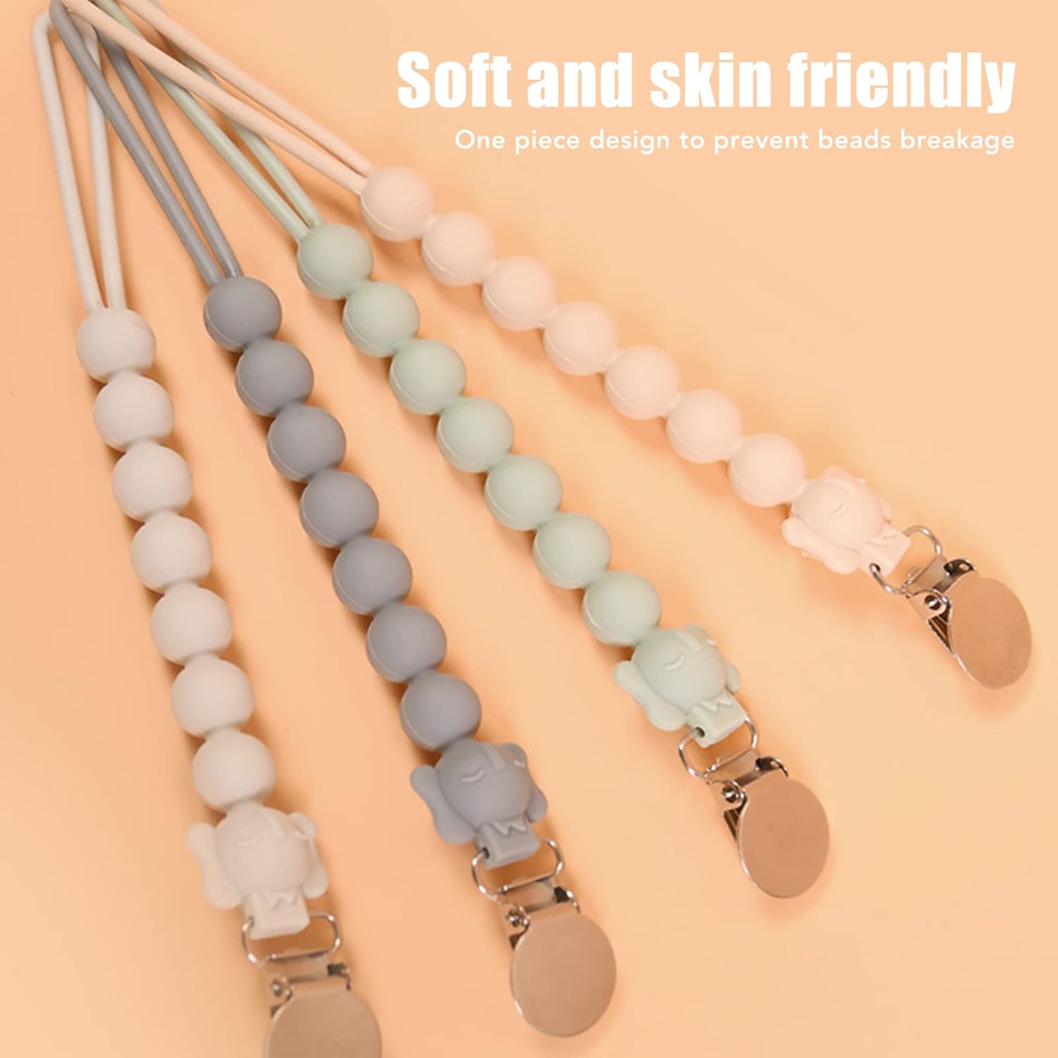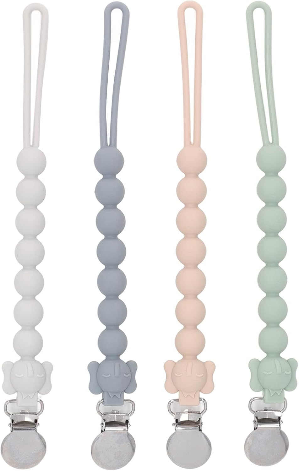 Set da 4 pezzi sicuro e durevole --- Questo set di catenelle per ciuccio da 4 pezzi è realizzato al 100% in silicone morbido e delicato sulla pelle ed è delicato sulla pelle sensibile del tuo bambino. Il design monopezzo e senza giunture elimina il rischio di rottura del tallone e garantisce una lunga durata. Poiché queste clip non contengono sostanze chimiche nocive, sono un'aggiunta sicura, pratica ed elegante agli accessori indispensabili del tuo bambino. Presa forte e sicura --- Questa clip per ciuccio è dotata di un morsetto solido ma delicato e tiene saldamente in posizione ciucci, massaggiagengive e coperte. La robusta struttura in silicone previene cadute accidentali e garantisce che le cose più importanti del tuo bambino rimangano sempre a portata di mano. La sua vestibilità universale si adatta alla maggior parte dei tipi di succhietto e fornisce prestazioni affidabili quando utilizzato. Lunghezza appropriata e uso versatile: la catenella per ciuccio è lunga 9,4 pollici e offre una portata sufficiente per attaccarla a vestiti, coperte, passeggini o borse per pannolini. Il suo design regolabile assicura che il ciuccio rimanga sempre a portata di mano mantenendolo pulito e lontano dal bambino. A casa o in viaggio, questo morsetto/supporto offre praticità ed è adatto a genitori impegnati e bambini attivi. Adorabile design a forma di elefante e colori accattivanti - Caratterizzato da un'adorabile testa di elefante su una collana di perle, questo fermaciuccio in silicone attirerà l'attenzione del tuo bambino con il suo design giocoso e colorato. Disponibili in bianco, grigio, verde e rosa, le tonalità vivaci aggiungono un tocco divertente alle cose più importanti del tuo bambino, tenendolo occupato e divertito. Facili da pulire e igieniche: queste clip per ciuccio in silicone sono facilmente lavabili a mano: basta pulirle con salviette per ciuccio o risciacquare con acqua tiepida. La superficie liscia e non porosa previene gli accumuli, garantendo un'esperienza sicura e pulita per il tuo bambino. Dopo il lavaggio, lasciarli asciugare rapidamente all'aria per un riutilizzo immediato, rendendo difficile la manutenzione.