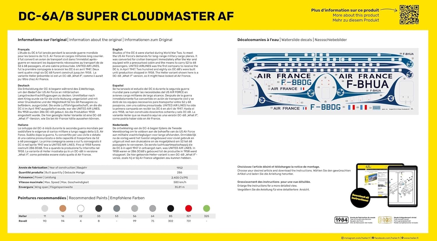 Heller - 1/72 STARTER KIT DC6 SUPER CLOUDMASTER AF (6/23) *( 3279510563153) proviene daHeller. Categoria - Kit per modellismo, Numero di pezzi: , Difficoltà: , Tipo di prodotto: Aviazione, Sottotipo: Elica, Scala: 1:72, Colour, Dimensioni -250x70x450 | Manuali per modelli e giocattoli | Giocattoli da costruzione | Hobby e giocattoli creativi | Modellazione di giocattoli | Kit modellazione | Modelli in scala per bambini