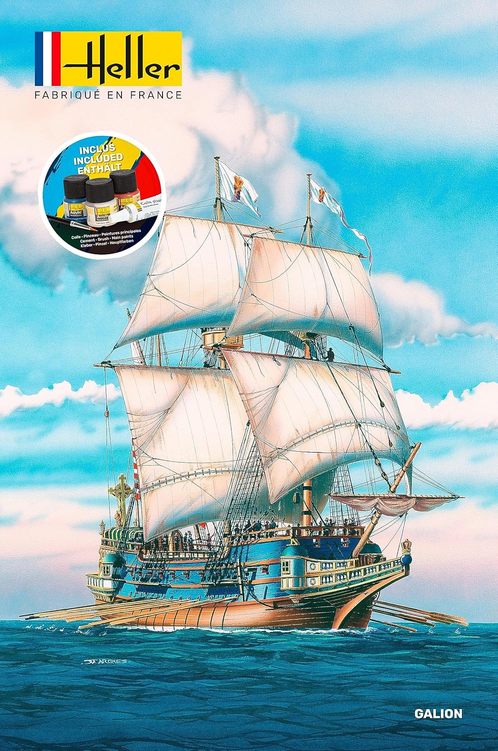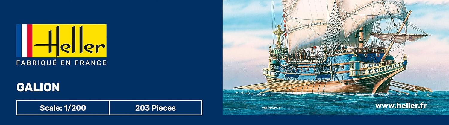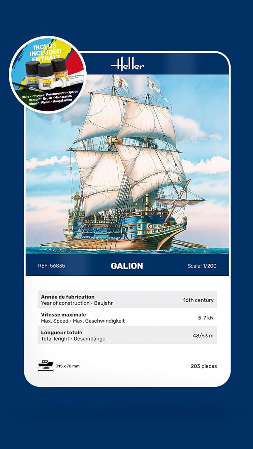 La ricostituzione del "Galeone spagnolo" presentata da Heller è stata possibile grazie a vari documenti storici dell'epoca; i galeoni erano grandi navi da carico utilizzate dagli spagnoli, principalmente per trasportare oro e altre merci dal Sud America e dal Messico, durante il regno di Carlo Quinto Scala: 1:200 Confezione: 250 x 375 x 70 mm