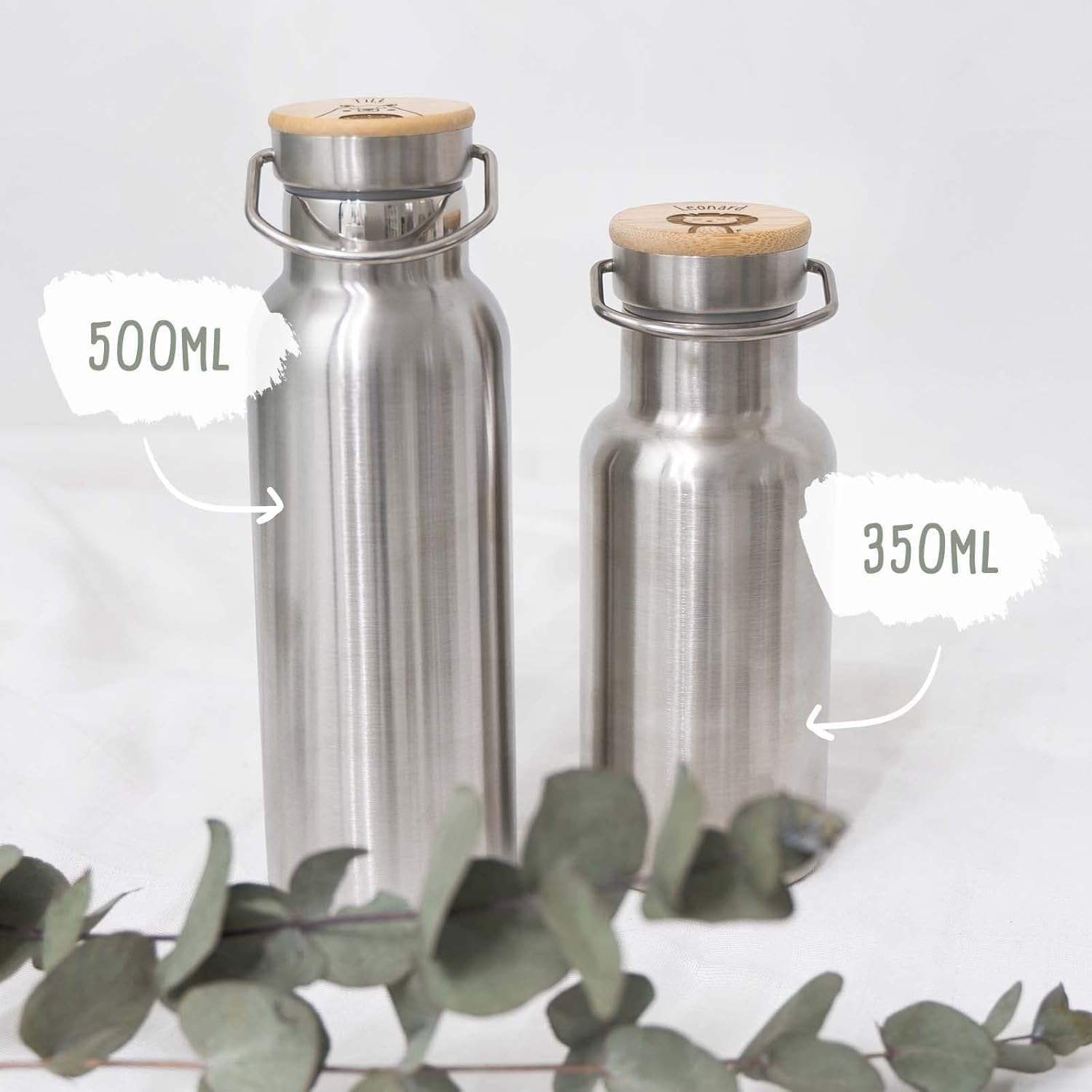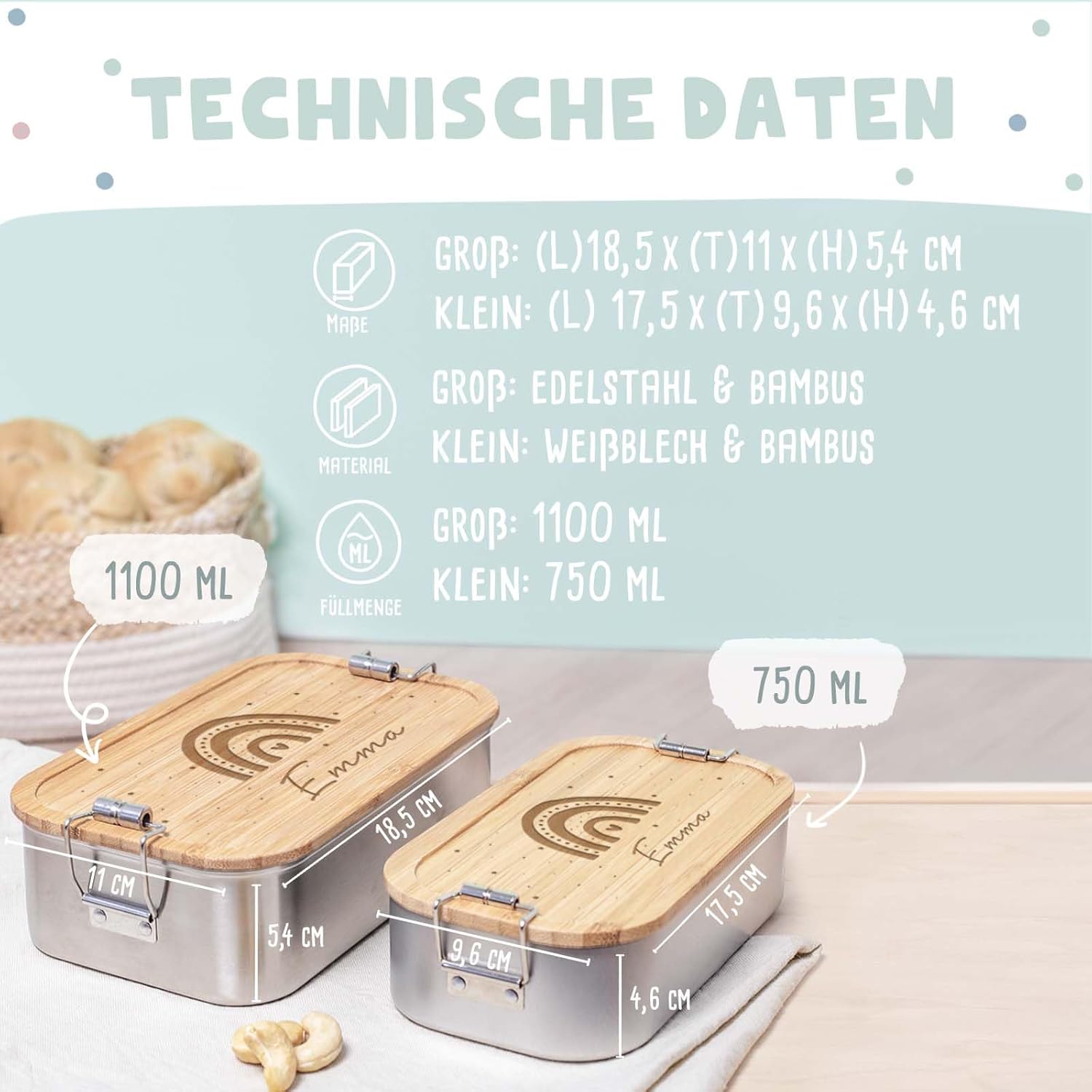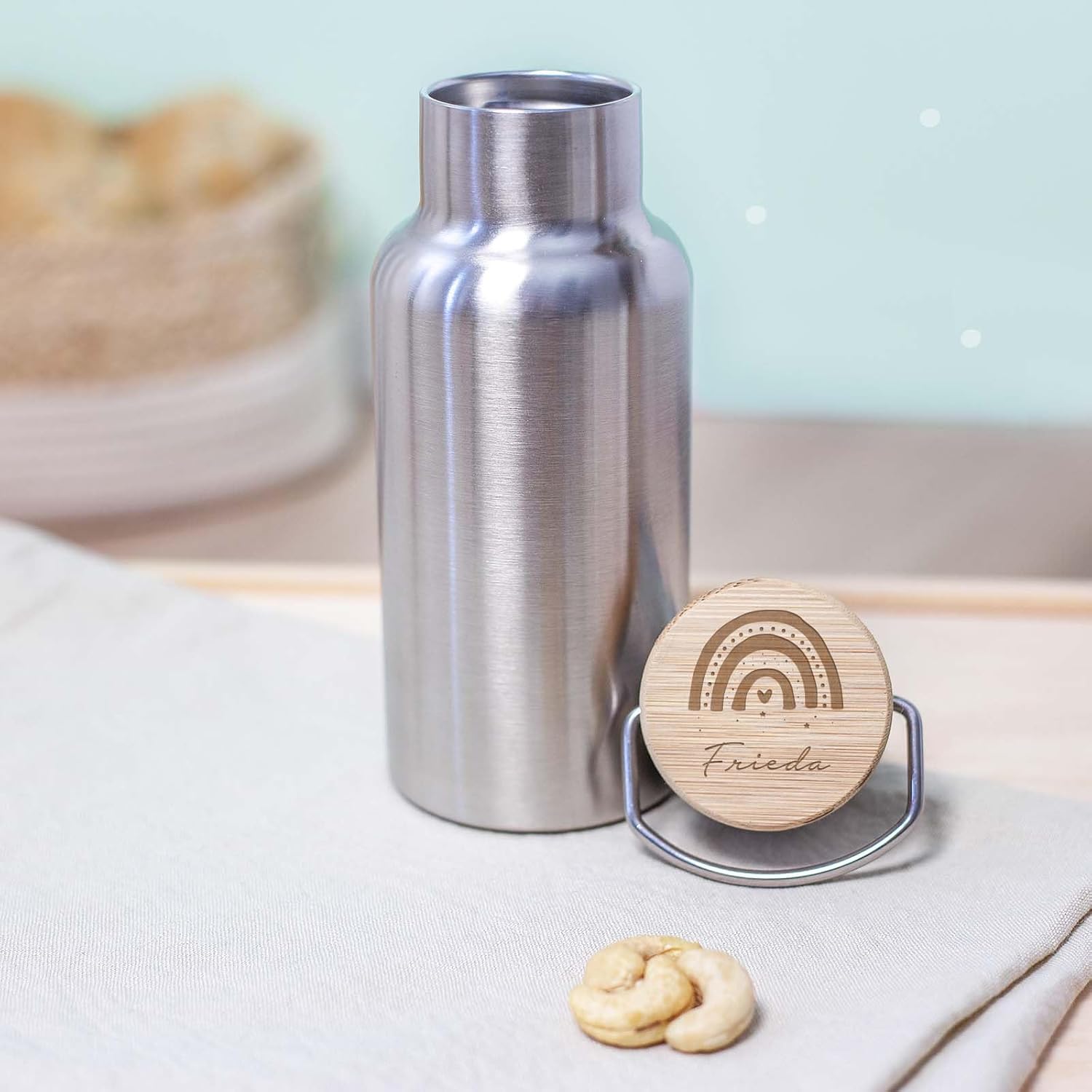Regali personalizzati per bambini: contenitore per il pranzo e borraccia per la scuola, i compleanni, Natale, Pasqua, borraccia/borraccia termica in acciaio inox con coperchio in bambù (350 ml o 500 ml); Lattina in banda stagnata da 750 ml o in acciaio inox da 1100 ml con coperchio in bambù
