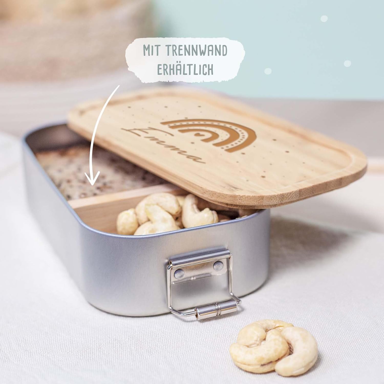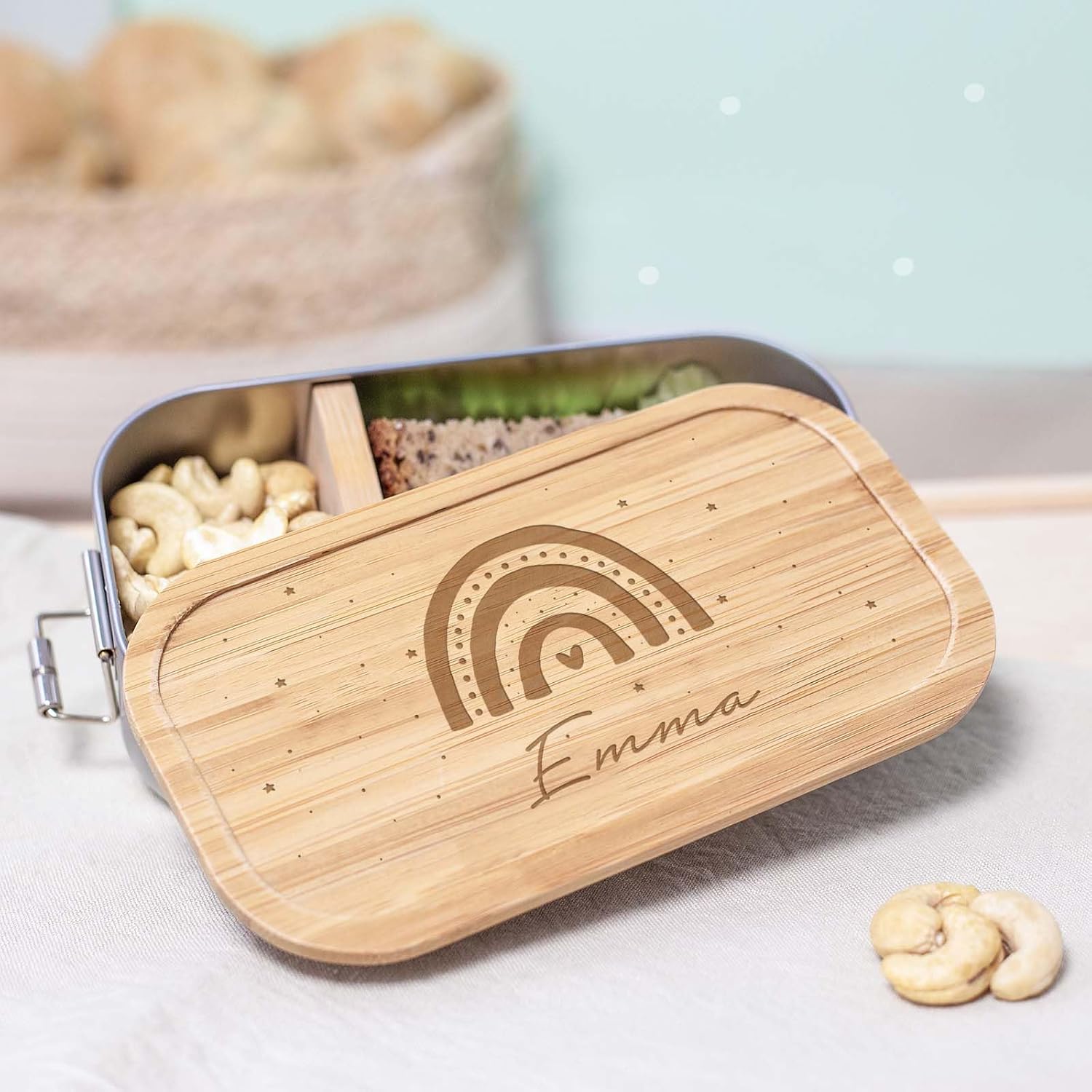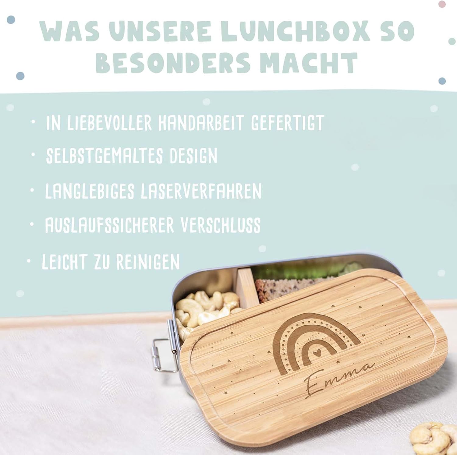 Regali personalizzati per bambini: contenitore per il pranzo e borraccia per la scuola, i compleanni, Natale, Pasqua, borraccia/borraccia termica in acciaio inox con coperchio in bambù (350 ml o 500 ml); Lattina in banda stagnata da 750 ml o in acciaio inox da 1100 ml con coperchio in bambù